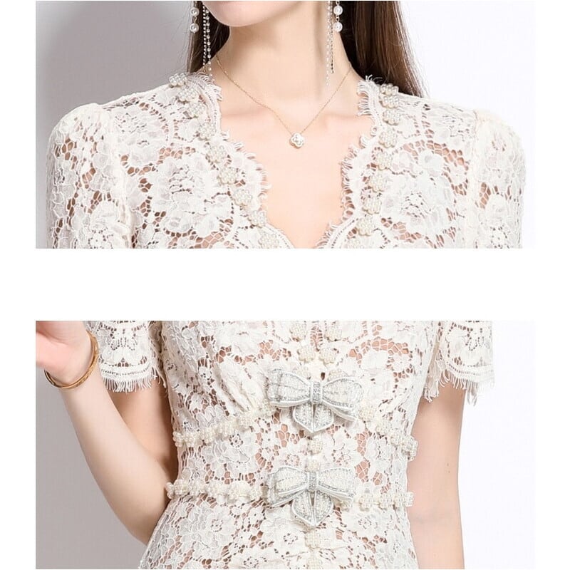 繊細な総レース仕立てが魅力的な半袖のドレスです。Vネックや裾のスカラップがセクシーで、ハイウエストのパールとリボンがアクセントになった個性的なデザインです。タイトなシルエットが魅力的で、レースの透け感をいかした配色が大人かわいい印象を与えます。特別な日のコーディネートからデイリー使いまで幅広く活躍する一着です。