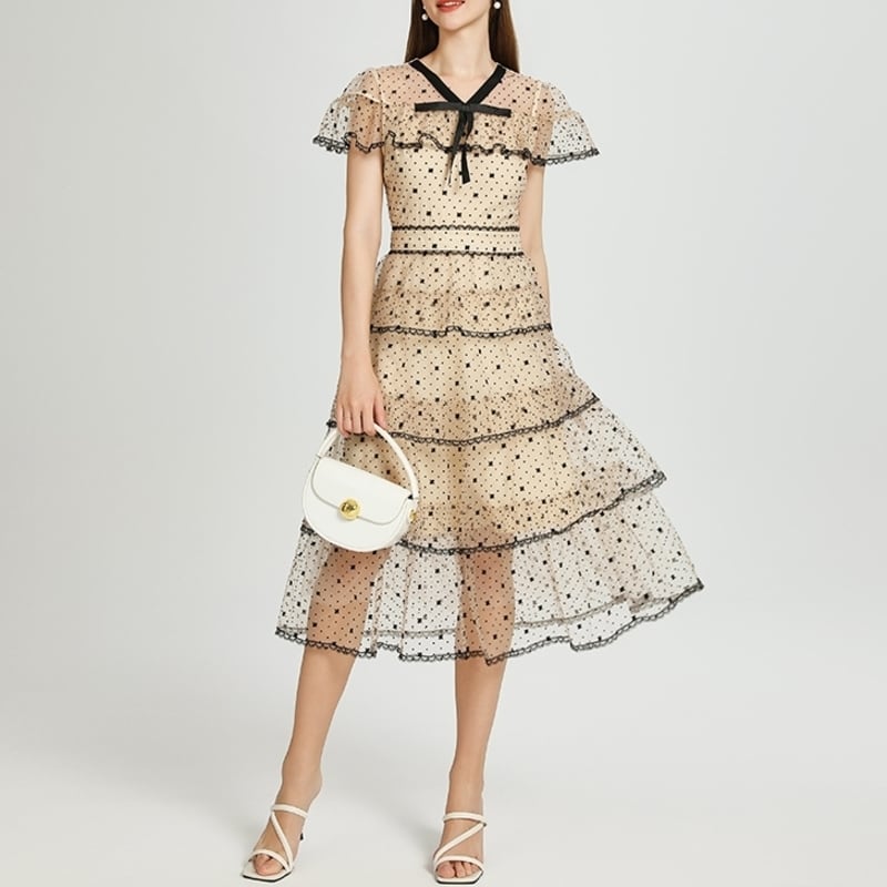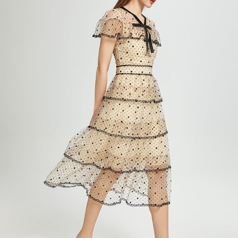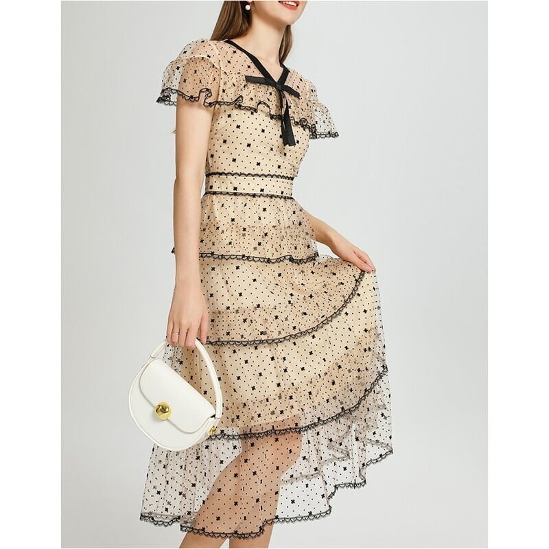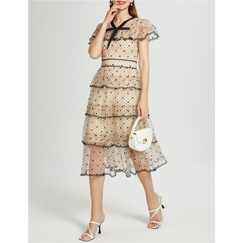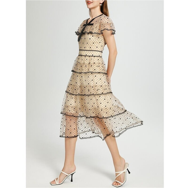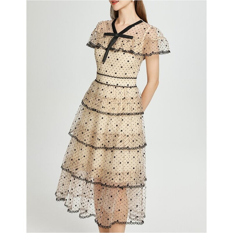 リボンとプチドットパターンがガーリーなティアードスカートドレスです。ブラックのボウタイが可愛らしい印象を演出し、普段使いから特別な日のコーディネートまで幅広く活躍する一着です。デコルテや裾のチュールの透け感がセクシーで、ミモレ着丈は体型を自然にカバーしてくれます。