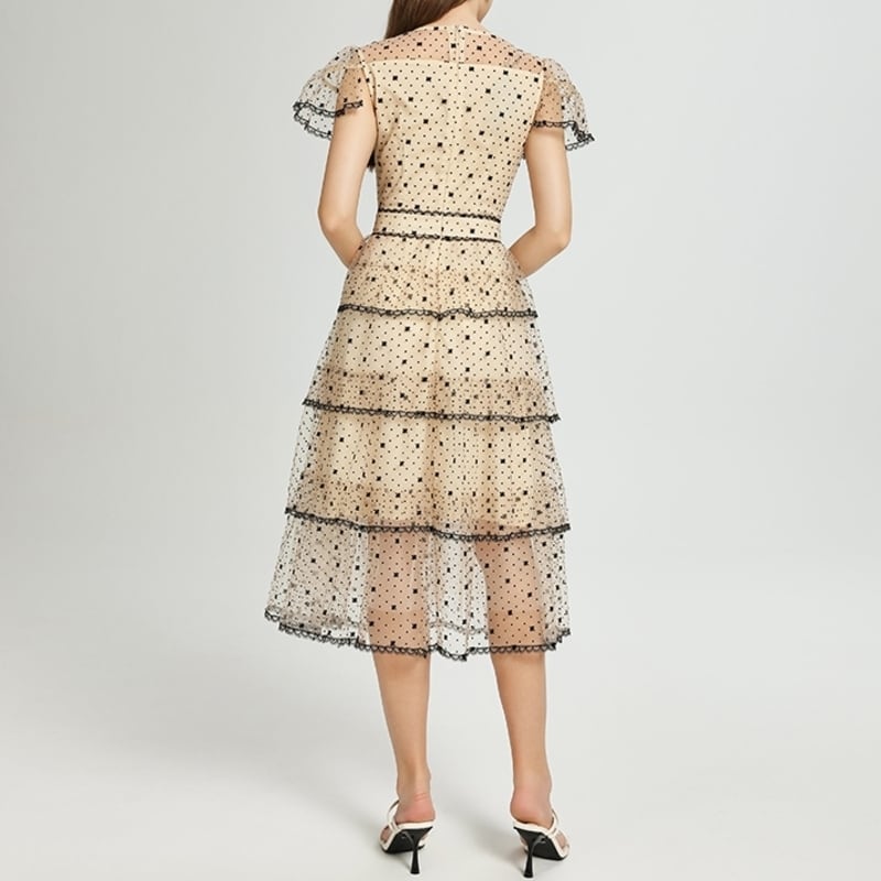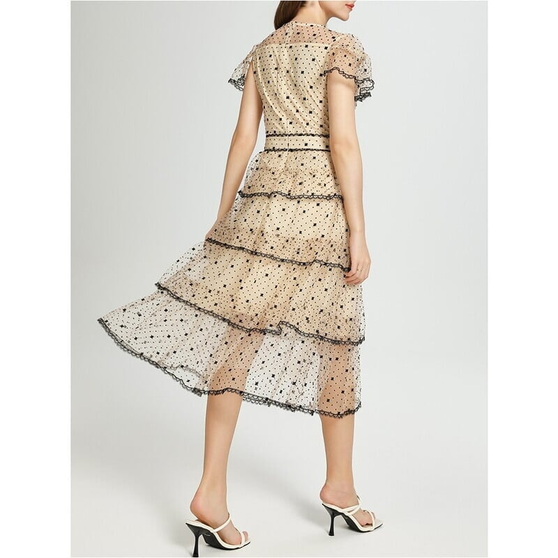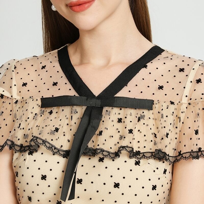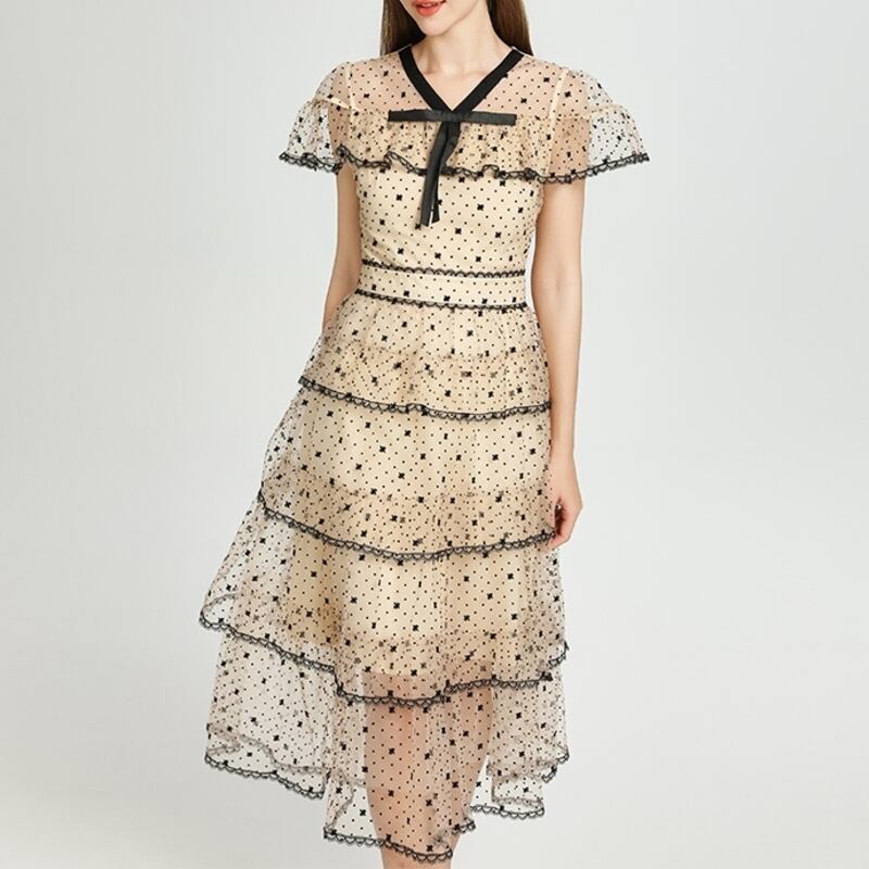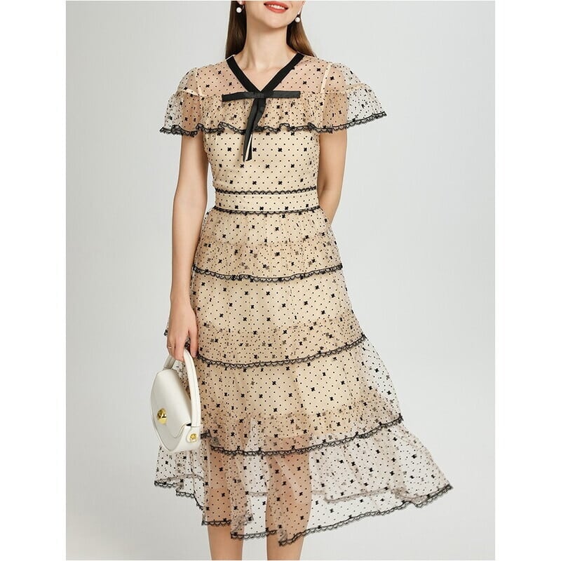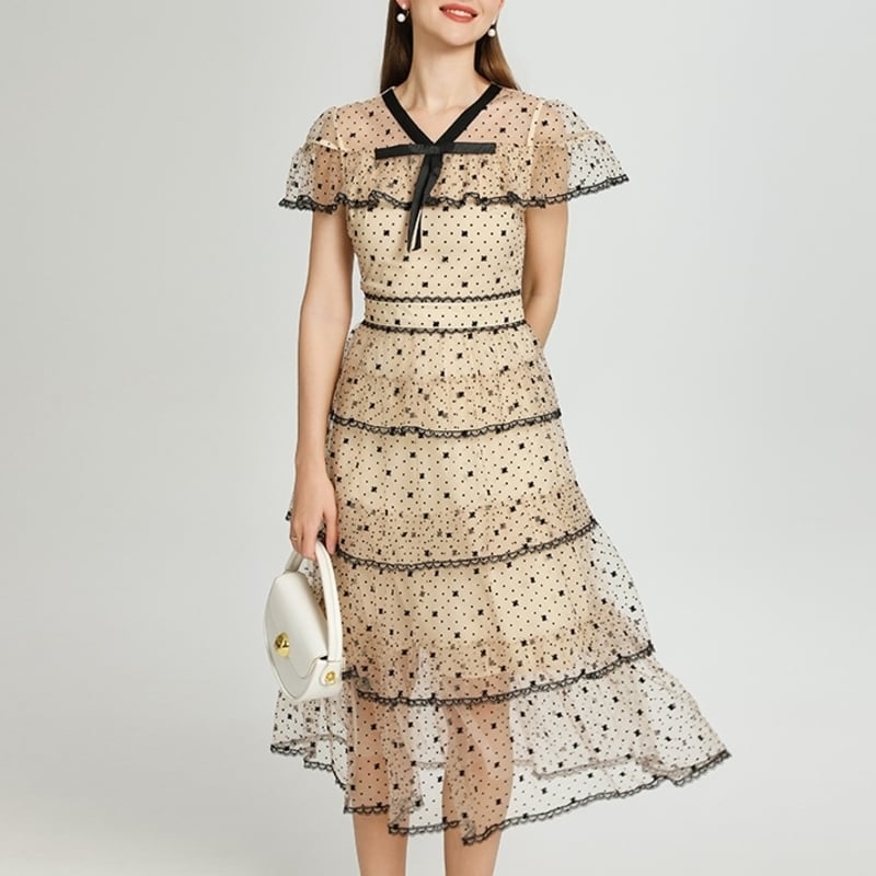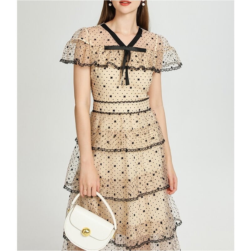 リボンとプチドットパターンがガーリーなティアードスカートドレスです。ブラックのボウタイが可愛らしい印象を演出し、普段使いから特別な日のコーディネートまで幅広く活躍する一着です。デコルテや裾のチュールの透け感がセクシーで、ミモレ着丈は体型を自然にカバーしてくれます。