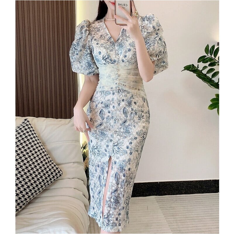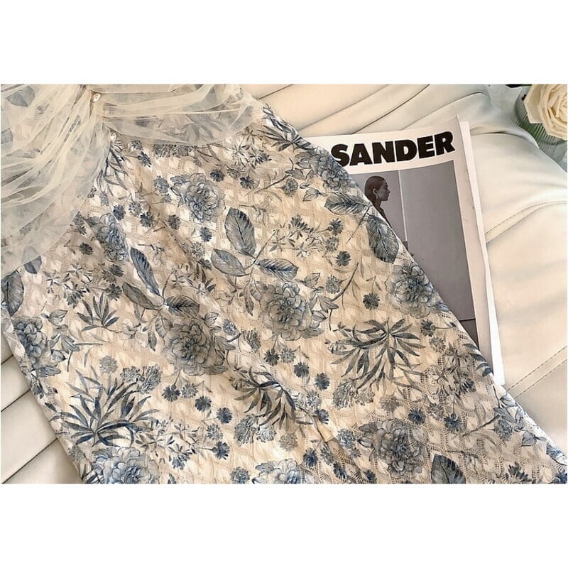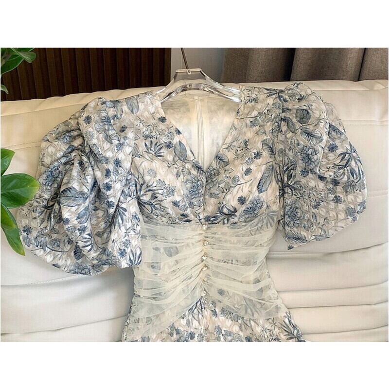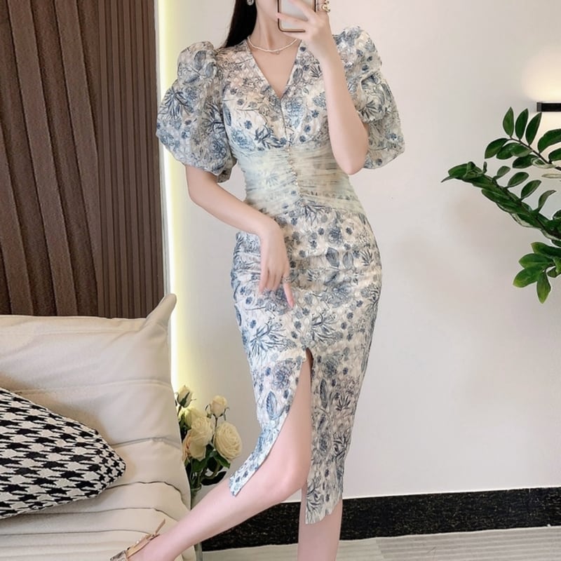繊細なチェックパターンの花柄生地仕立てが魅力的なバルーンスリーブのドレスです。Vネックやウエストに寄せたチュールが目を引き、ハイウエストのビジューがアクセントになった個性的なデザインです。タイトなシルエットが魅力的で、生地の透け感をいかした配色が大人かわいい印象を与えます。特別な日のコーディネートからデイリー使いまで幅広く活躍する一着です。