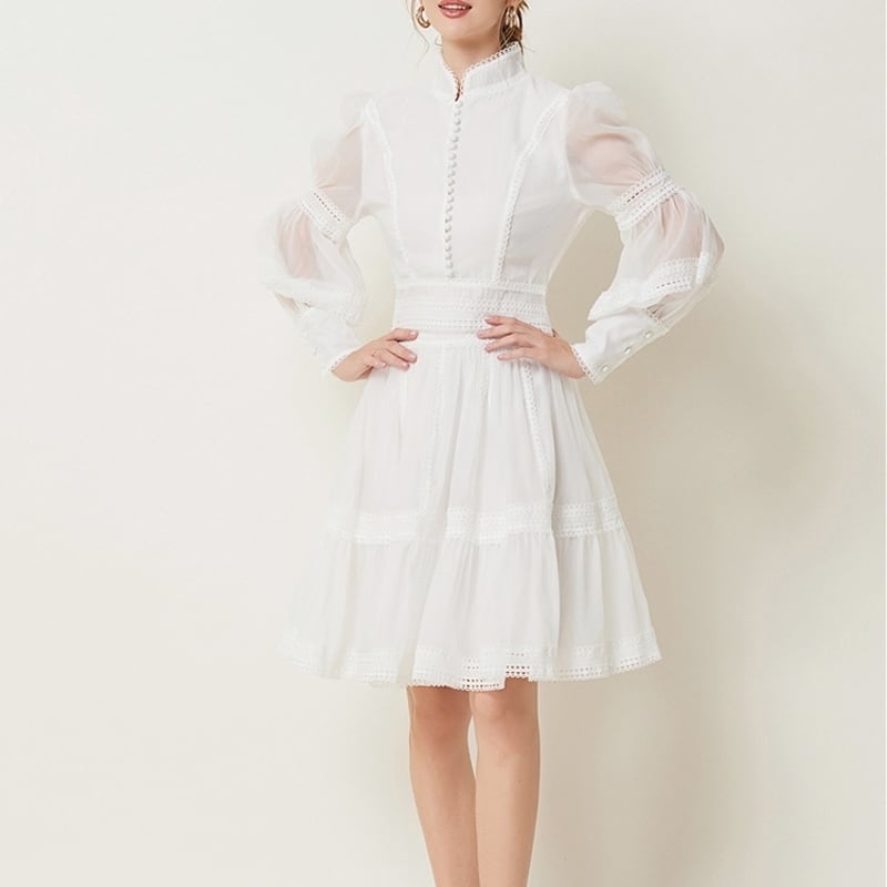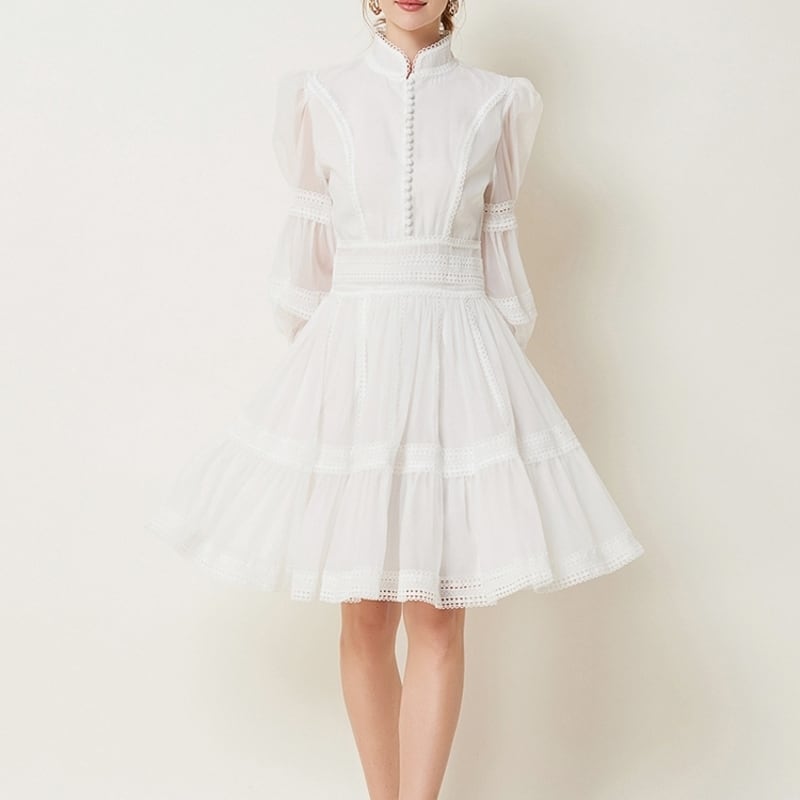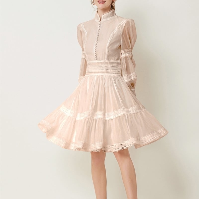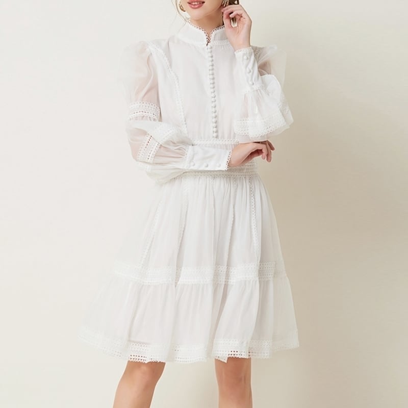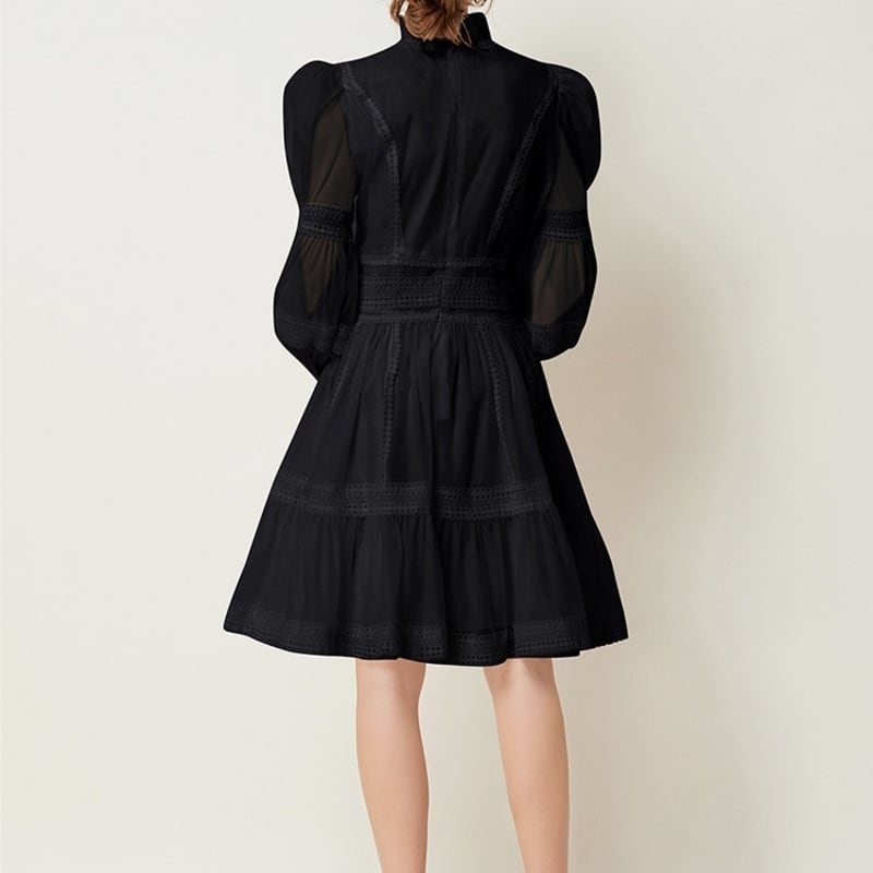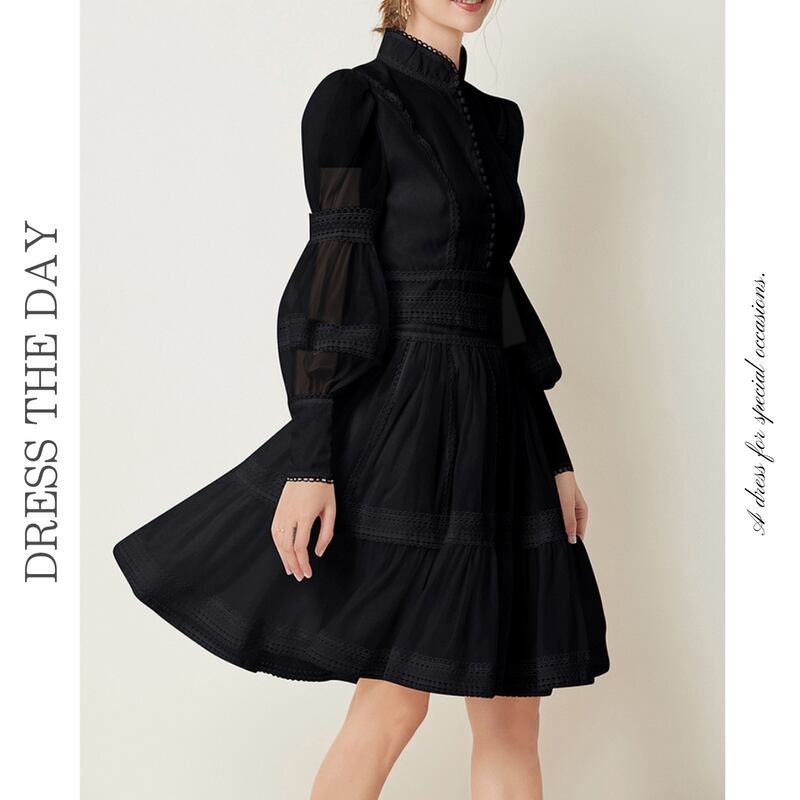 繊細なレース切り替えデザインが目を引くスタンドカラーのパワーショルダーフレアドレスです。ワントーンがシンプルな仕立てで、ハイウエストとワイドなボリューム感のスカートがエレガントな雰囲気を演出します。普段使いから特別な日のコーディネートまで幅広く対応できる一着で、どんなシーンでもあなたを引き立てる存在感を発揮します。