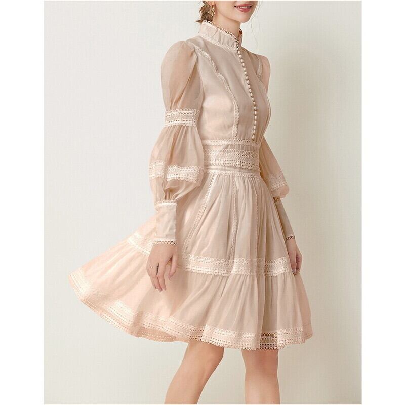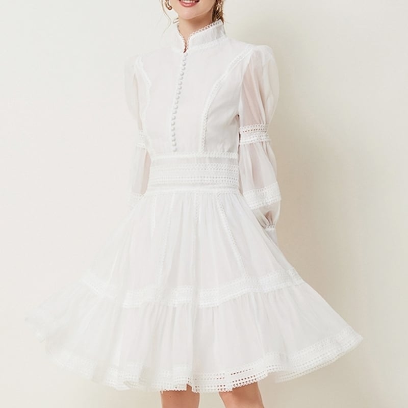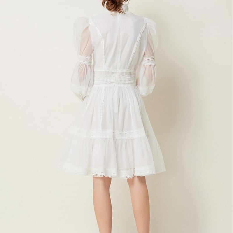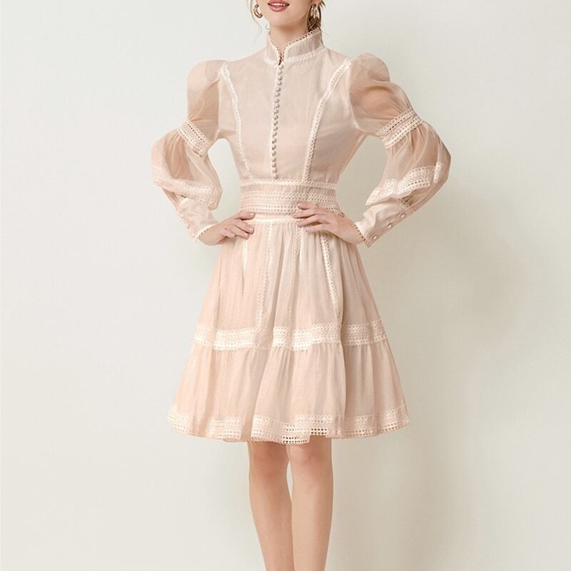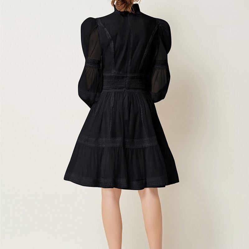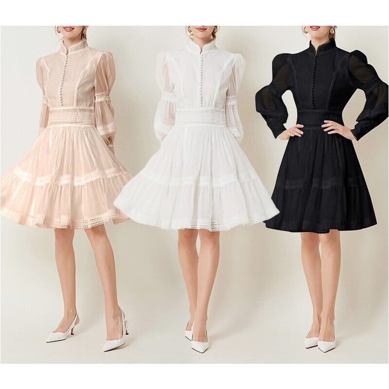 繊細なレース切り替えデザインが目を引くスタンドカラーのパワーショルダーフレアドレスです。ワントーンがシンプルな仕立てで、ハイウエストとワイドなボリューム感のスカートがエレガントな雰囲気を演出します。普段使いから特別な日のコーディネートまで幅広く対応できる一着で、どんなシーンでもあなたを引き立てる存在感を発揮します。