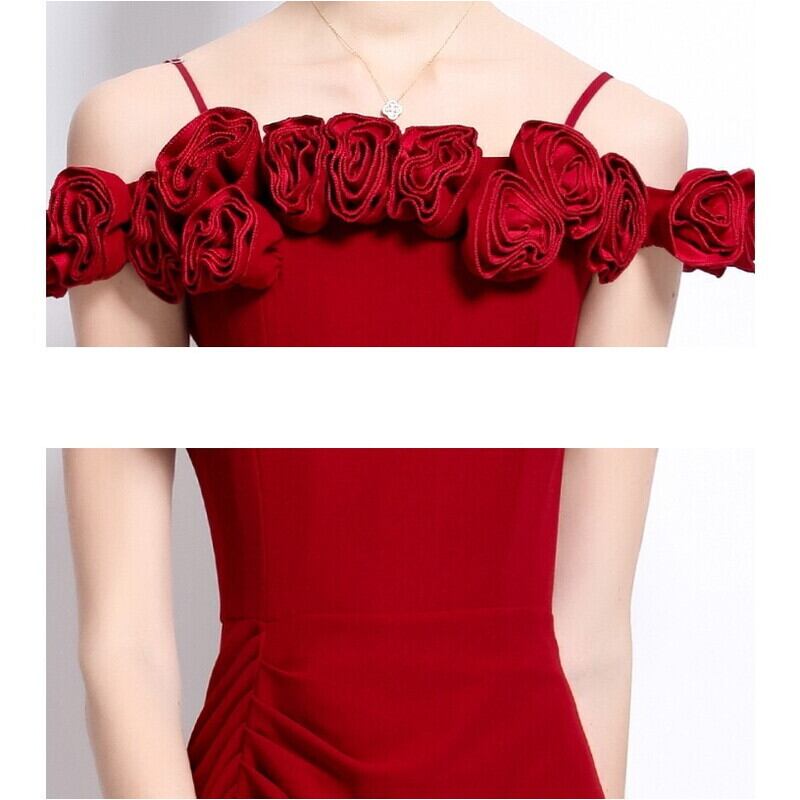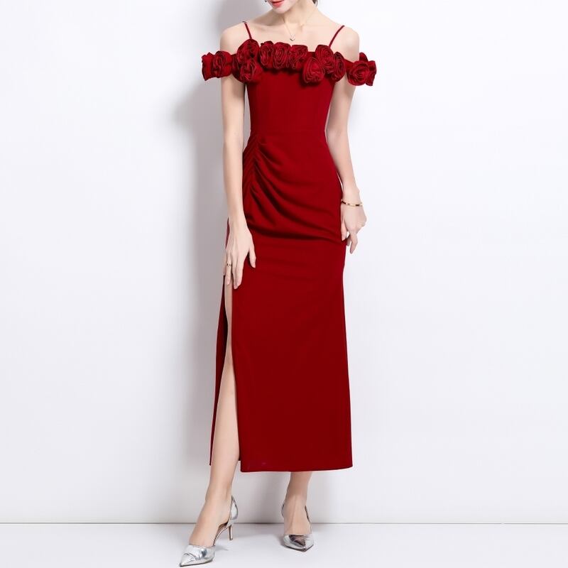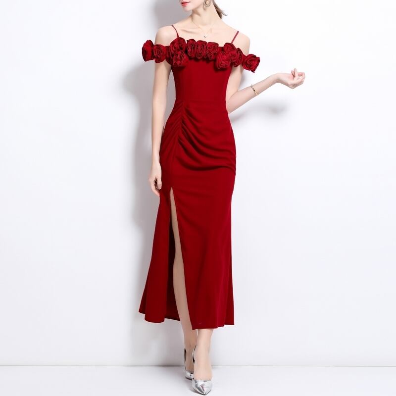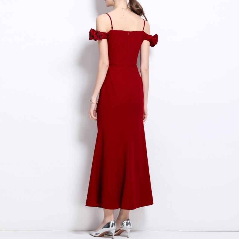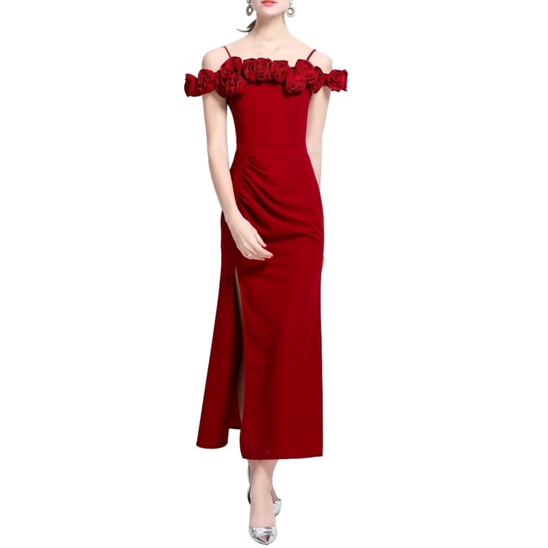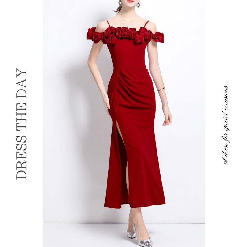 フラワーモチーフをあしらったデコルテが華やかなオフショル風キャミドレスです。大胆なサイドスリットが、特別な日のコーディネートに華やかさを添えます。オフショルダー風デザインがセクシーな印象を演出しており、女性らしいシルエットを引き立てます。繊細なサイドのギャザーでふんわりとしたドレープ感を演出する印象的なデザインです。