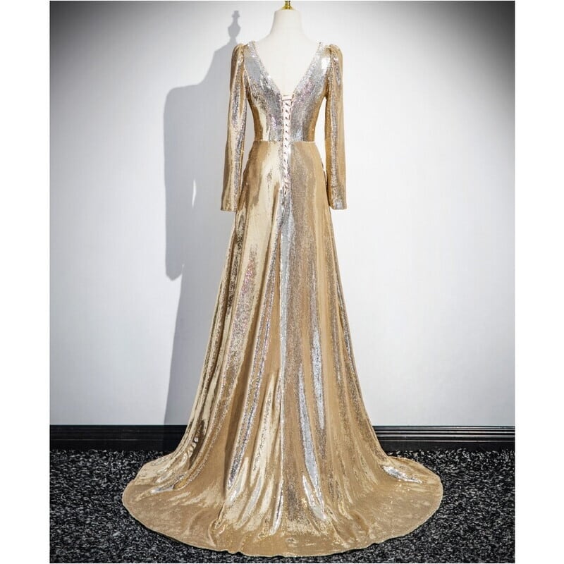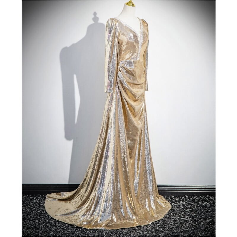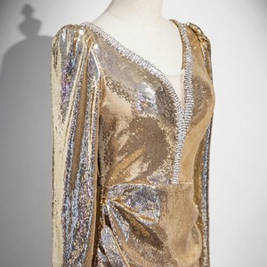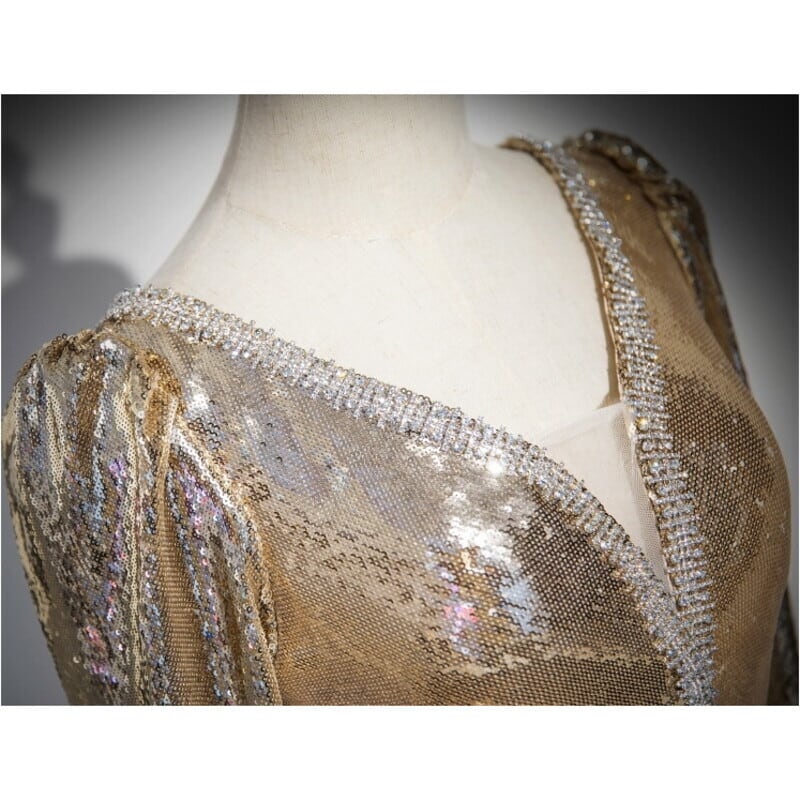 メタリックなゴールドで仕立てたドレープ感がクラシカルなマキシ丈ドレスです。パワーショルダーとVネック風のデコルテデザインが洗練されており、ビジューがきらめくエレガントな雰囲気を演出します。特別な日のコーディネートに最適な一着で、どんなシーンでもあなたを引き立てる存在感を発揮します。