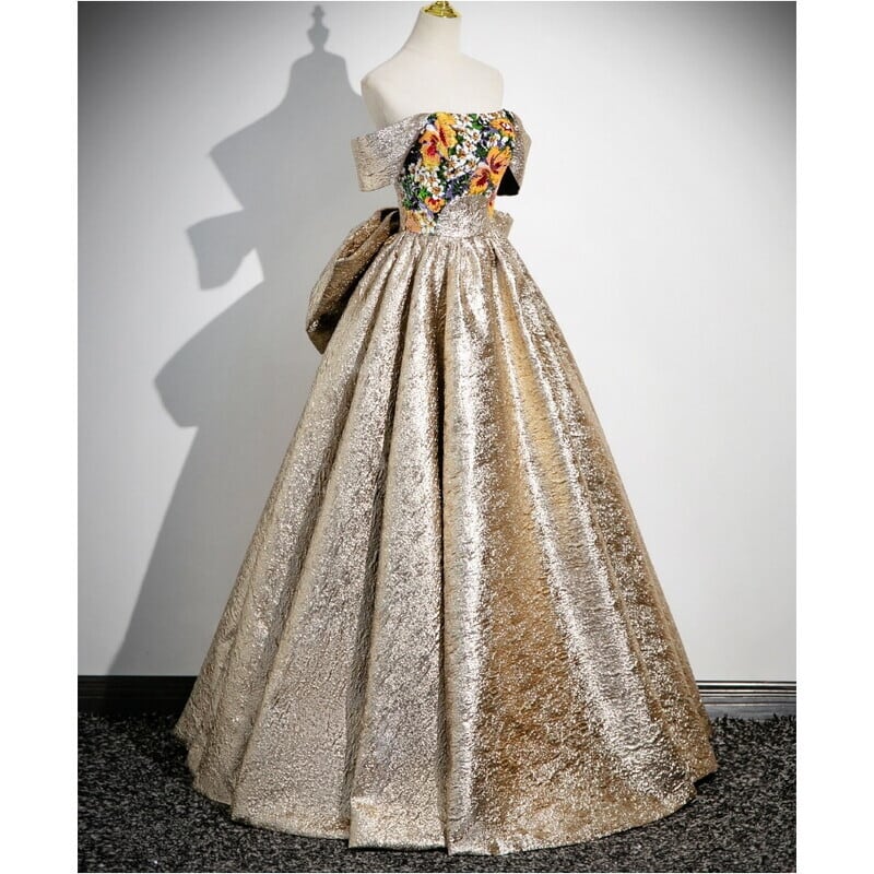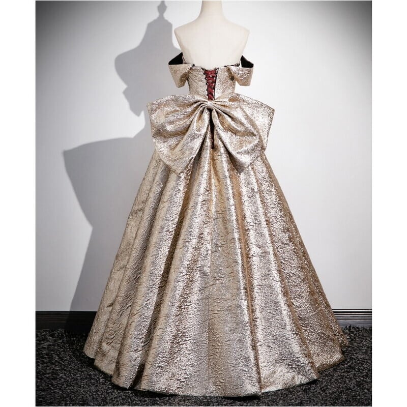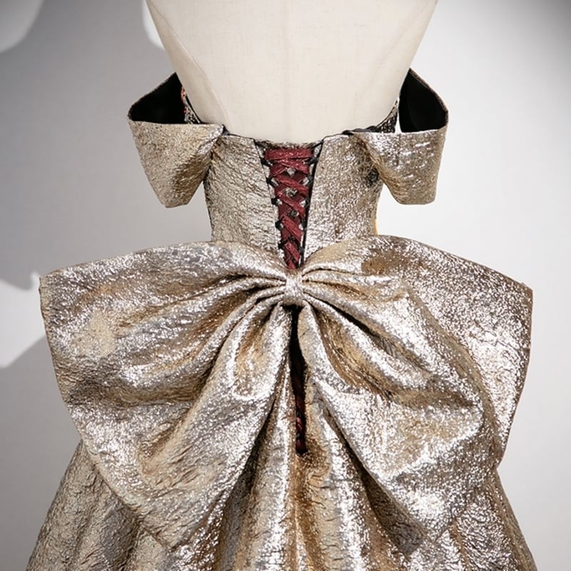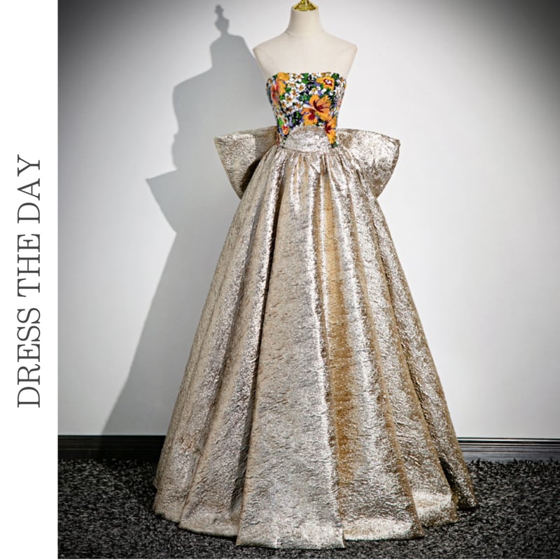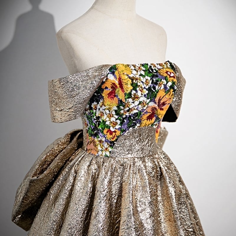 バックのビッグリボンがガーリーな存在感を放つオフショルダードレスです。艶のある高級感あふれる素材は、特別な日のコーディネートに華やかさを添えます。ストラップレスデザインがデコルテにセクシーな印象を演出しており、女性らしいシルエットを引き立てます。トップのフラワーパターンにあしらったスパンコールが大人かわいい仕立になっております。