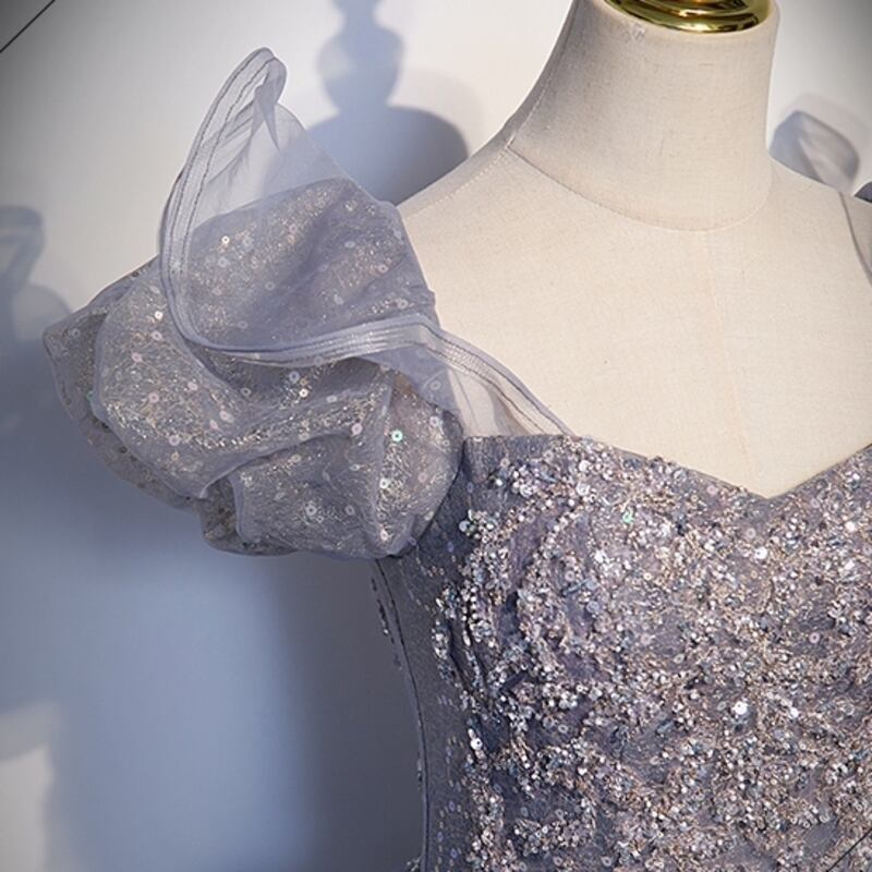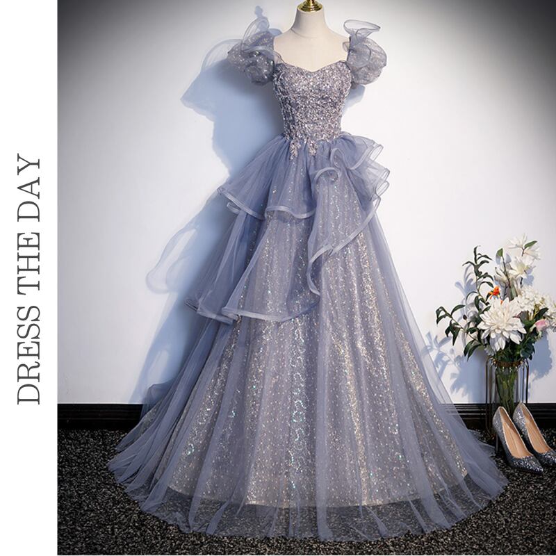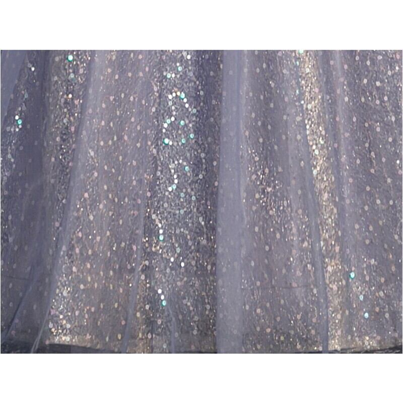 グリッターがきらめく生地にチュールをレイヤードしたクラシカルなマキシ丈ドレスです。ふんわりパフスリーブとバストの刺繍がおしゃれなペンタゴンネックのデコルテデザインが洗練されており、フリル付きのハイウエストのマキシスカートがエレガントな雰囲気を演出します。後ろ姿までデザイン性があり特別な日のコーディネートに最適な一着で、どんなシーンでもあなたを引き立てる存在感を発揮します。