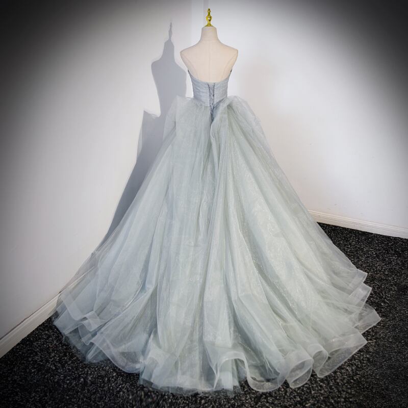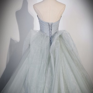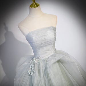 ツヤ感のある繊細なチュールをふんだんにあしらったふんわりとしたベアトップドレスです。グリッターがきらめく高級感あふれる素材感は、特別な日のコーディネートに華やかさを添えます。ストラップレスデザインがデコルテにセクシーな印象を演出しており、サイドのスパンコールリボンがコーデを一層引き立てます。