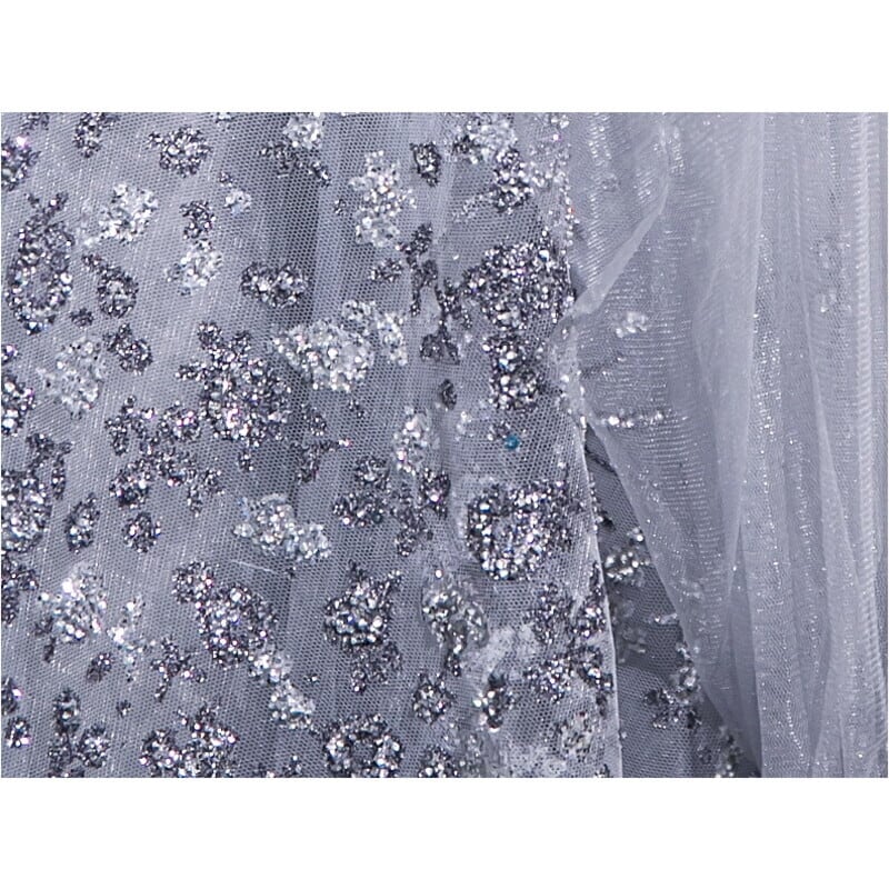 きらめくクリスタルパターンの刺繍をメッシュに仕立てた華やかなオフショルドレスです。高級感あふれる素材感は、特別な日のコーディネートにゴージャスな存在感を添えます。チョーカー付きのメッシュスリーブのシアーな長袖デザインとして着用したり、セクシーな大胆なオフショルダーとして着用したり、2WAYで楽しめて女性らしいシルエットを引き立てます。