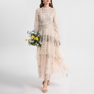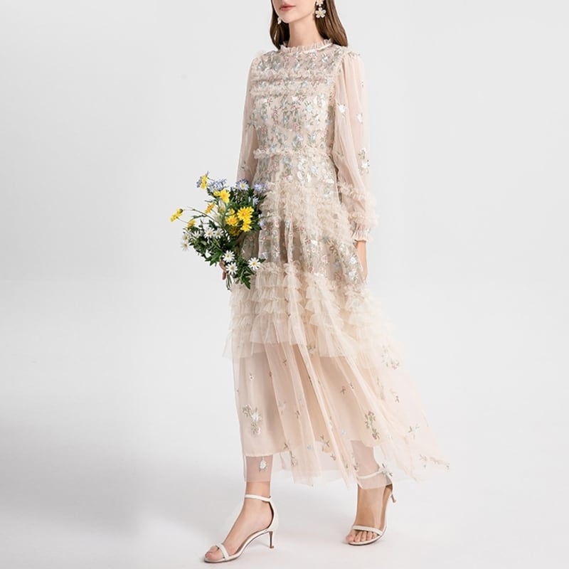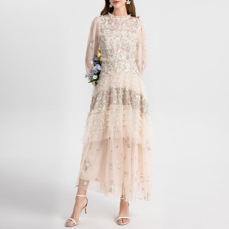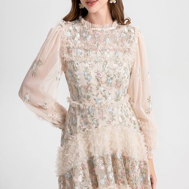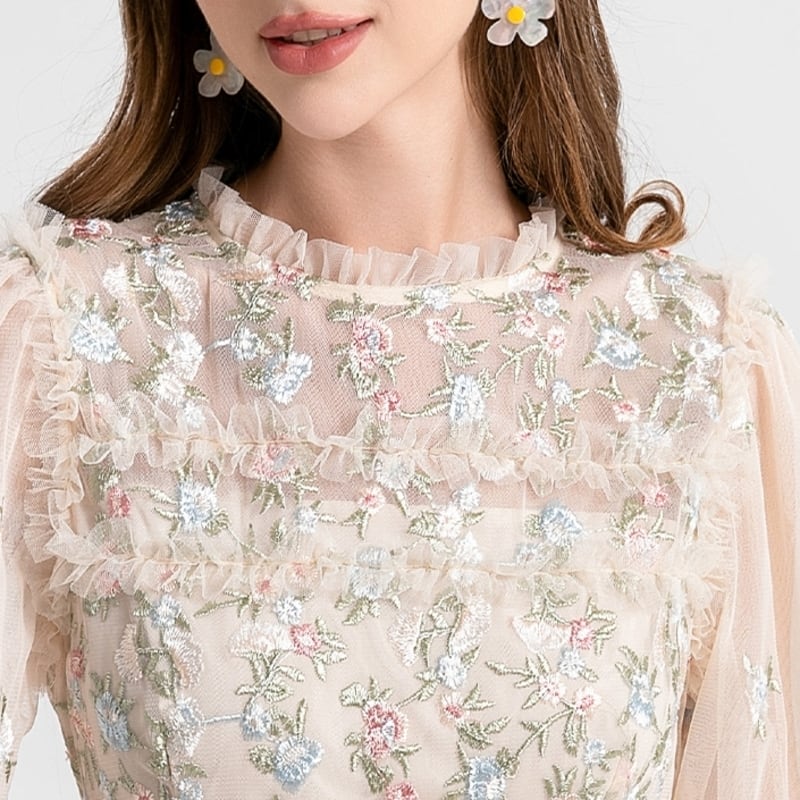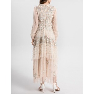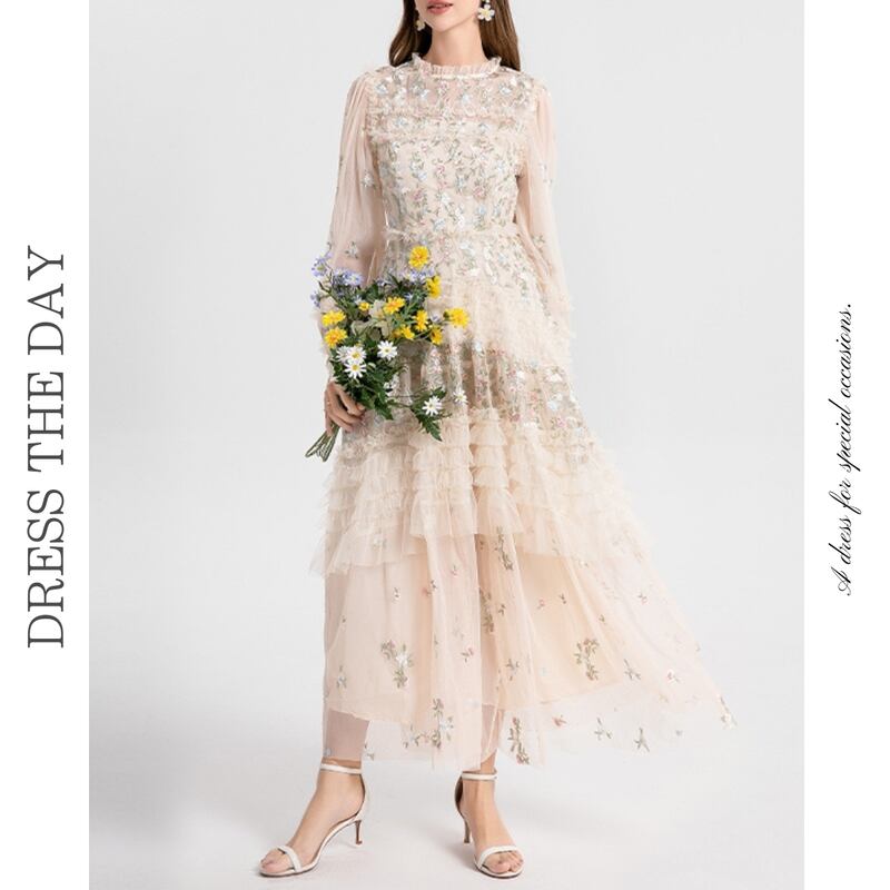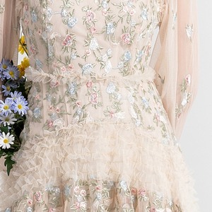 淡いフラワー刺繍が魅力的なチュールシアードレスです。チュールの透け感が可愛らしい印象を演出します。普段使いから特別な日のコーディネートまで幅広く活躍する一着です。フリルをふんだんにあしらった上品な仕立てで、ロング着丈は体型を自然にカバーしてくれます。どんなシーンでも目を引く存在感を発揮しますので、ぜひお試しください!