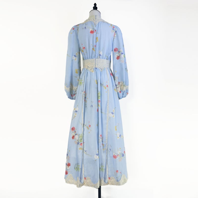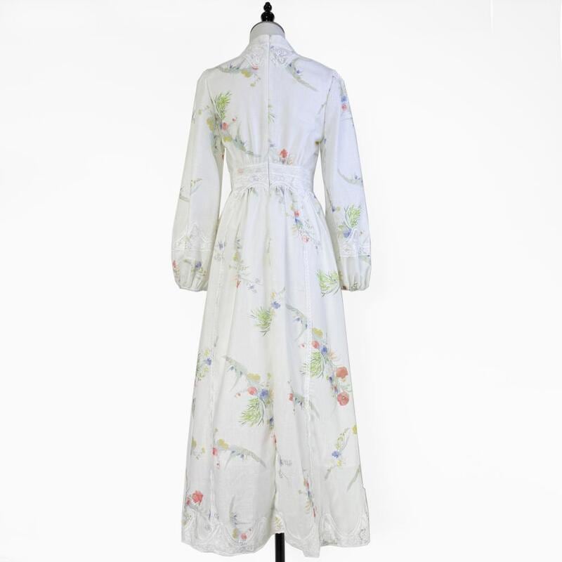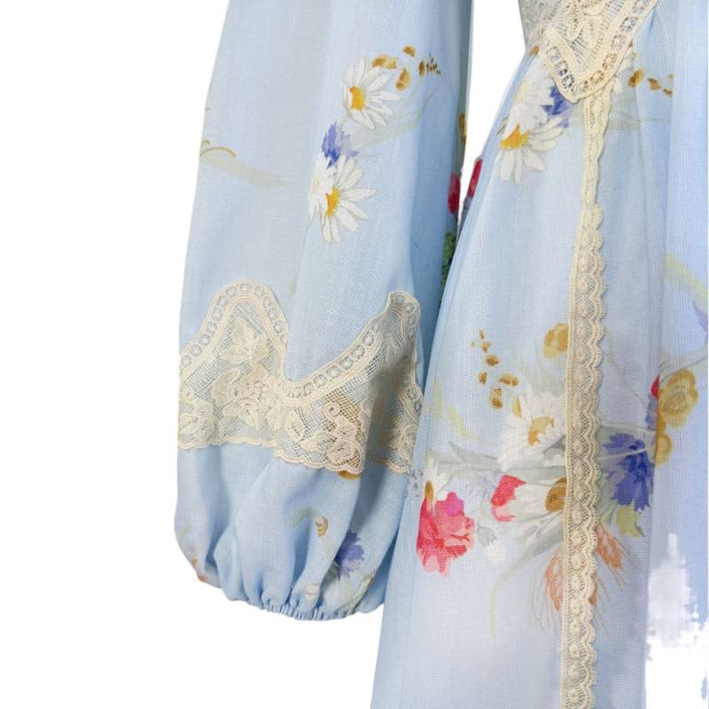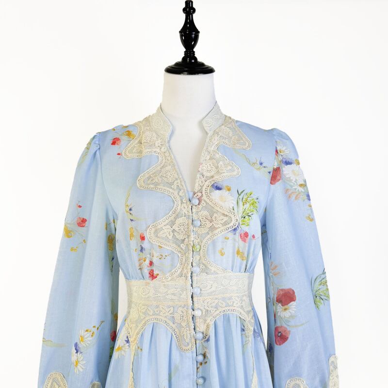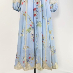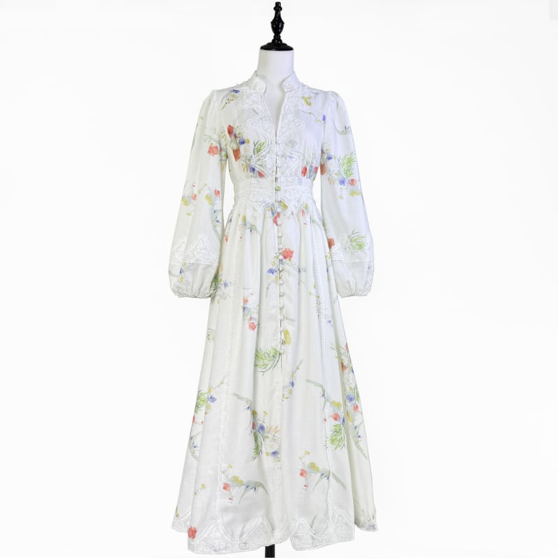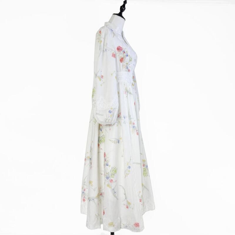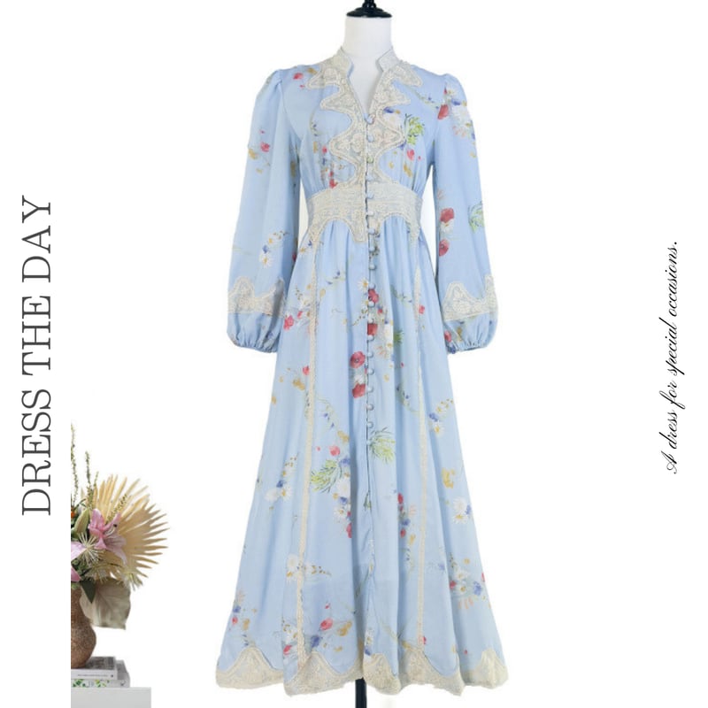 鮮やかなフラワープリントが魅力的なスタンドカラーのシャツドレスです。レースを襟やウエストにあしらいさりげないアクセントになった目を引くデザインが魅力的。普段使いから特別な日のコーディネートまで幅広く活躍する一着です。くるみボタンがころんと大人可愛い仕立てで、フレアスカートは体型を自然にカバーしてくれます。
