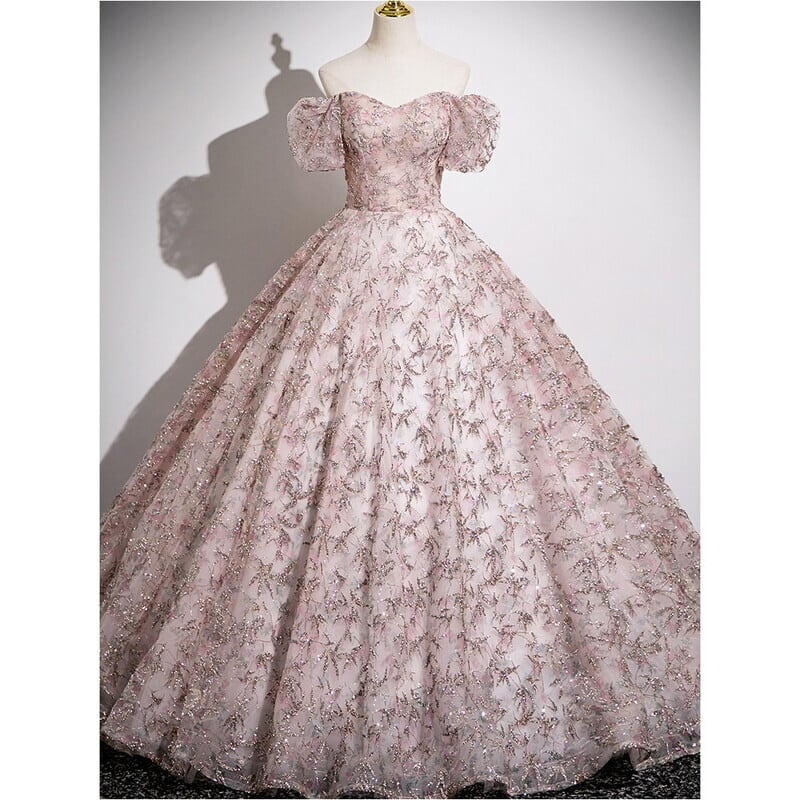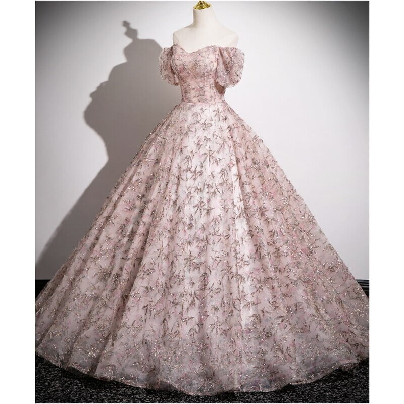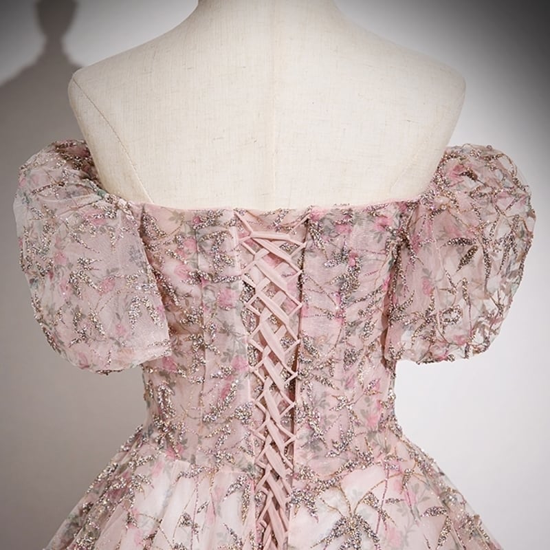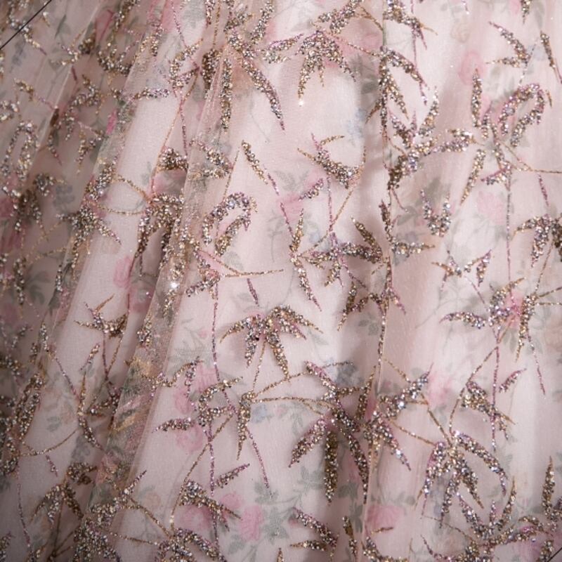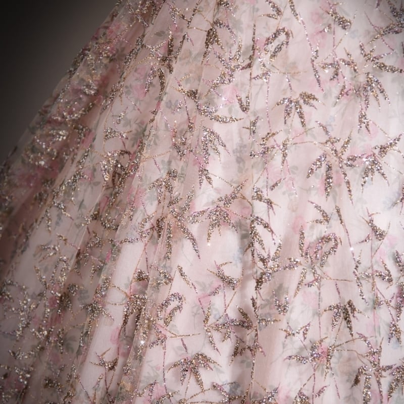 きらめくメタリックパターンの刺繍をメッシュに仕立てた華やかなロングドレスです。高級感あふれる素材感は、特別な日のコーディネートにゴージャスな存在感を添えます。バルーンスリーブのペンタゴンネックとして着用したり、肩を落としてセクシーかつ大胆なオフショルダーとして着用したり、2WAYで楽しめて女性らしいシルエットを引き立てます。