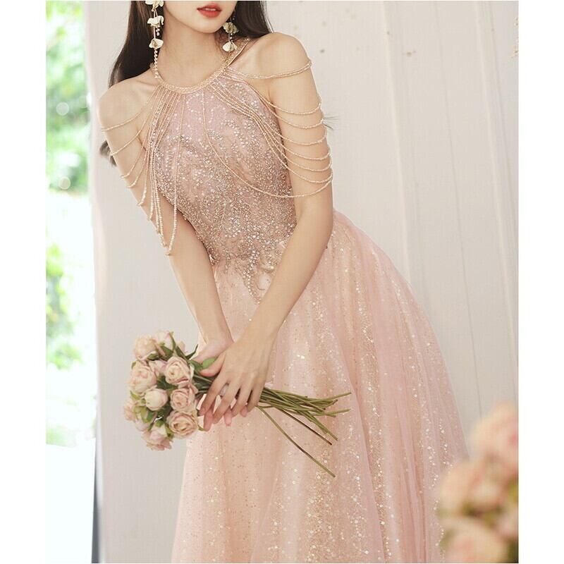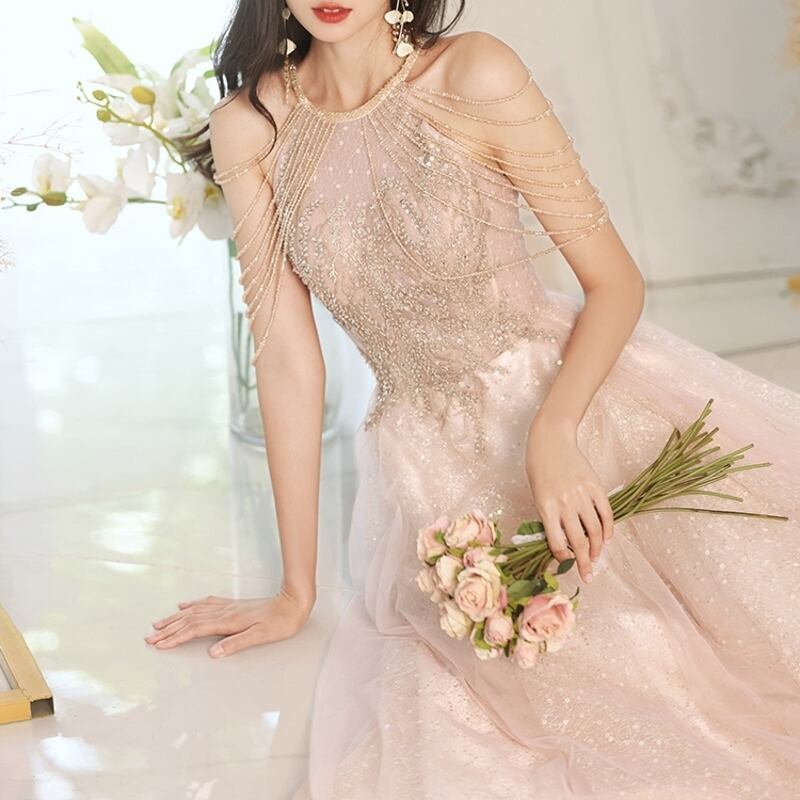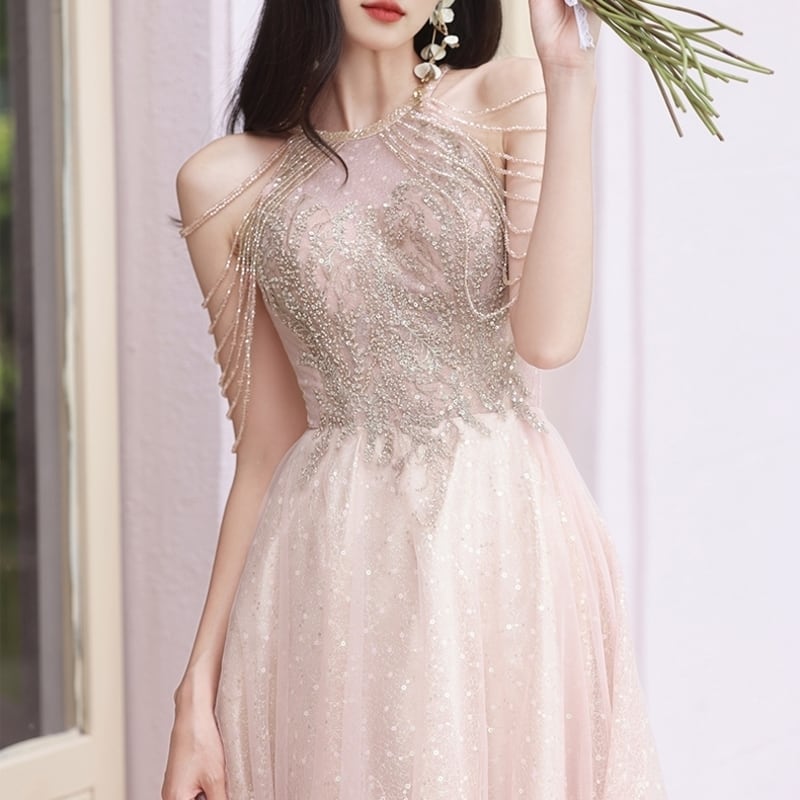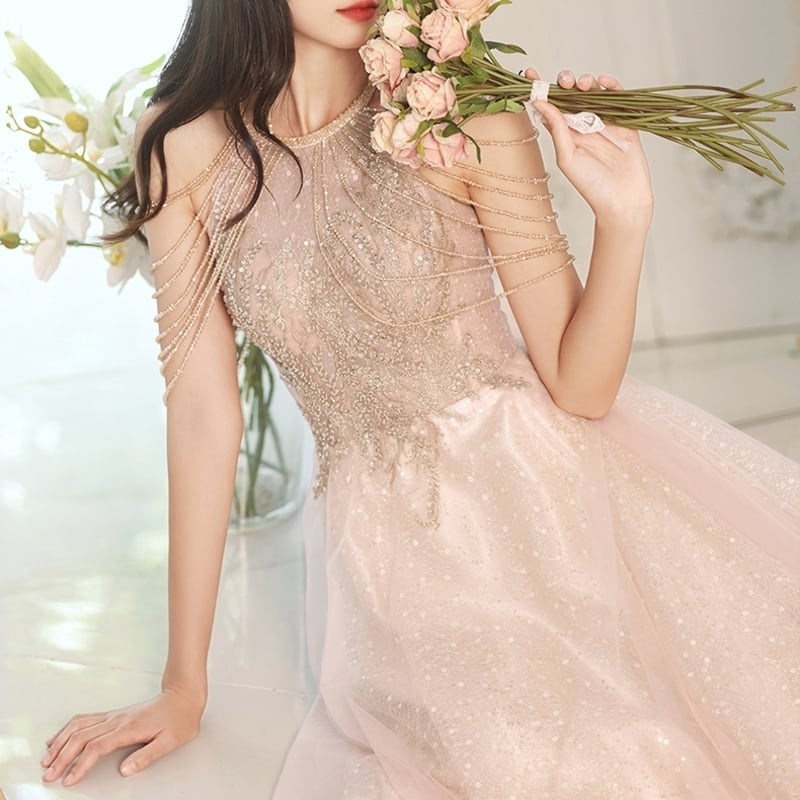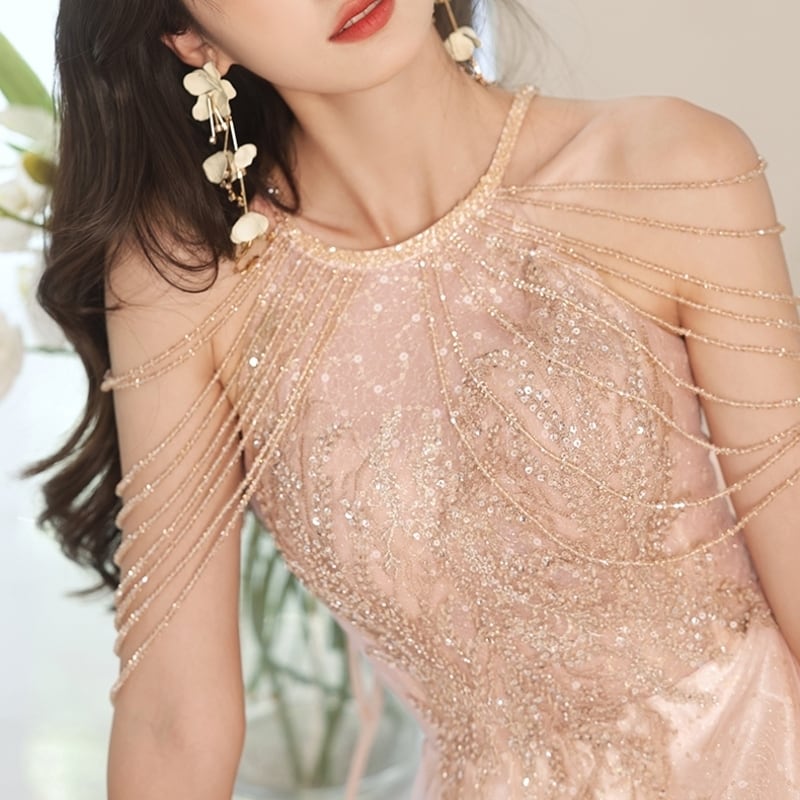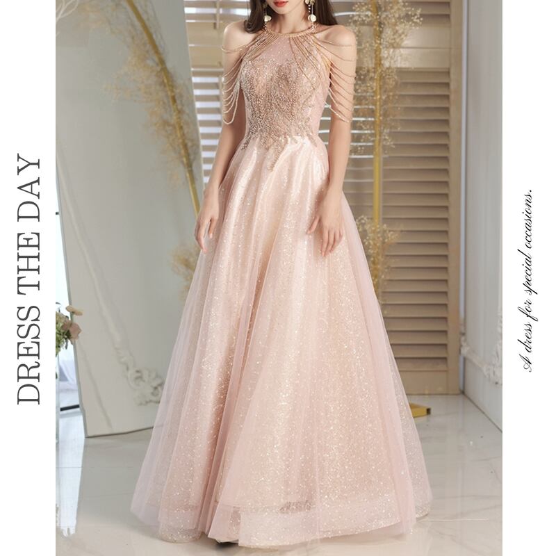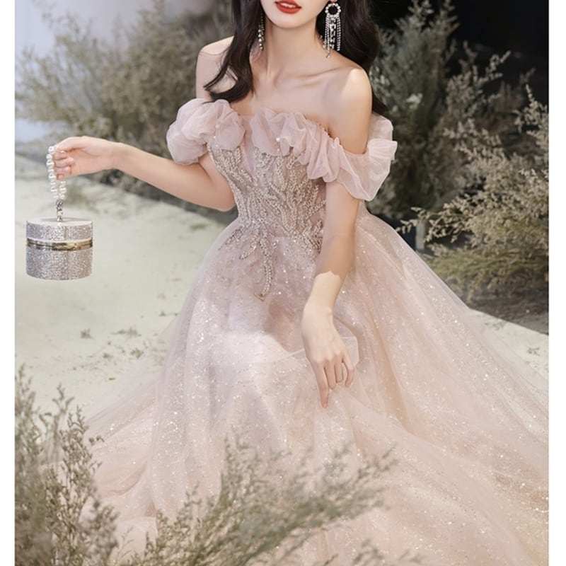 グリッターがきらめく繊細なチュールをふんだんにあしらったふんわりとしたロングドレスです。肩のまわりのビーズやスパンコール装飾が華やかで、特別な日のコーディネートに彩りを添えます。軽やかな透け感のあるデザインでセクシーな印象を演出しており、ハイウエストのAラインスカートが存在感抜群な高級感を放ちます。