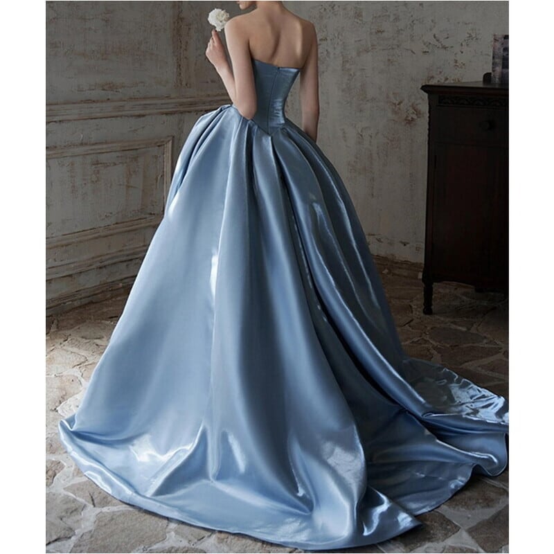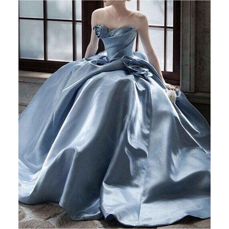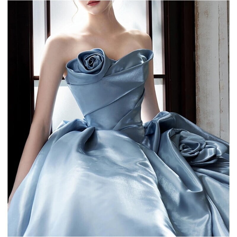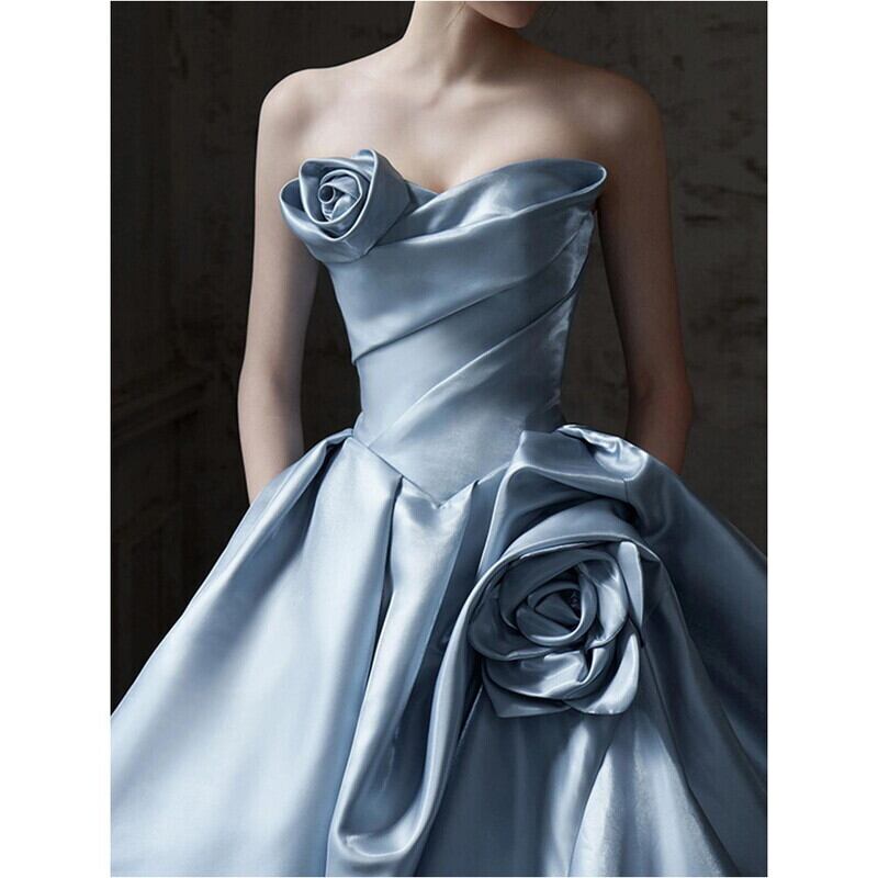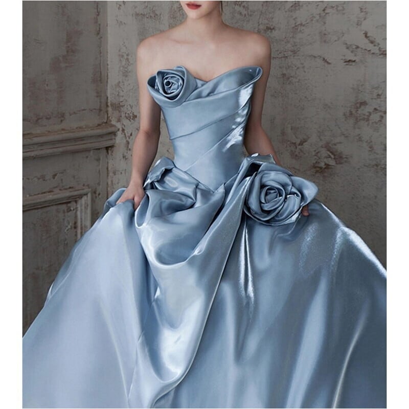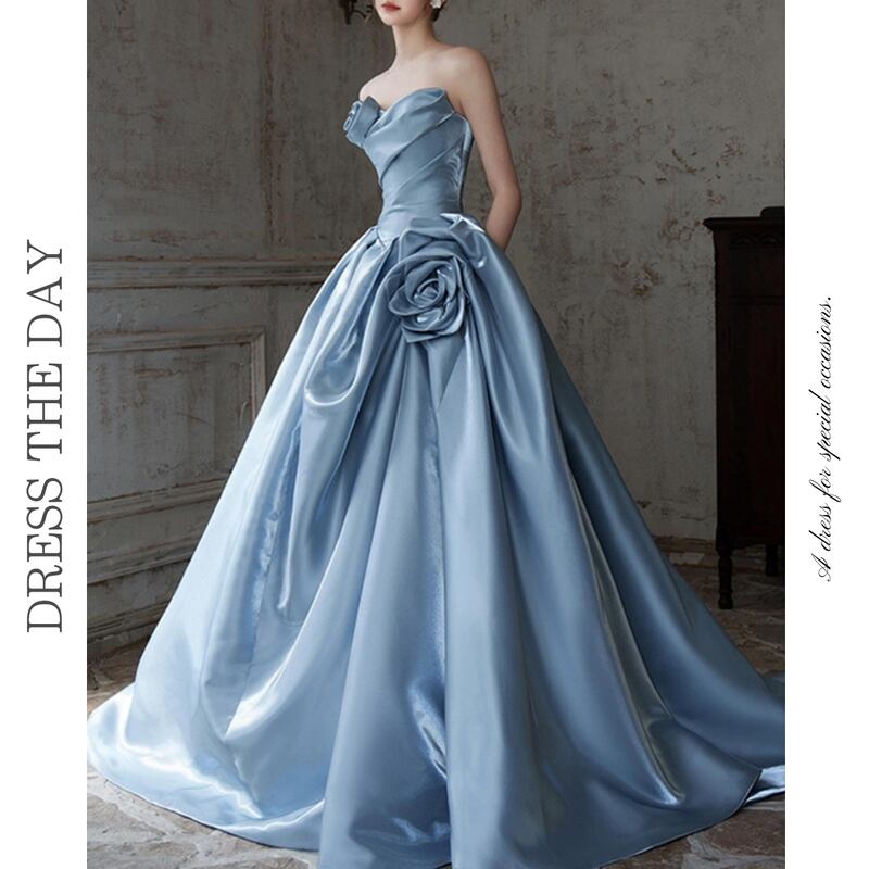 バストの立体的なフラワーモチーフとプリーツ仕立てがドレッシーなベアトップドレスです。艶のある高級感あふれる素材は、特別な日のコーディネートに華やかさを添えます。ストラップレスデザインがデコルテにセクシーな印象を演出しており、女性らしいシルエットを引き立てます。ふんわりギャザー入りスカートはロング丈で動くたびに美しいドレープを描くため、さまざまなシーンであなたの個性を際立てる一着です。