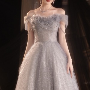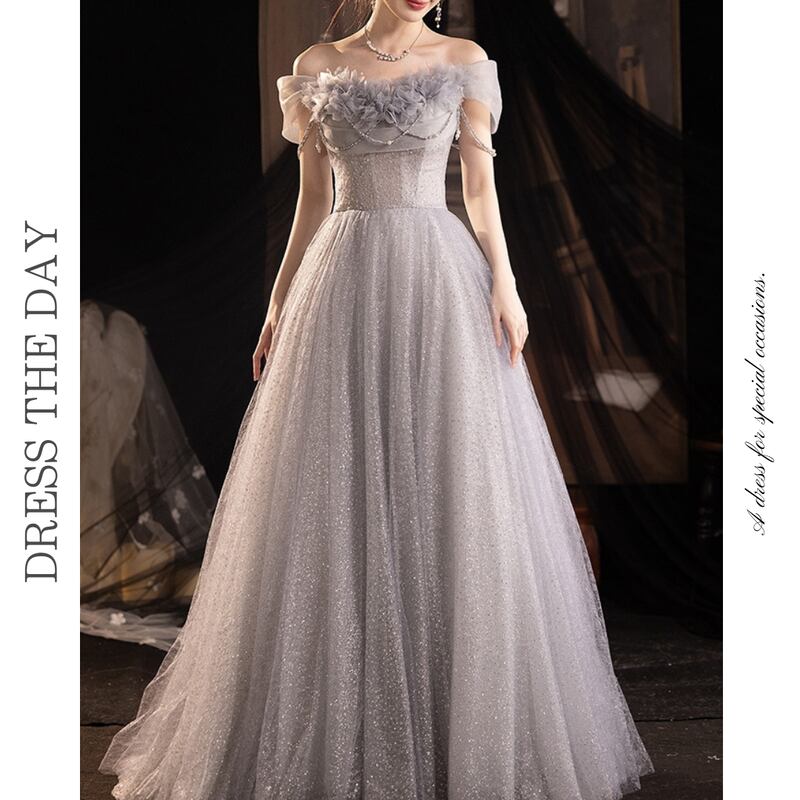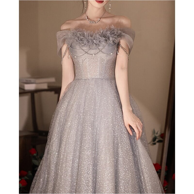 デコルテにあしらった立体的なフラワーモチーフとストラップが目を引く2WAYスリーブデザインのドレスです。きらめくふんわりとしたチュールをレイヤードした仕立ては、特別な日のコーディネートに華やかさを添えます。大胆なオフショルダーデザインがセクシーな印象を演出しており、女性らしいシルエットを引き立てます。華やかなロングスカートは、さまざまなシーンであなたの個性を際立てる一着です。