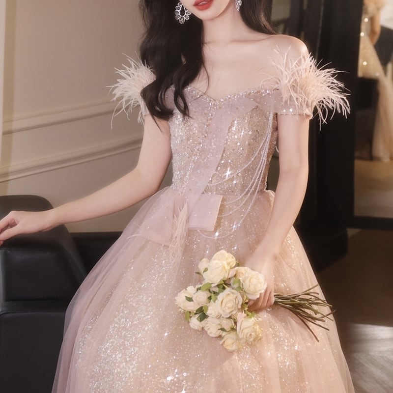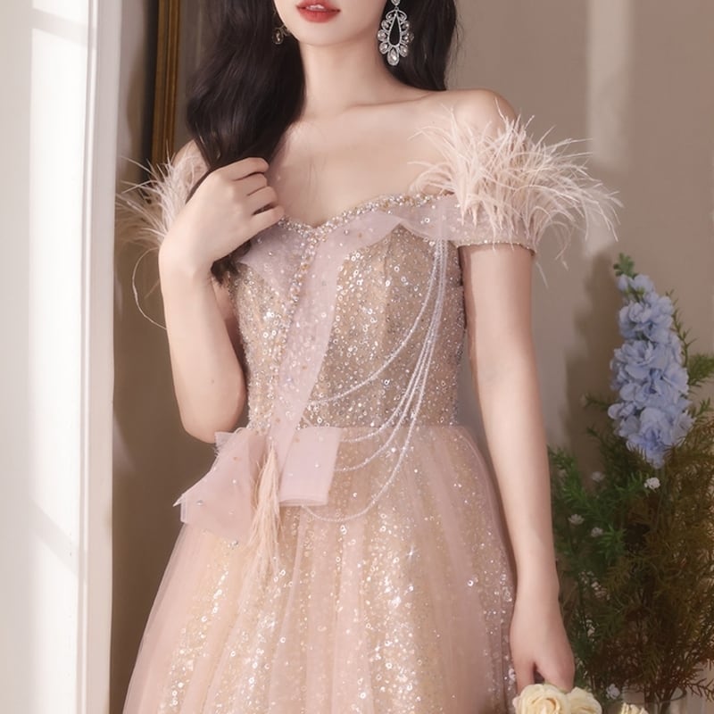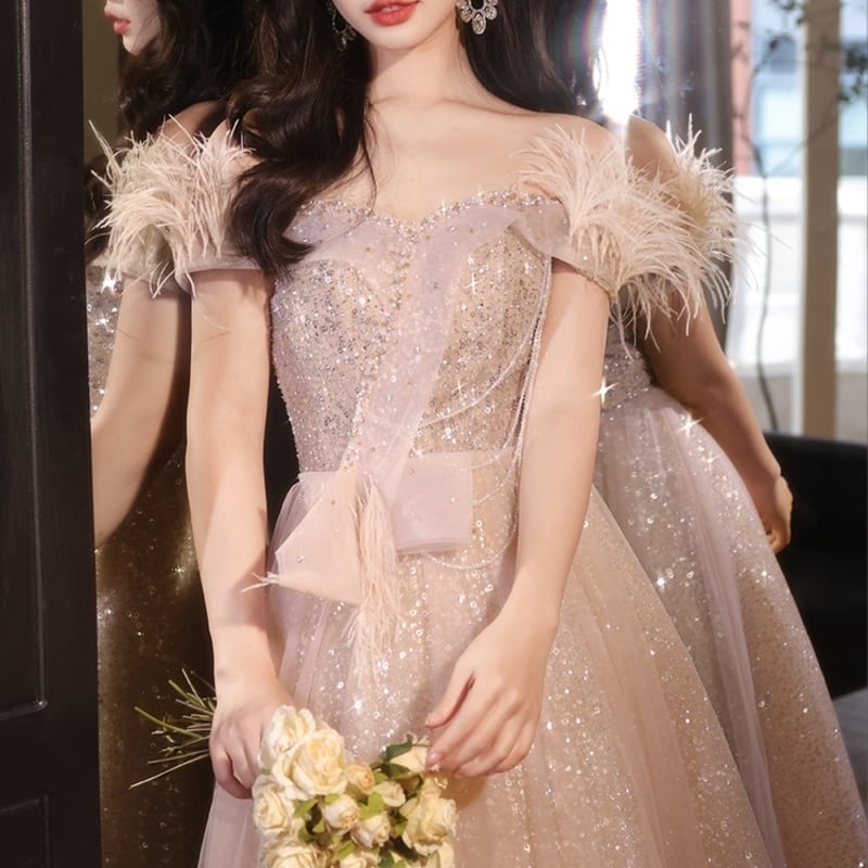 袖にあしらったフェイクファーの質感が目を引くオフショルドレスです。チュールにはグリッターときらめくスパンコールを散りばめて特別な日のコーディネートに華やかさを添えます。大胆なオフショルダーデザインがセクシーな印象を演出しており、女性らしいシルエットを引き立てます。華やかなロングスカートは、さまざまなシーンであなたの個性を際立てる一着です。