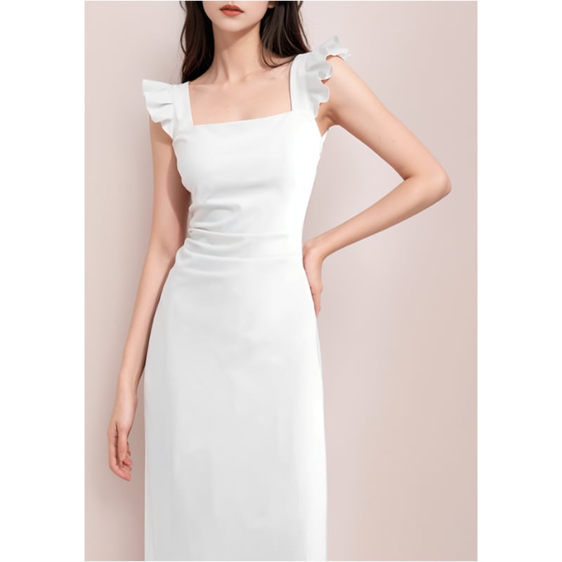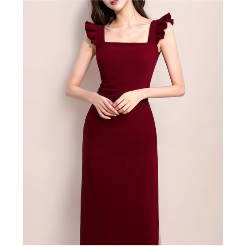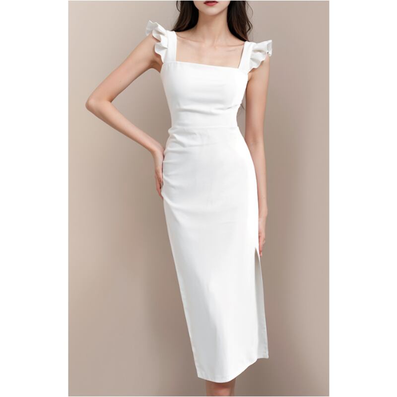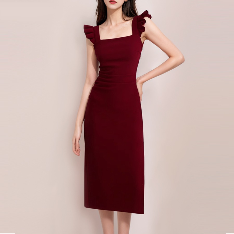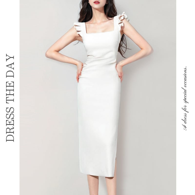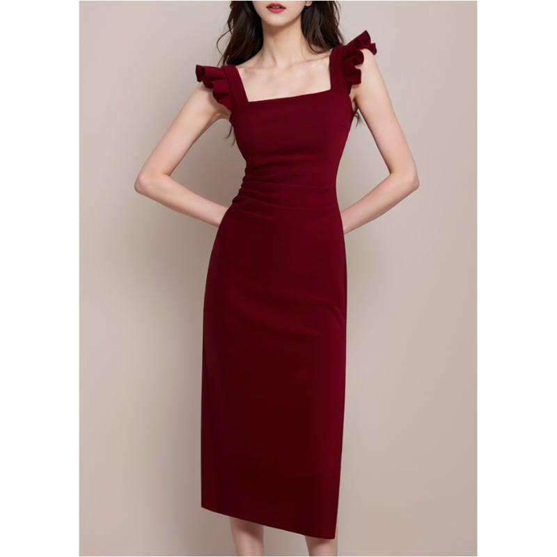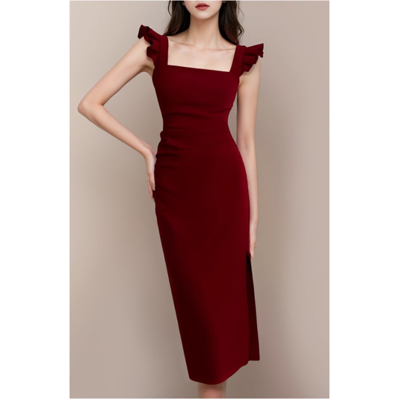 すっきりシンプルな仕立てがシックで洗練された、シームレスなデザインが特徴的なミモレ丈ドレスです。スクエアネックはデコルテをきれいに見せて、フリルがアクセントになり大人かわいい印象を与えます。普段使いから特別な日のコーディネートまで幅広く活躍しますので、どんな場面でもあなたを引き立ててくれます。