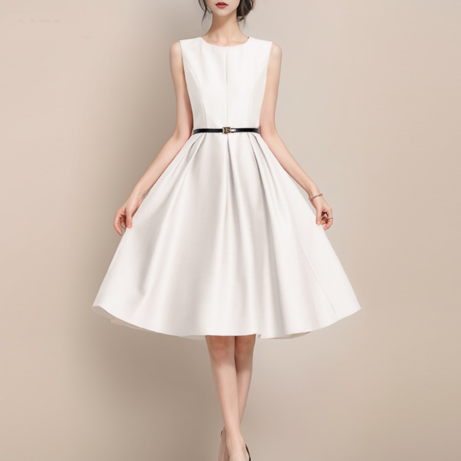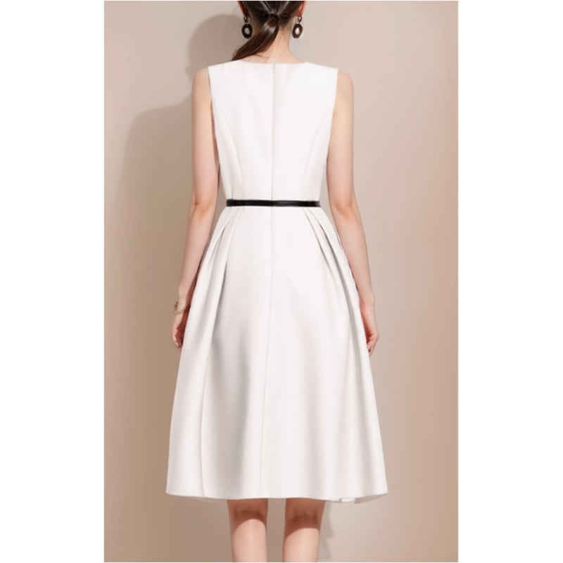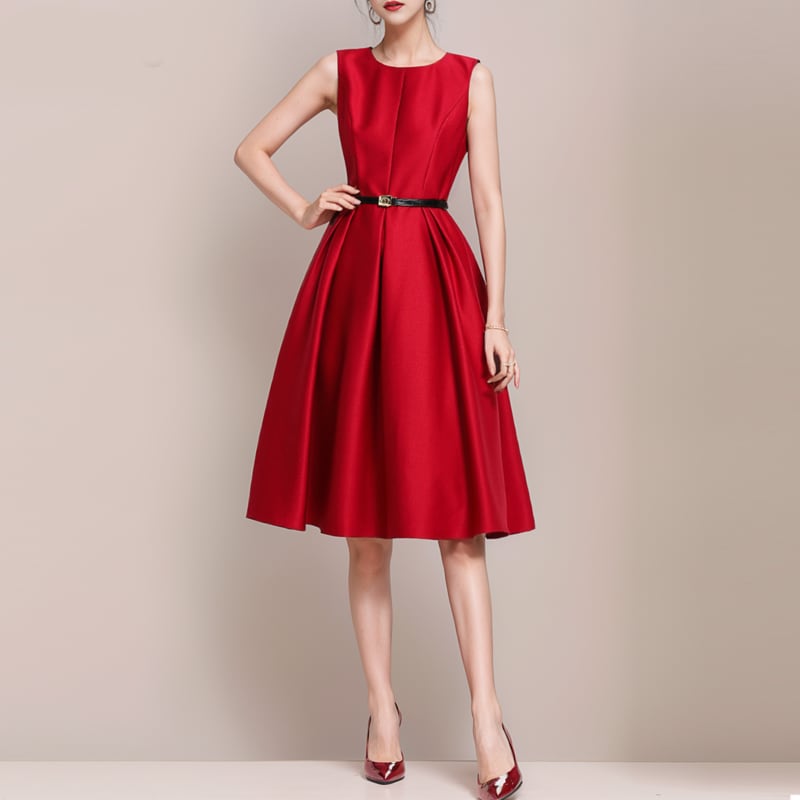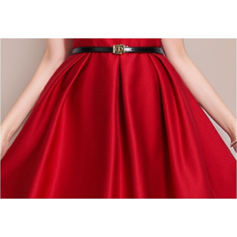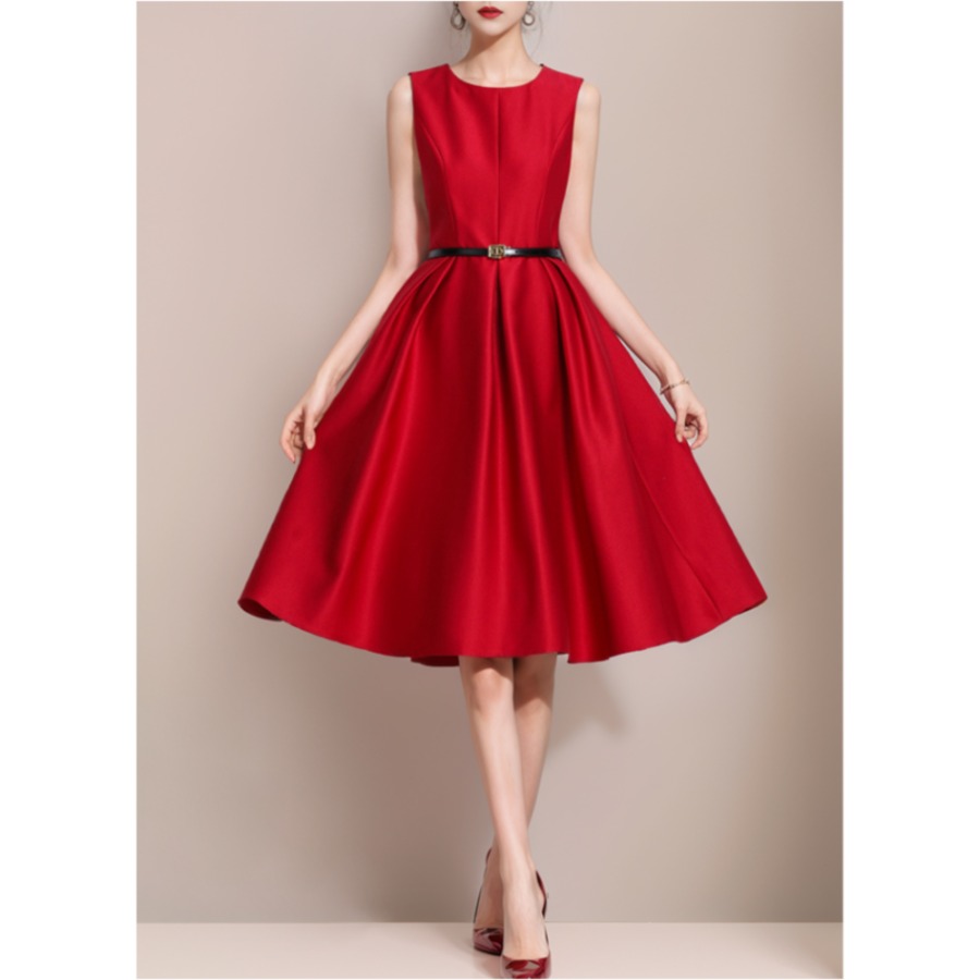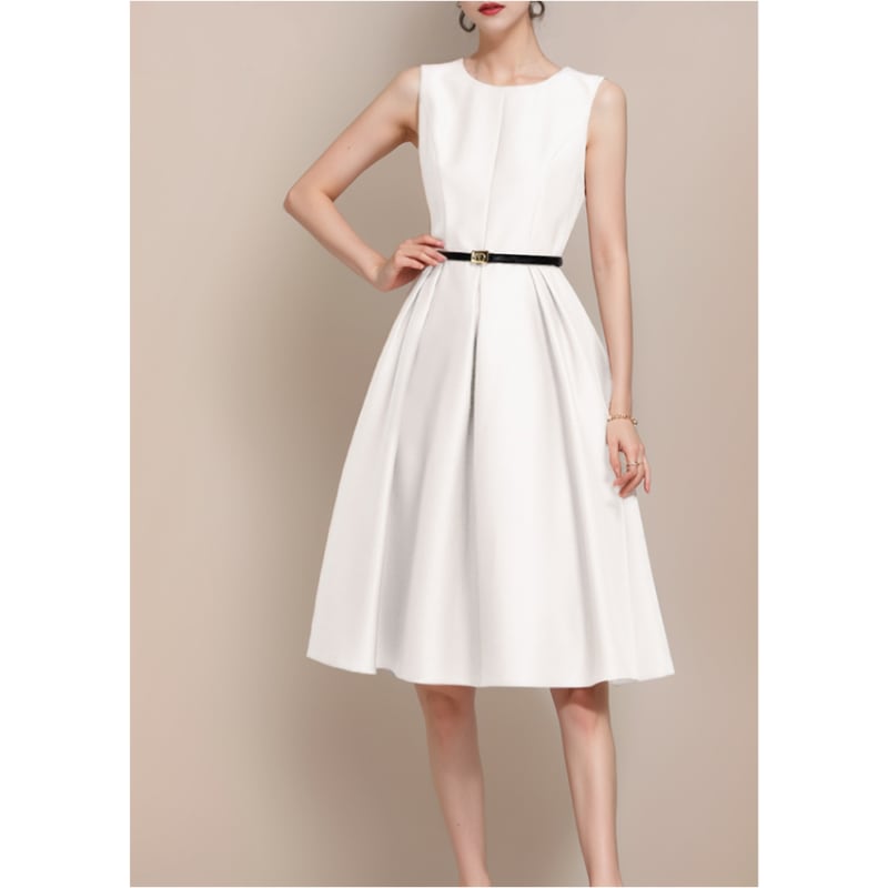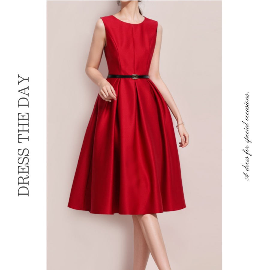 すっきりシンプルな仕立てが洗練された、繊細なウエストベルトがアクセントのミディアム丈ドレスです。ふんわりと上品なボリューム感のあるタック入りフレアスカートが大人かわいい印象を与えます。普段使いから特別な日のコーディネートまで幅広く活躍しますので、どんな場面でもあなたを引き立ててくれます。
