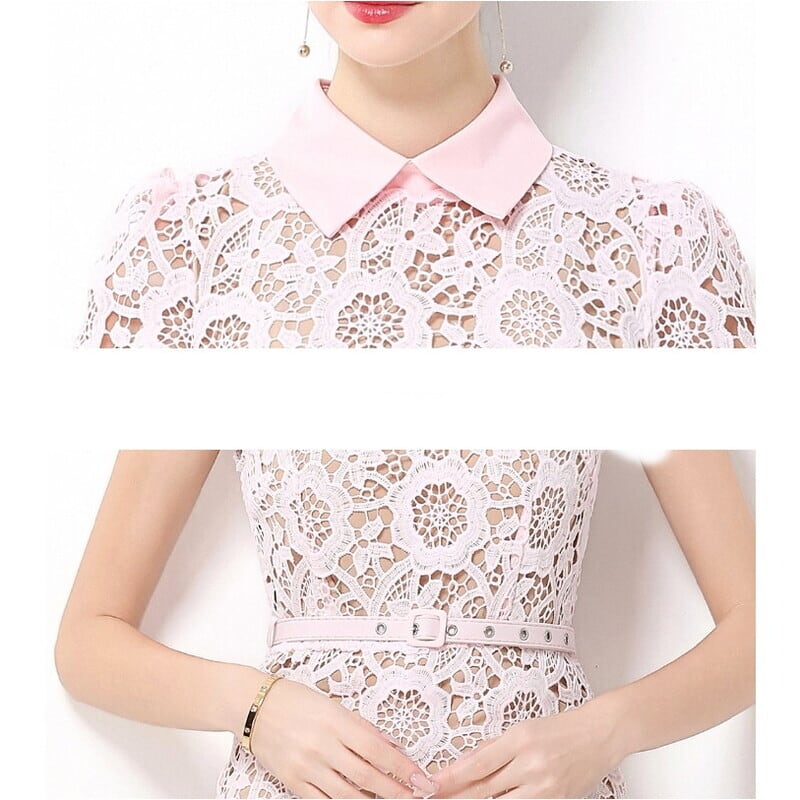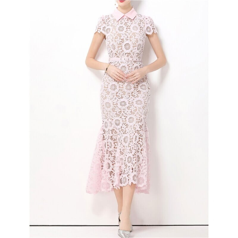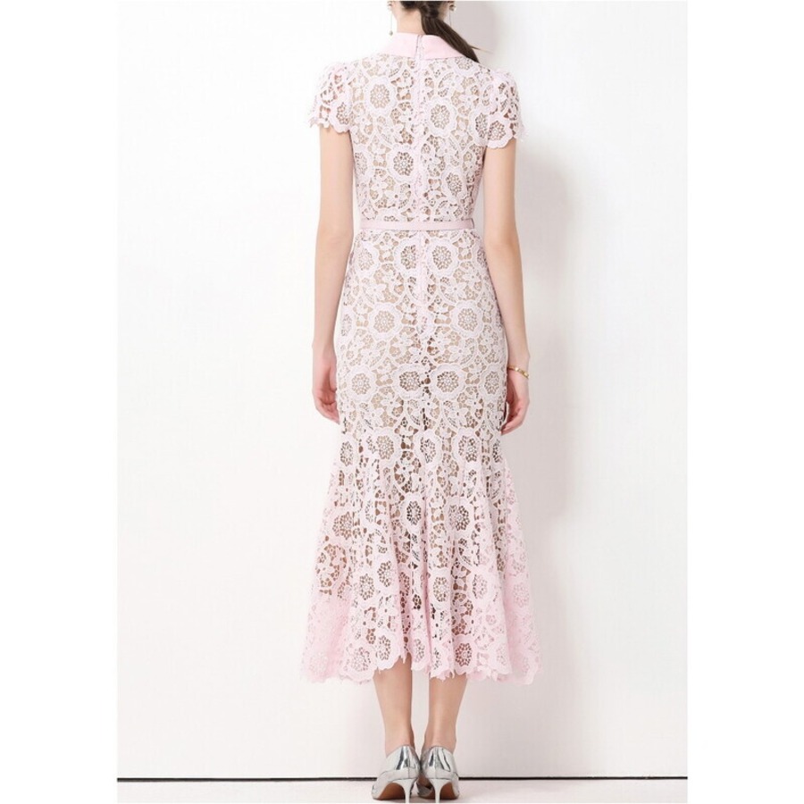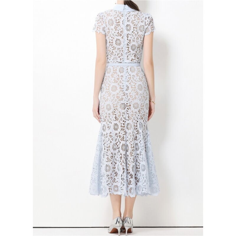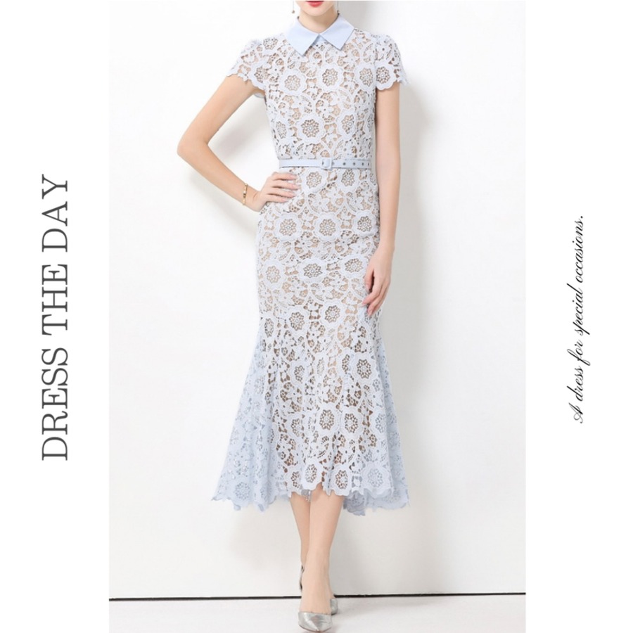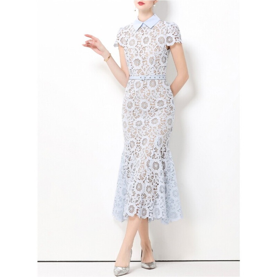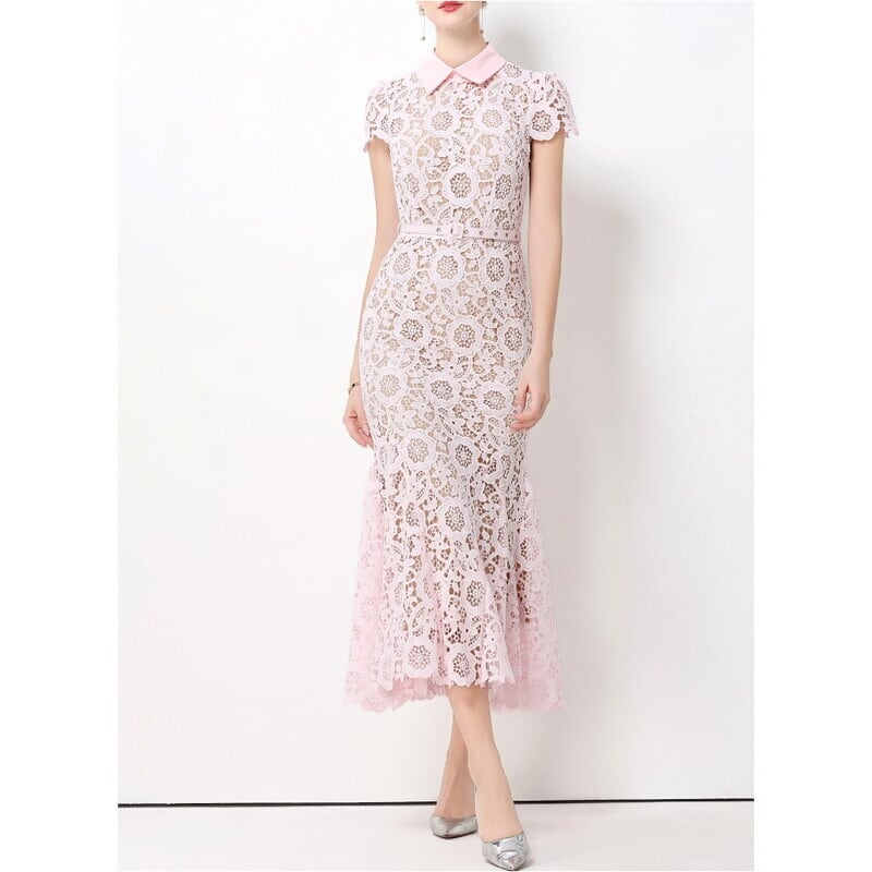 繊細な総レース仕立てが魅力的な半袖のミモレ丈ドレスです。上品なフレア感が魅力的で、フィッシュテールスカートが大人かわいい印象を与えます。普段使いから特別な日のコーディネートまで幅広く活躍しますので、どんな場面でもあなたを引き立ててくれること間違いなしです!