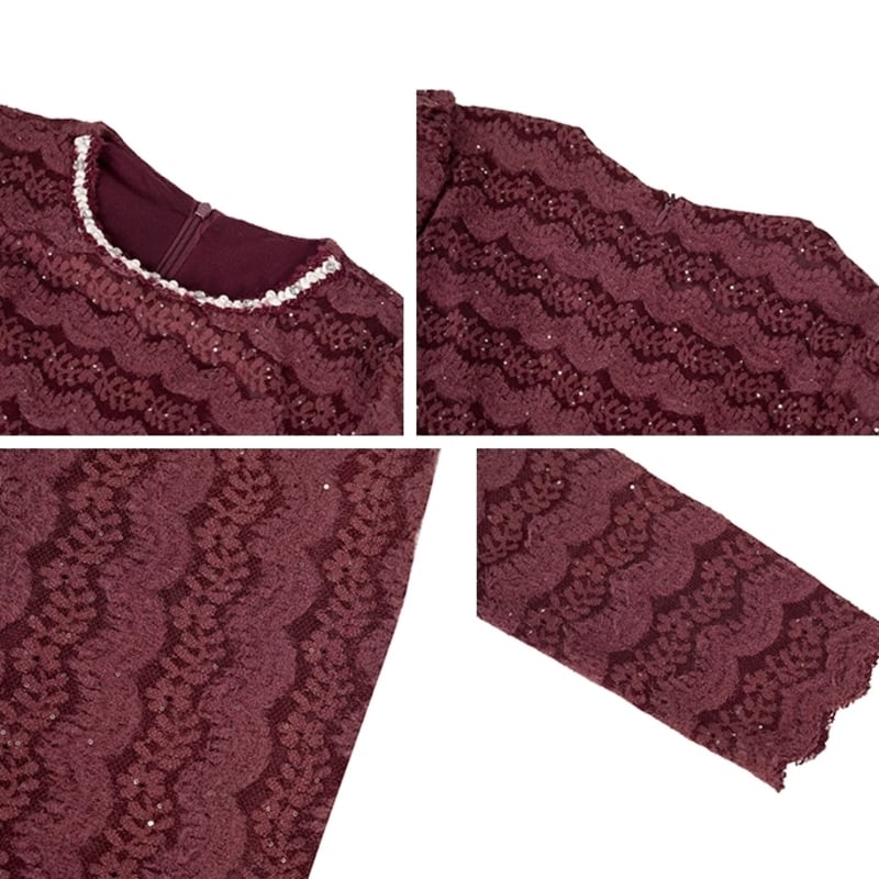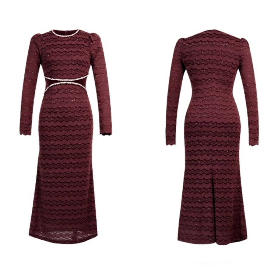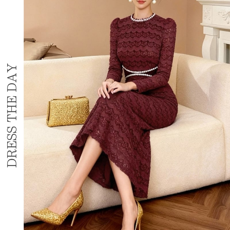 繊細な総レース仕立てが魅力的なマーメイドスカートのボディコンシャスドレスです。パワーショルダーがシックかつモードな印象で、襟とハイウエストのビーズ装飾がアクセントになった個性的なデザインです。タイトなシルエットが魅力的で、マーメイドシルエットが大人かわいい印象を与えます。特別な日のコーディネートからデイリー使いまで幅広く活躍する一着です。