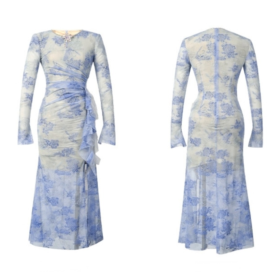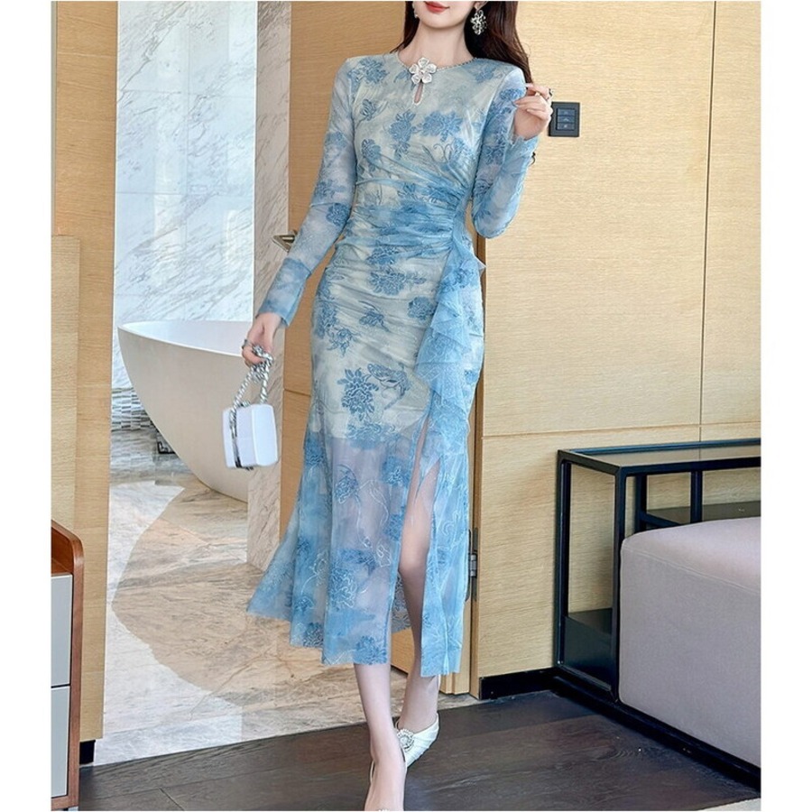 フラワーモチーフフリルギャザードレス D0225