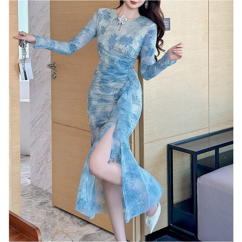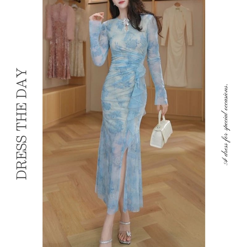 襟にフラワーモチーフをあしらった仕立てが魅力的なサイドスリットミモレ丈ドレスです。上品なフレア感が魅力的で、ハイウエストのギャザーとフリルのフレア感が大人かわいい印象を与えます。普段使いから特別な日のコーディネートまで幅広く活躍しますので、どんな場面でもあなたを引き立ててくれること間違いなしです!