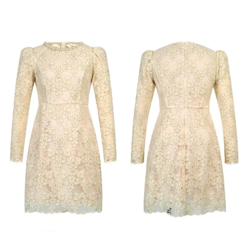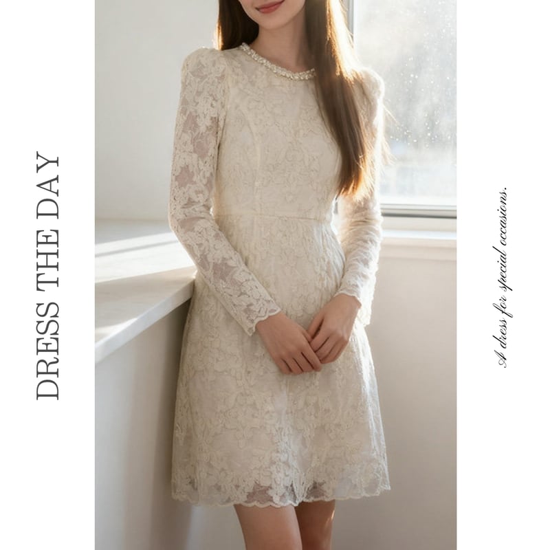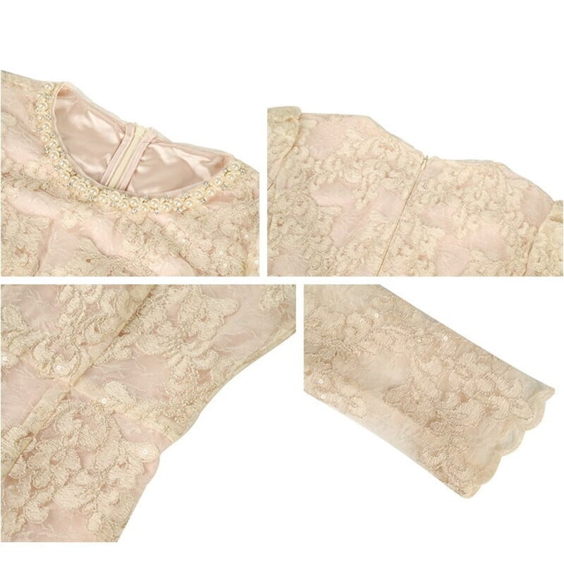 グリッターがきらめく花柄の総レースとハイウエスト切り替えが特徴的なシアースリーブのドレスです。袖まわりのレースの透け感がさり気なく大人可愛い印象を演出します。普段使いから特別な日のコーディネートまで幅広く活躍する一着です。ネックレスのように華やかな襟のデザインが個性的で、Aラインスカートで体型を自然にカバーしてくれます。