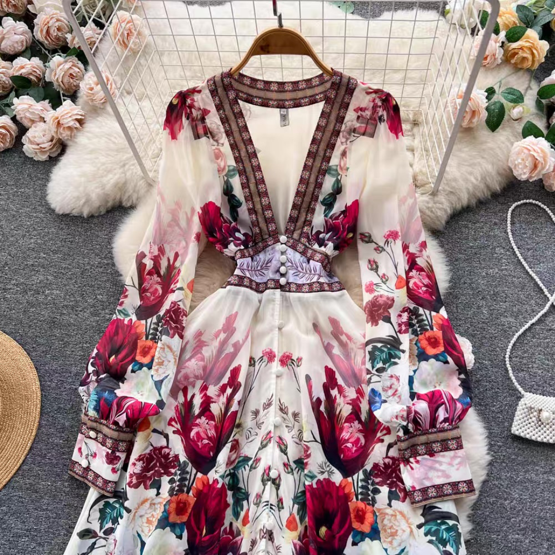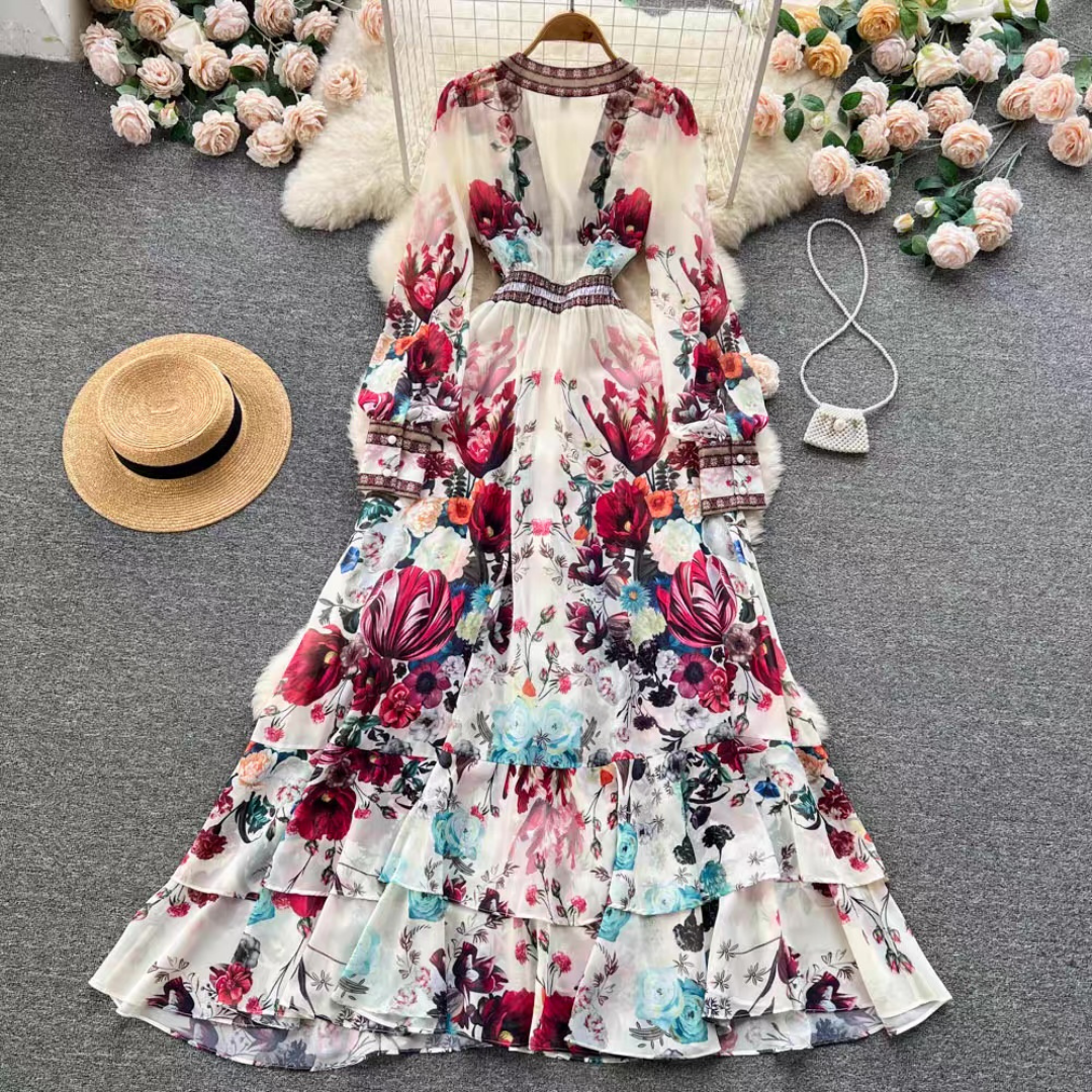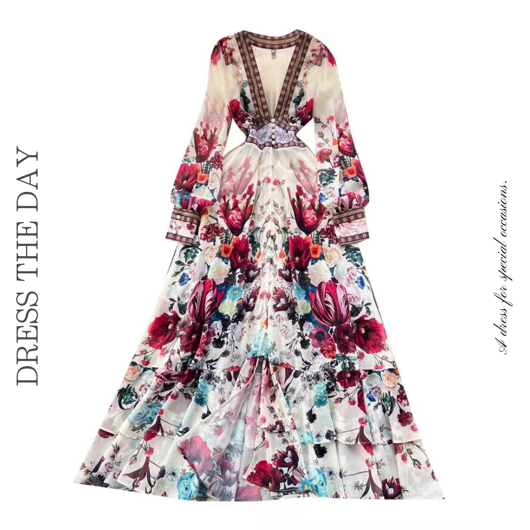 大胆な花柄が目を惹く華やかなロングドレス。深めのVネックとウエスト切替デザインがすっきりとしたシルエットを演出します。ふんわり広がるティアードスカートが女性らしさを引き立てる一着です。