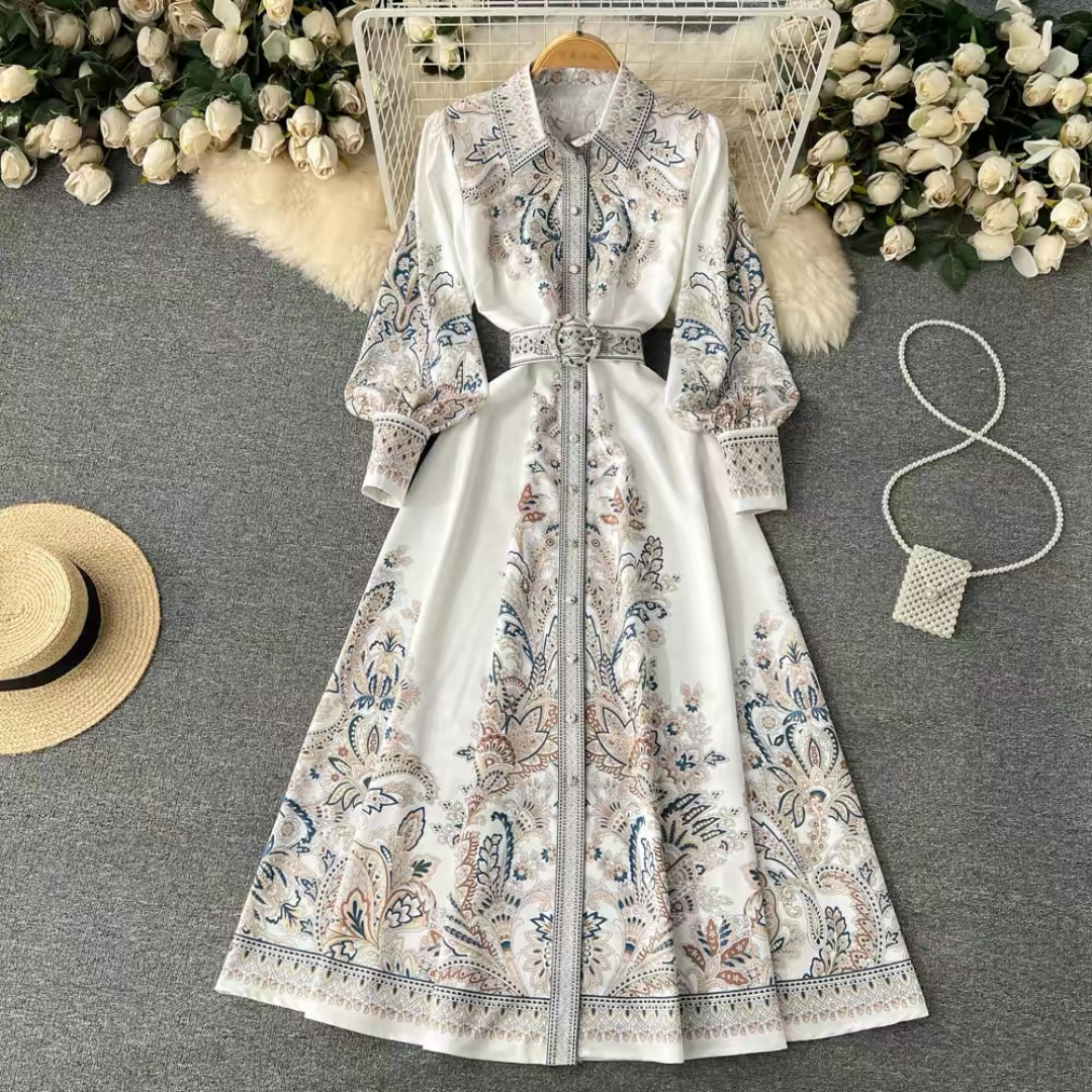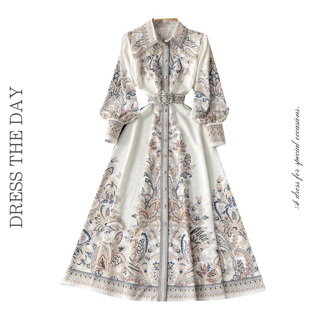 繊細なペイズリー柄が映えるクラシカルなロングシャツドレス。フロントボタンと共布ベルトが縦ラインを強調し、メリハリのあるシルエットに仕上げます。程よく広がるフレアラインが上品な存在感を引き立てる一着です。