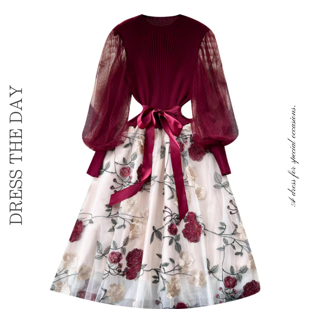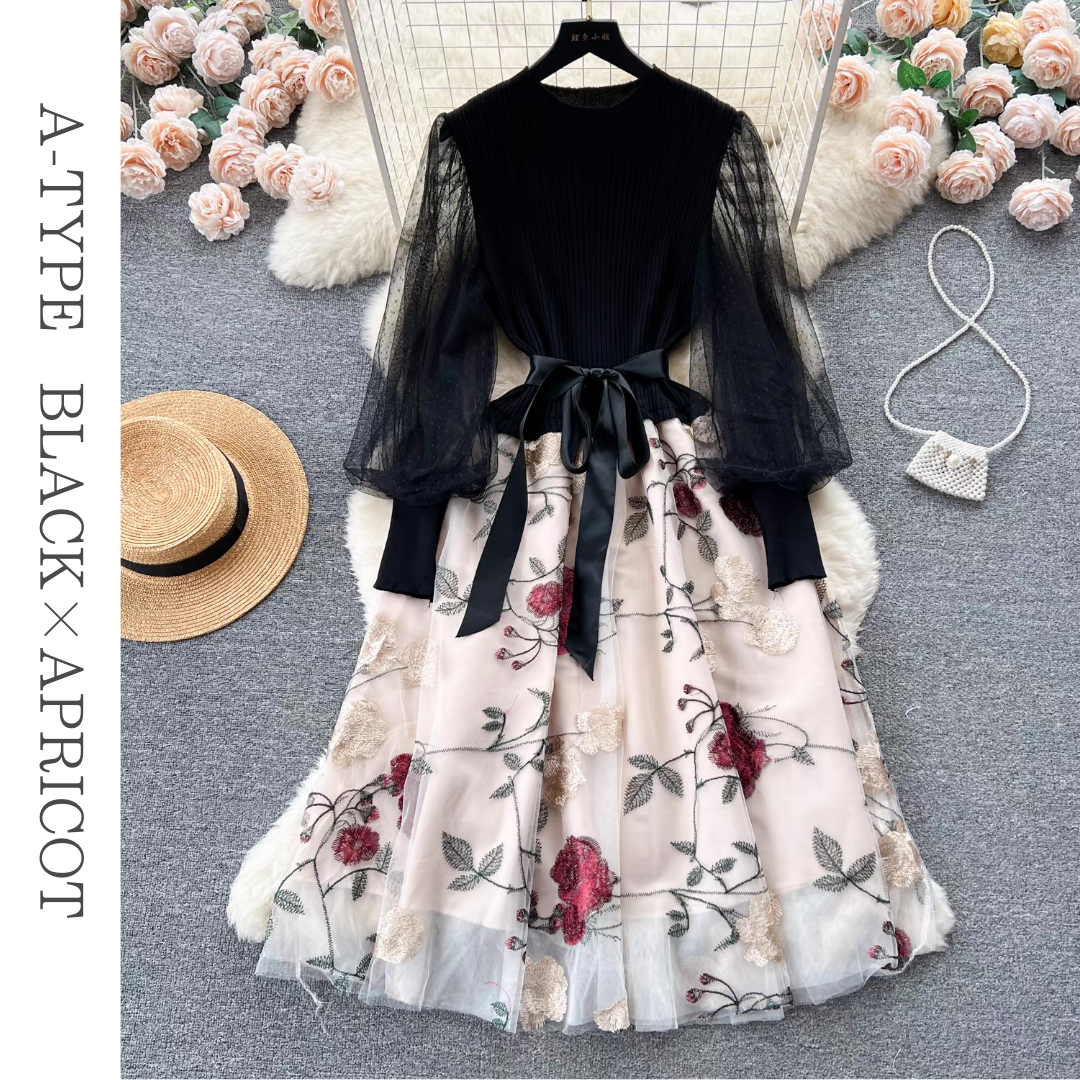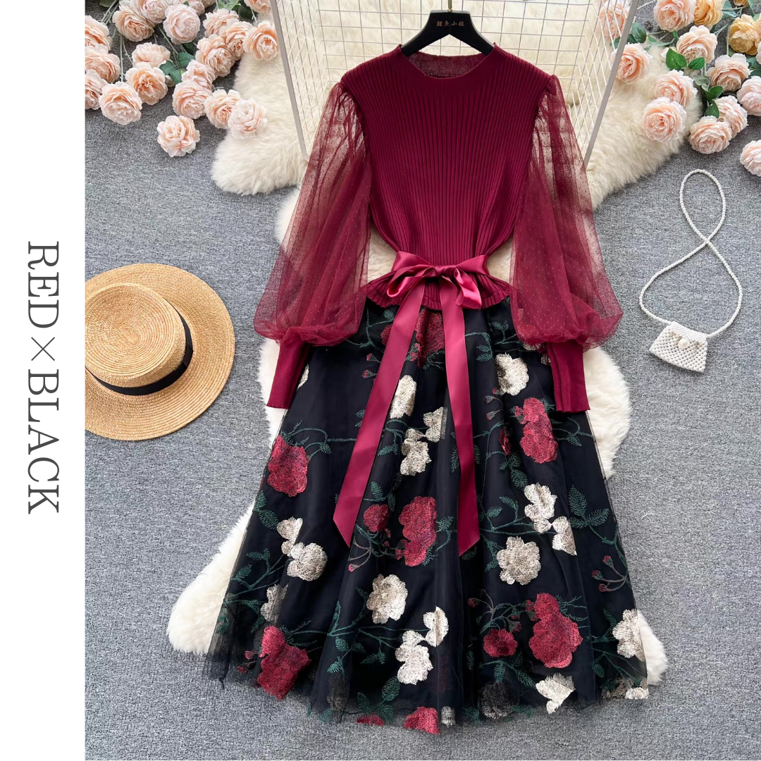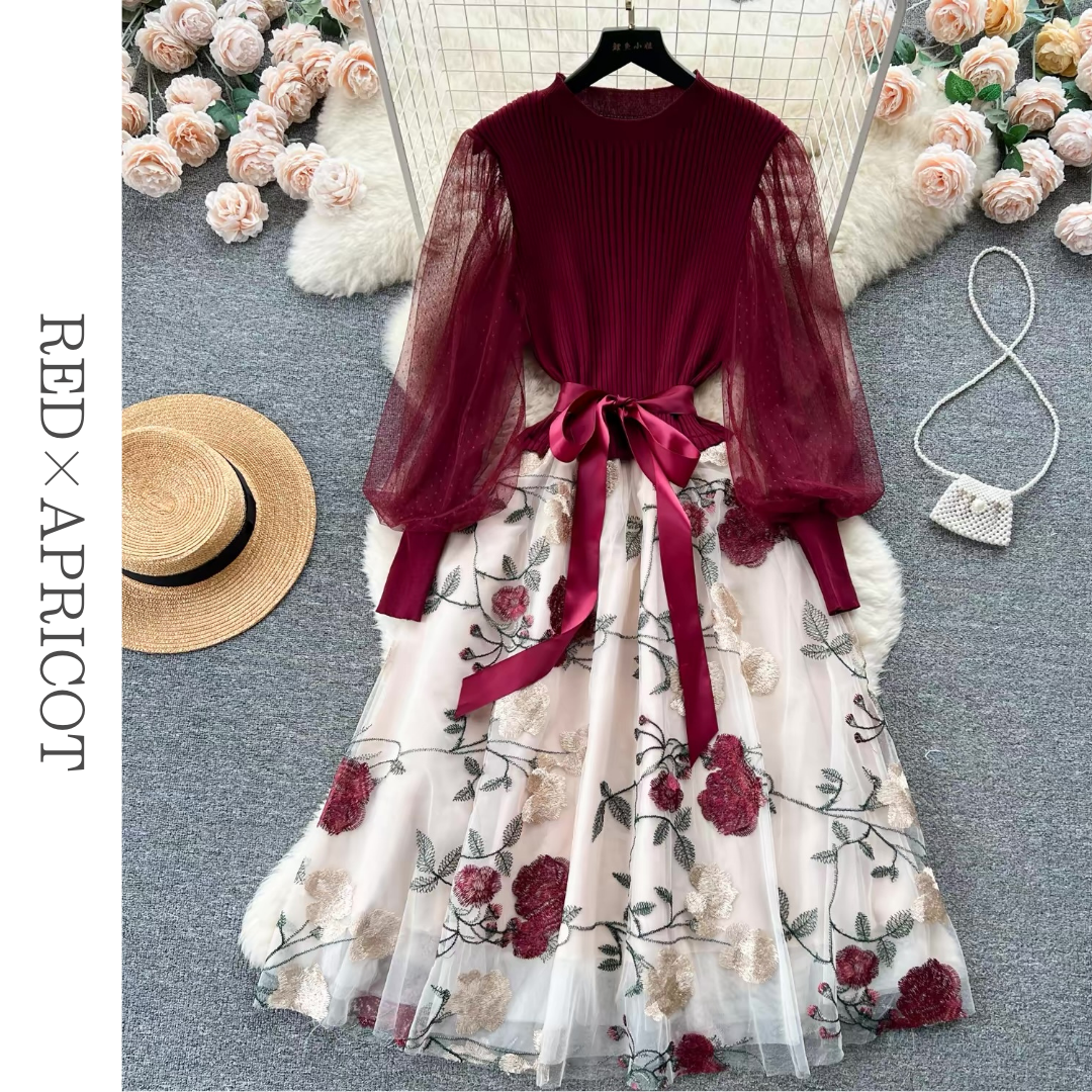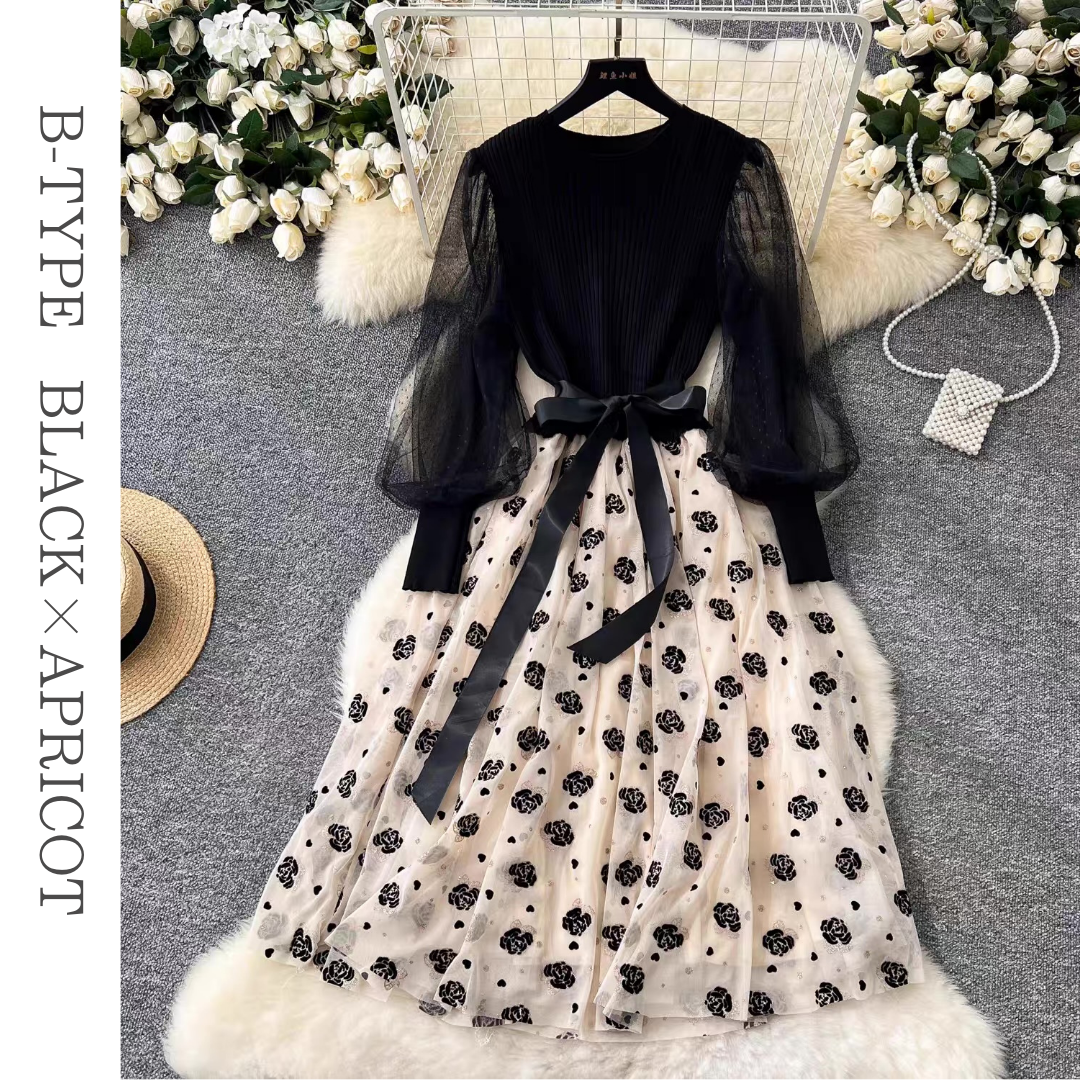 リブニットトップと透け感のあるボリュームスリーブが印象的なドレス。立体感のあるフラワー刺繍チュールスカートとウエストリボンが華やかなアクセントになります。ふんわり広がるシルエットが上品な雰囲気を引き立てる一着です。