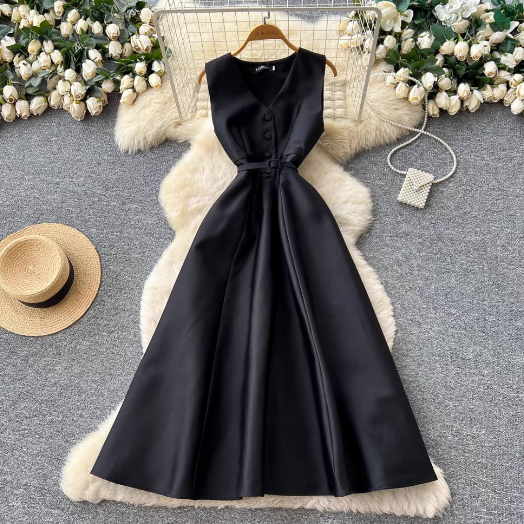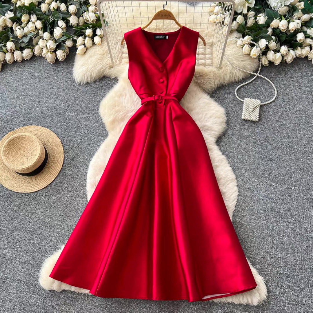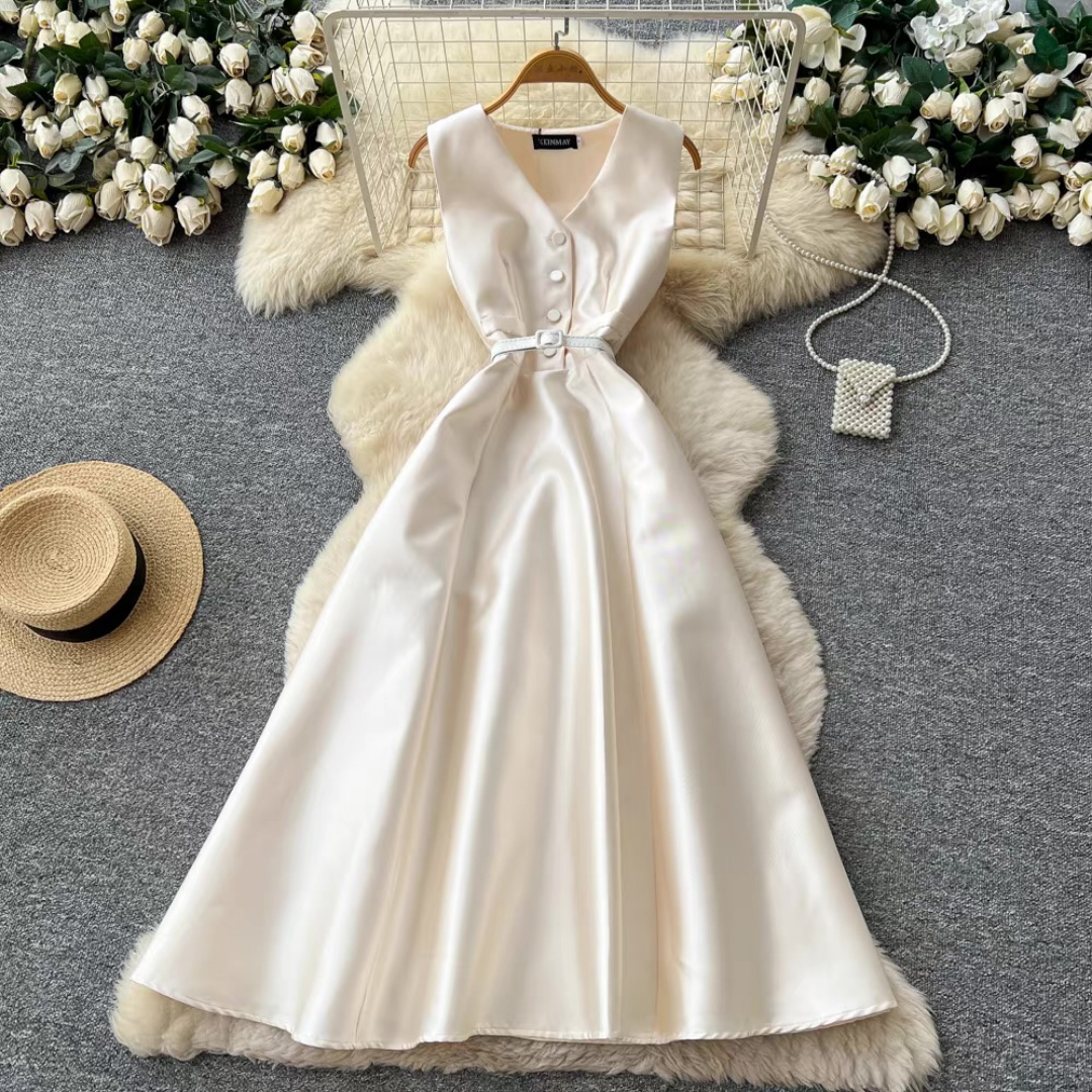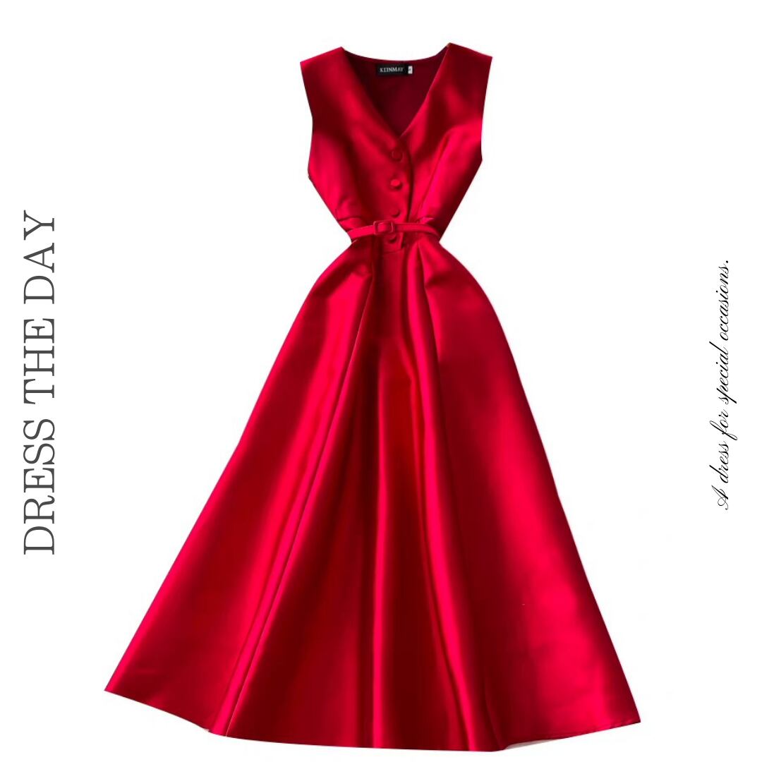 程よい光沢感のある素材が上品な印象を与えるノースリーブロングドレス。Vネックとフロントボタンが縦ラインを強調し、共布ベルトでメリハリのあるシルエットに整えます。歩くたびに揺れるボリュームスカートが華やかな存在感をプラスする一着です。