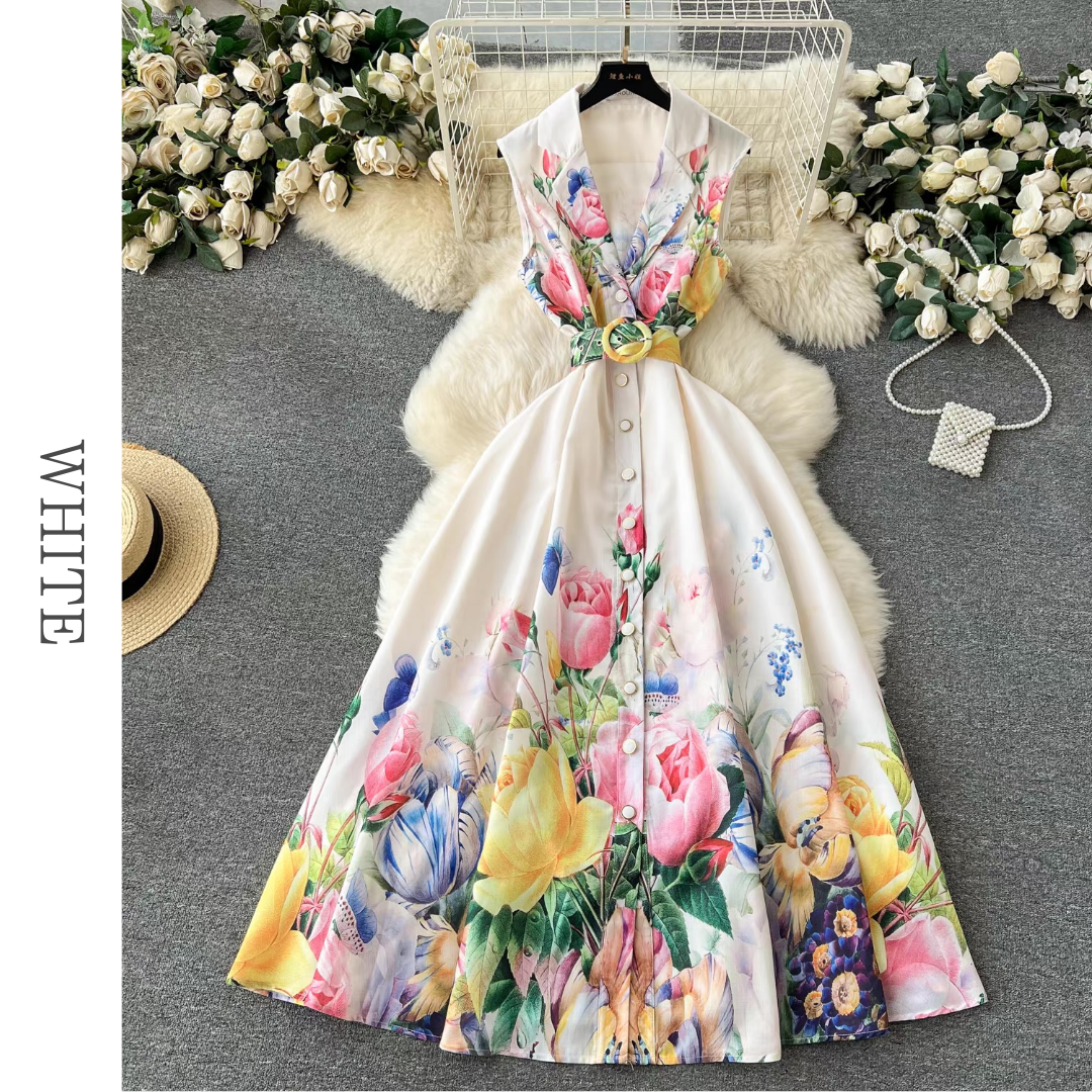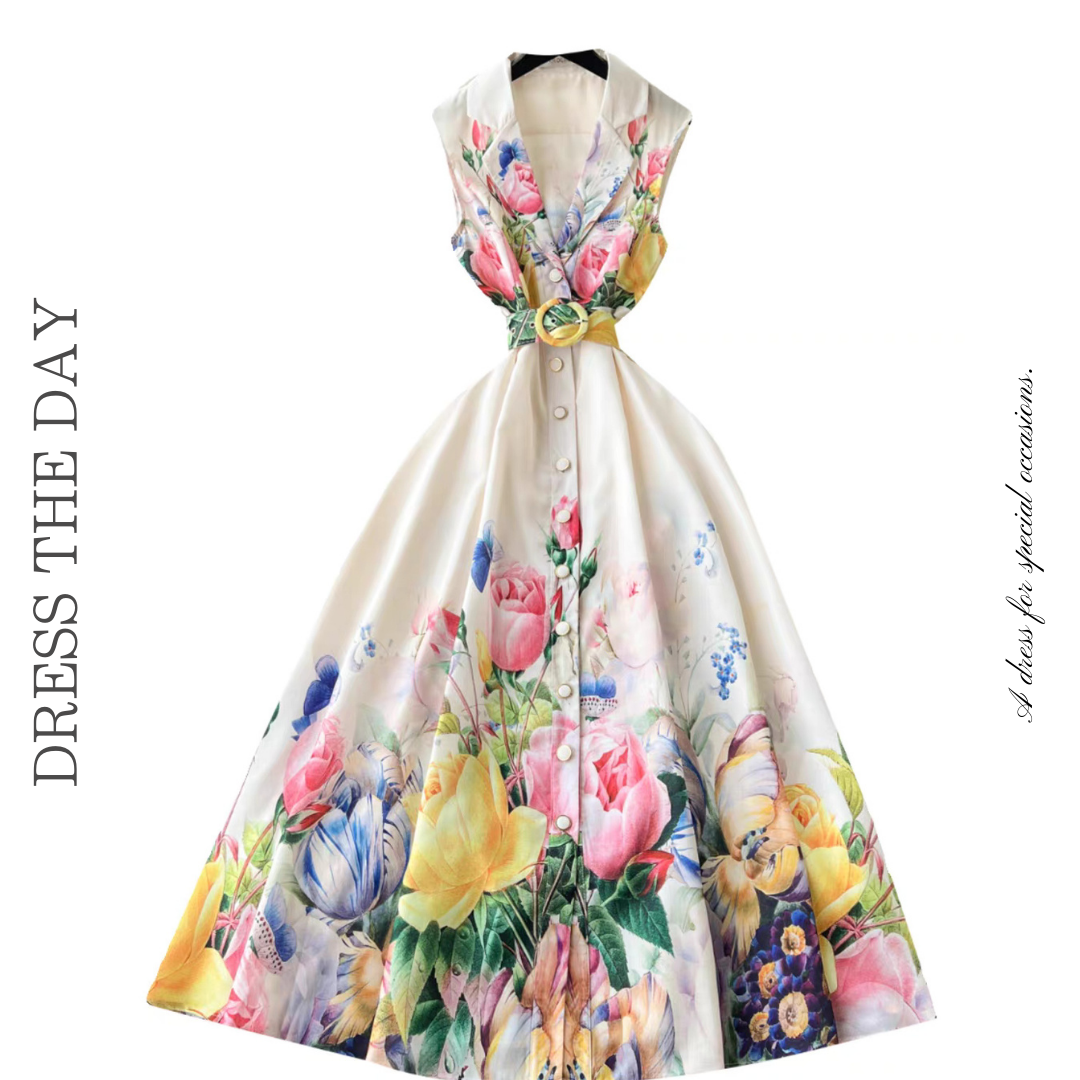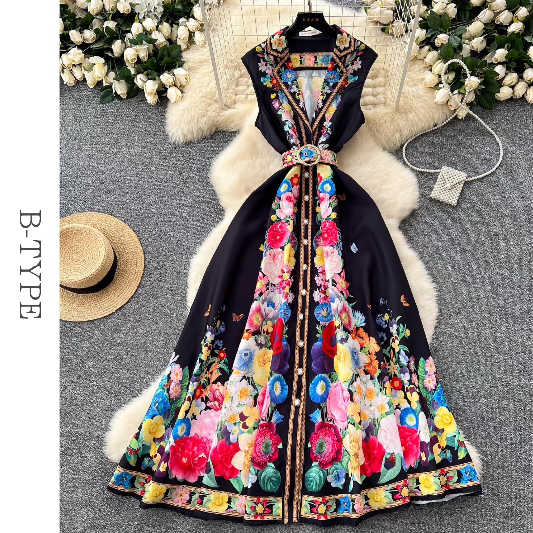 鮮やかなボタニカルプリントが目を惹く存在感のあるロングドレス。深めのVネックと縦に並んだボタンデザインがすっきりとした印象を与え、ウエストベルトがシルエットにメリハリをつけます。華やかな柄使いと広がりのあるスカートラインが装いを印象的に仕上げる一着です。