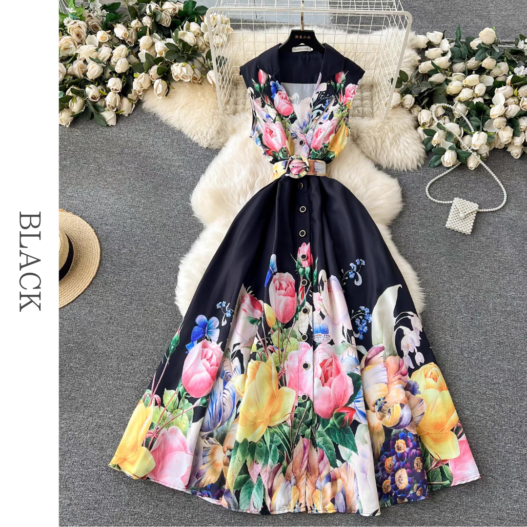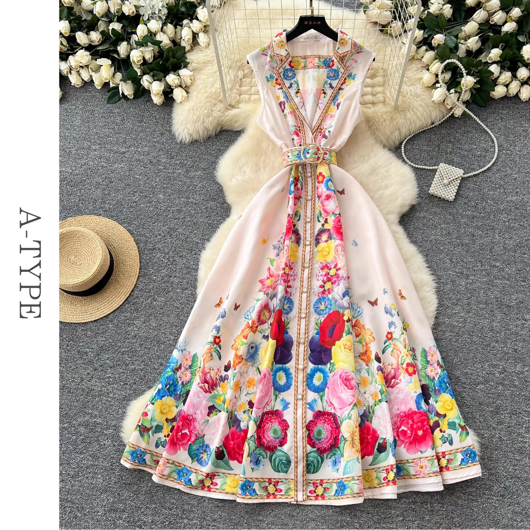 ボタニカルアートベルトロングドレス 7色展開 D0239