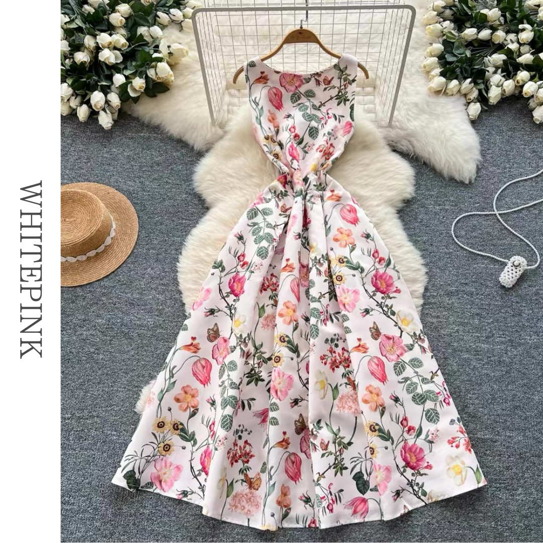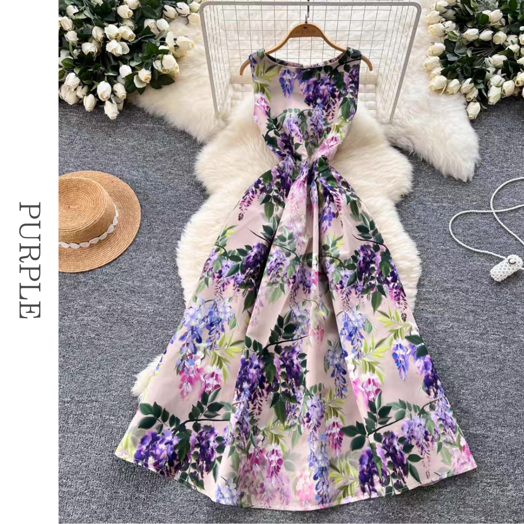 華やかな花柄を全面にあしらったノースリーブロングドレス。ウエスト切り替えが自然なメリハリを生み、裾に向かって広がるフレアシルエットが軽やかな印象にまとめます。豊富なカラーバリエーションから選べる、デイリーにもお出かけにも取り入れやすい一着です。