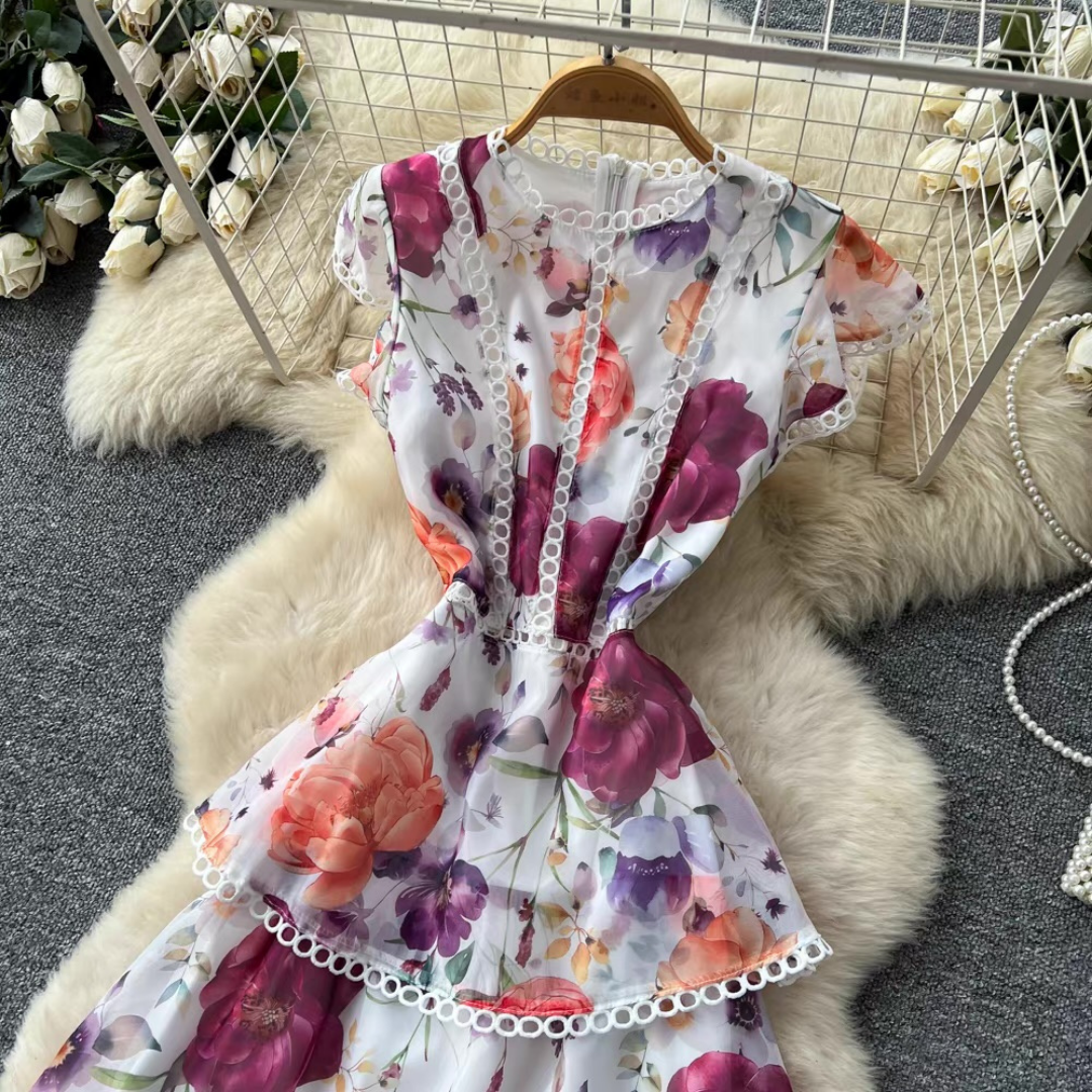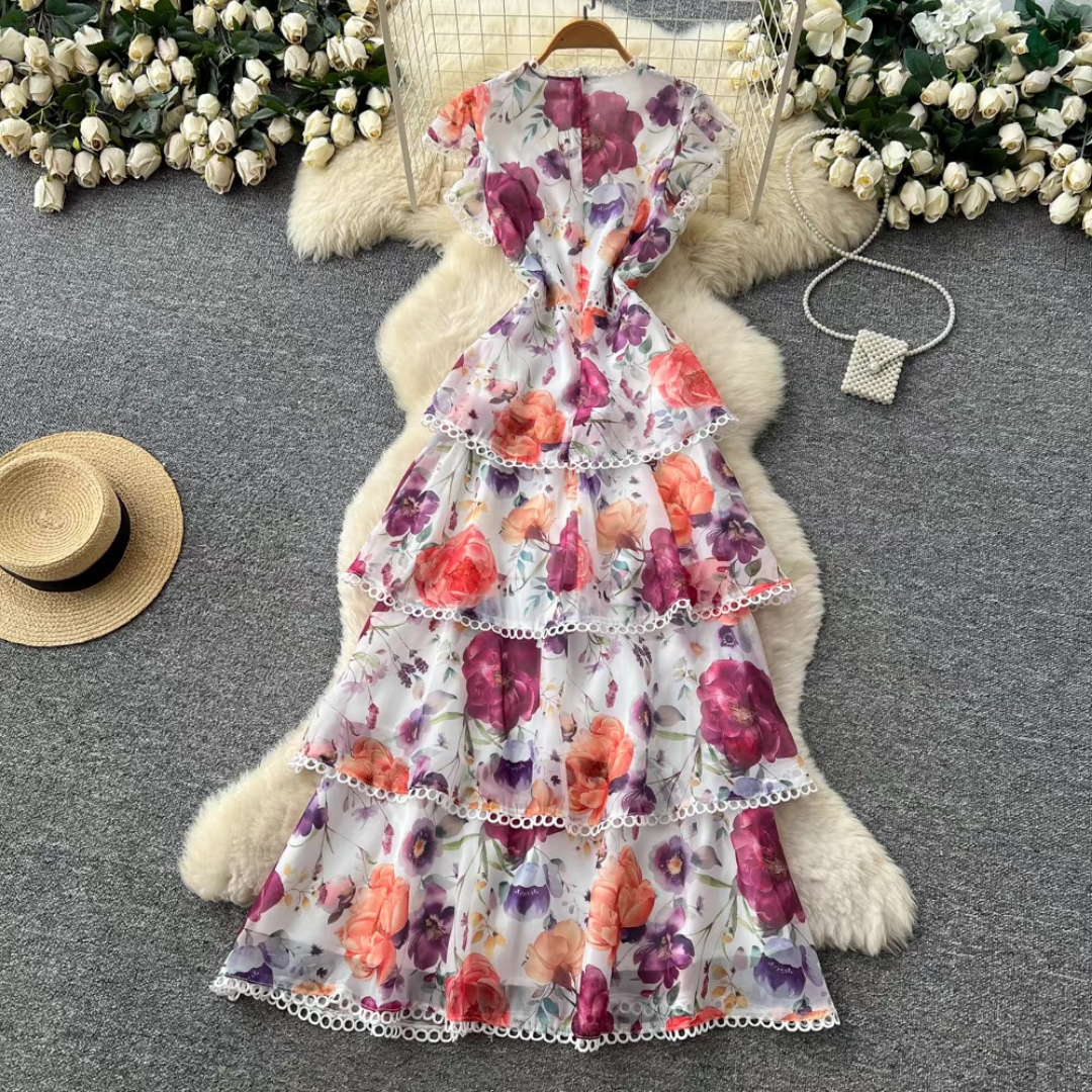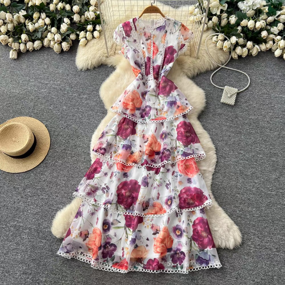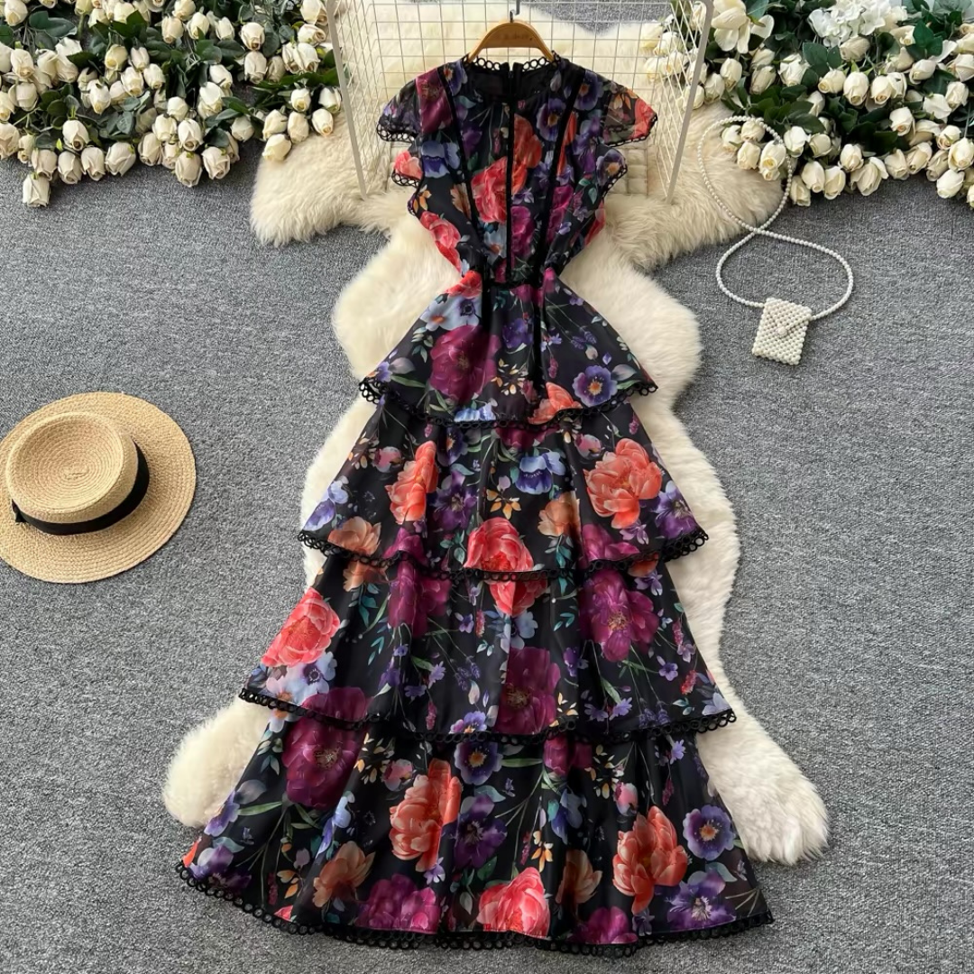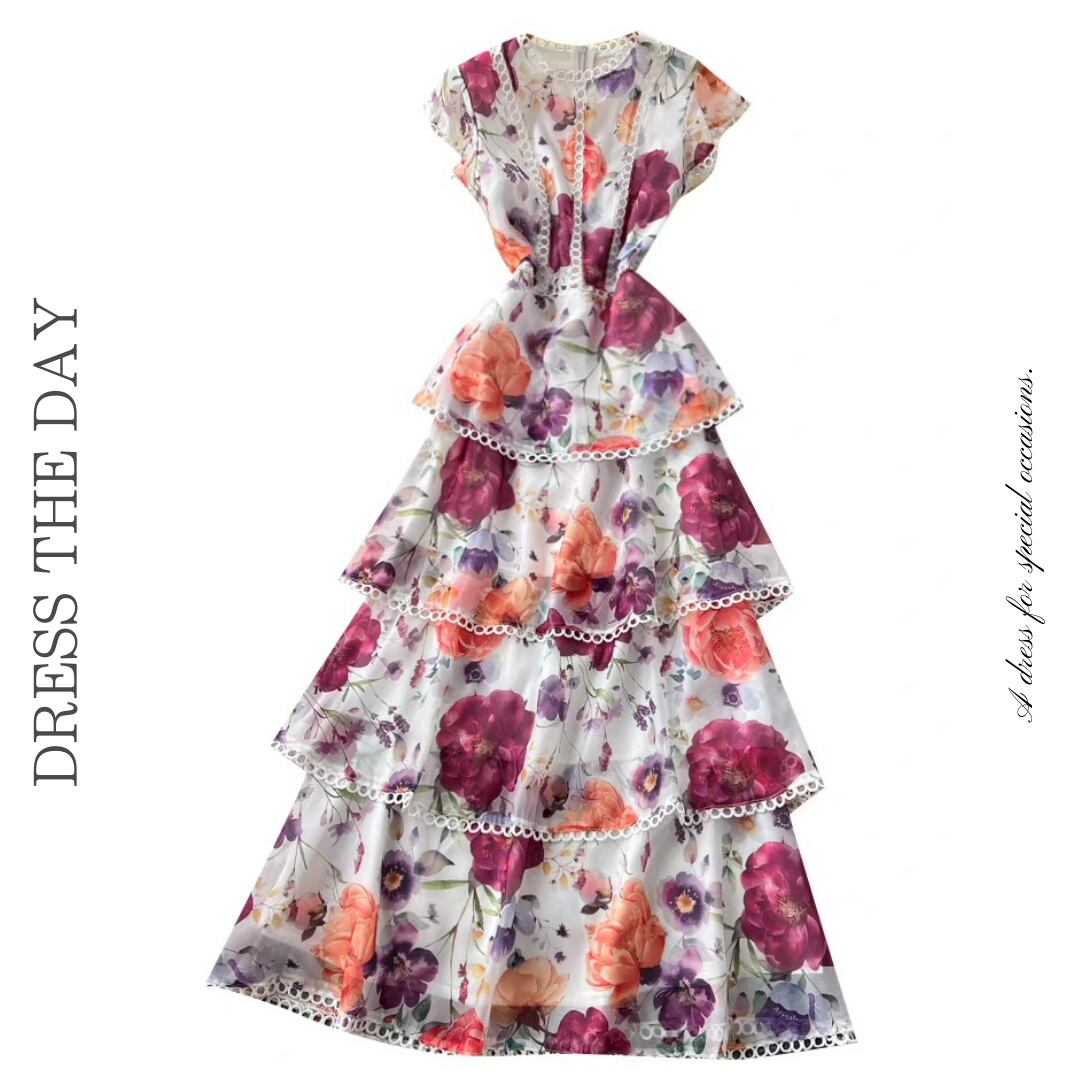 やわらかな花柄プリントが目を惹くティアードデザインのロングドレス。段ごとにあしらわれたレーストリムと軽やかなフレンチスリーブが、程よい華やかさをプラスします。動きに合わせて揺れるシルエットが女性らしい印象にまとまる一着です。