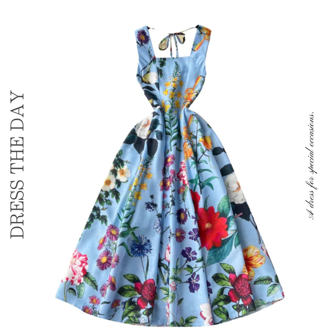 鮮やかなフラワープリントが目を惹く、スクエアネックデザインのフレアドレス。程よくハリのある生地感と立体的なタックが、美しく広がるシルエットを描きます。バックリボン仕様がさりげないアクセントとなり、華やかな印象に仕上げる一枚です。