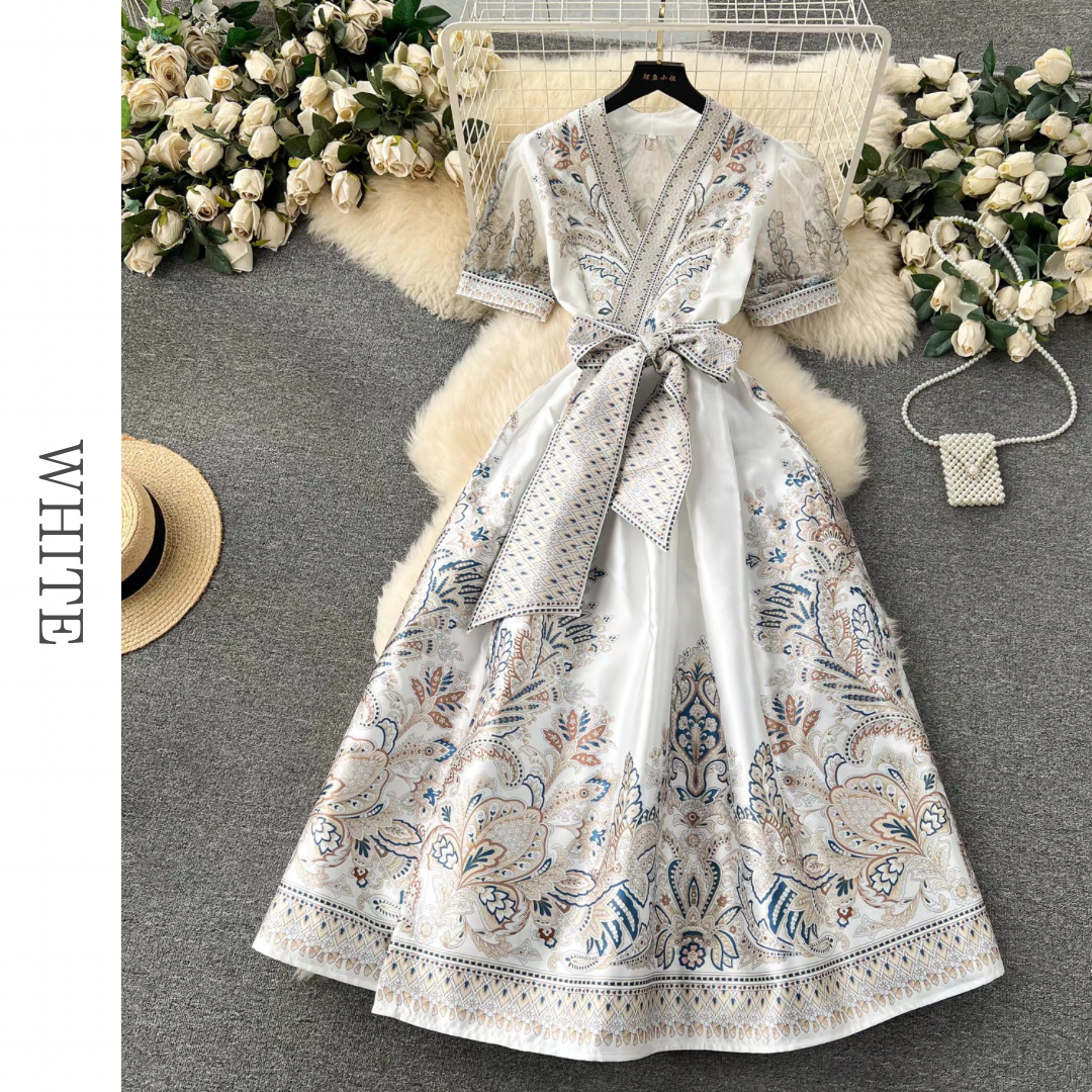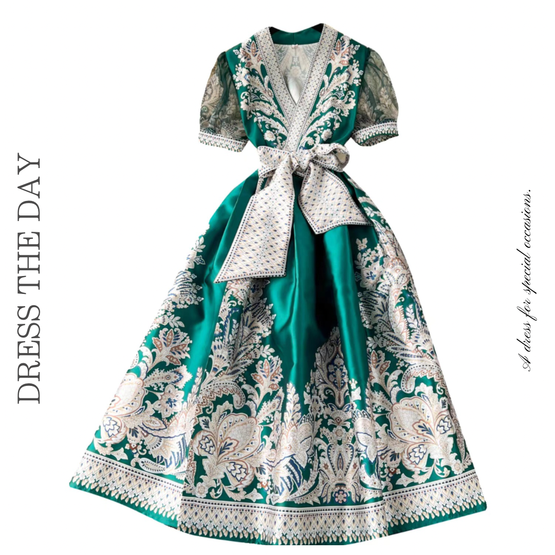 クラシカルなペイズリー柄が全面に広がるロングドレス。Vネックラインとウエストリボンがメリハリのあるシルエットをつくり、自然と華奢見えを叶えます。シアー素材のボリュームスリーブと贅沢なフレアシルエットが存在感を放つ一枚です。