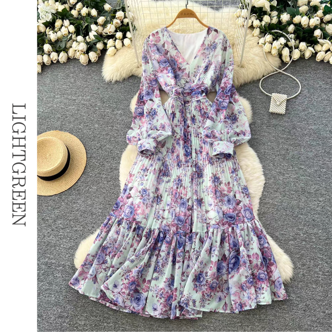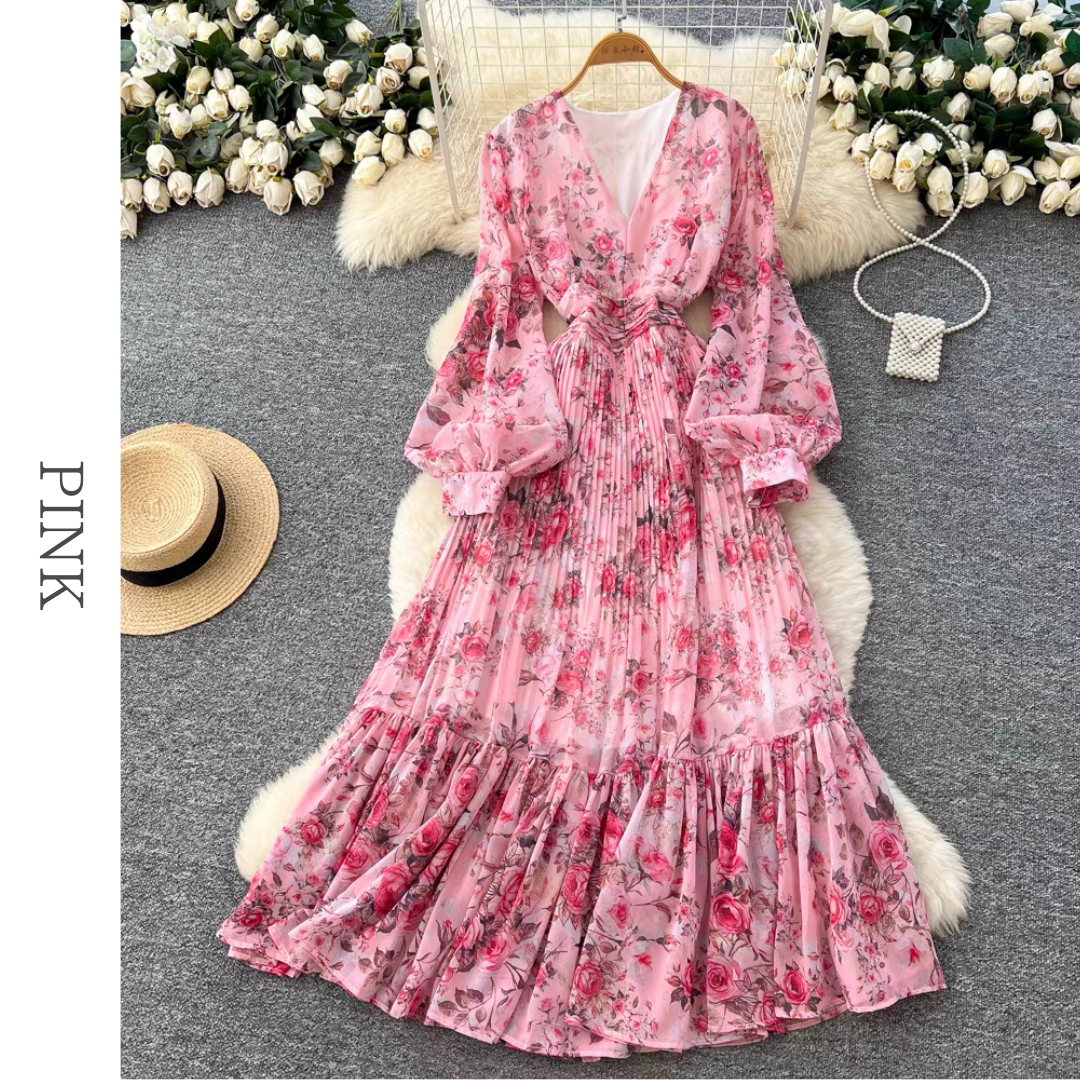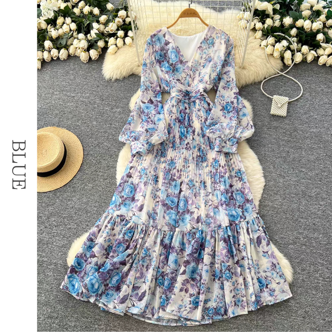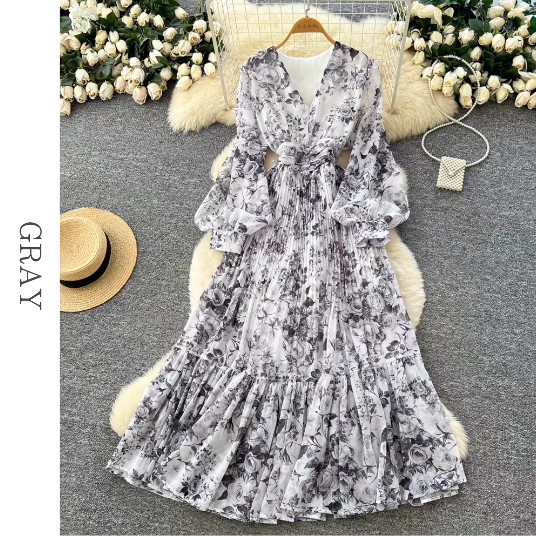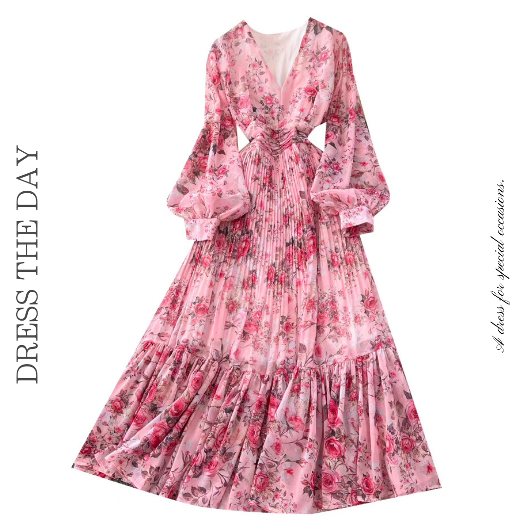 華やかなフラワープリントが目を惹くロングドレス。Vネックとシャーリングウエスト、バックリボンが立体感のあるシルエットをつくり、細かなプリーツが上品さを引き立てます。軽やかなシフォン素材で、優雅な雰囲気をまとえる一枚です。