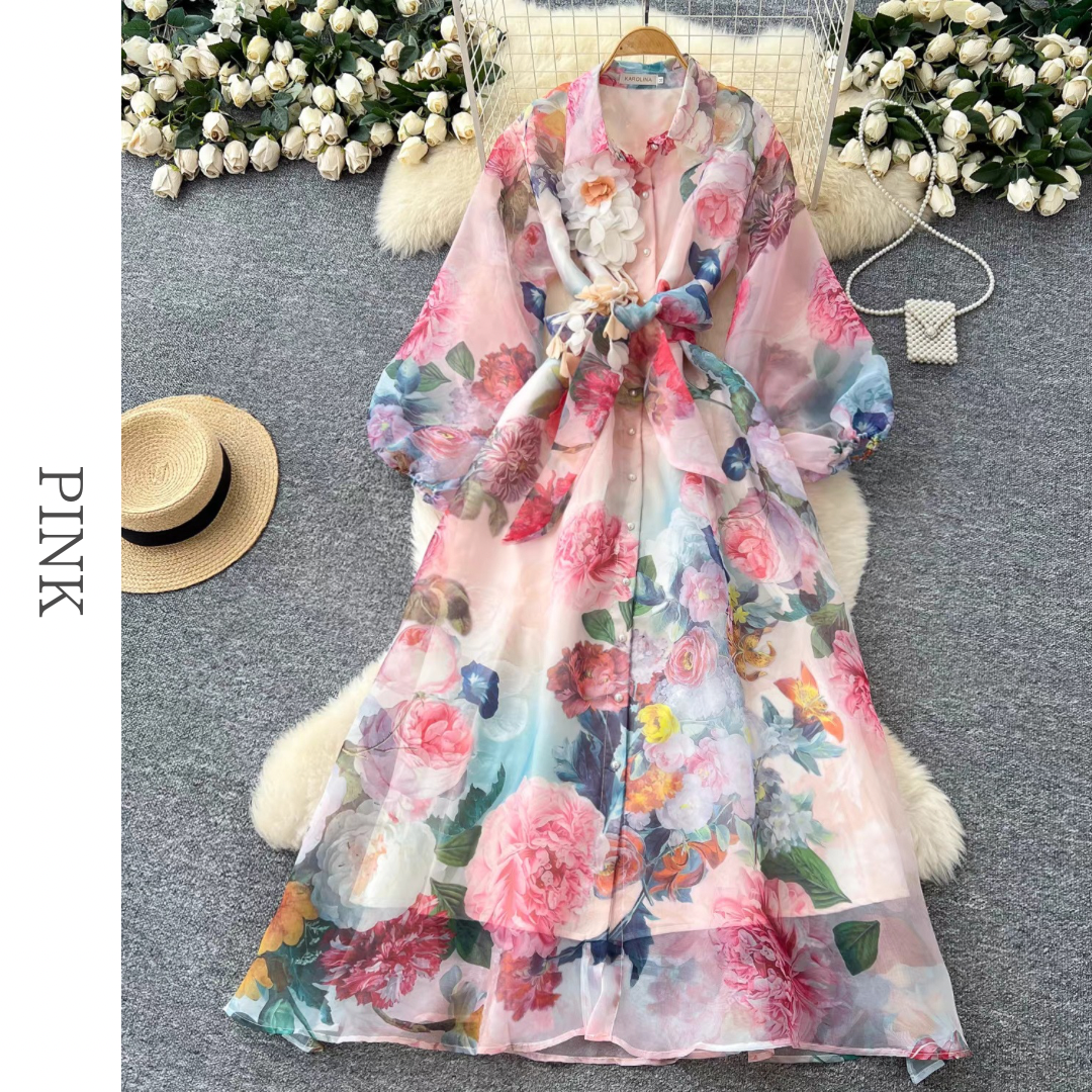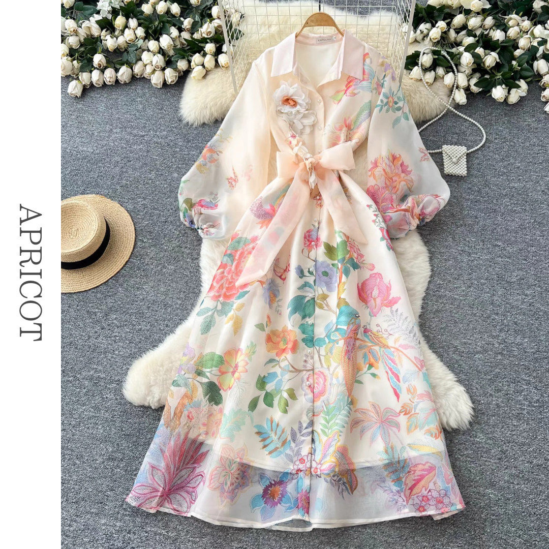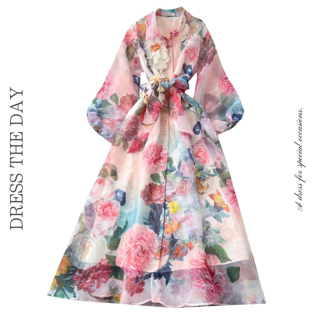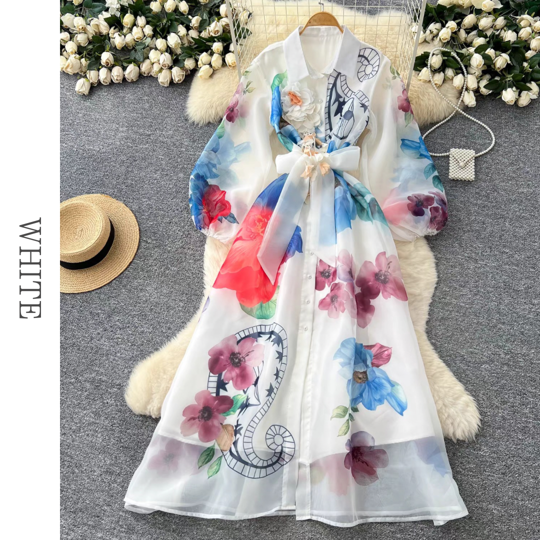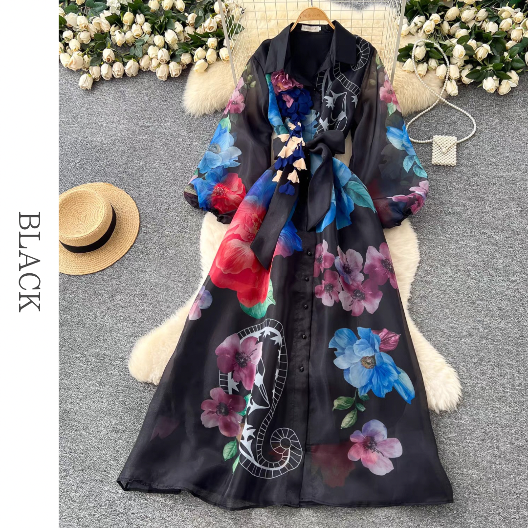 大胆なフラワープリントが目を惹くシアー素材のロングシャツワンピース。襟付きデザインとフロントボタン、ウエストリボンが全体のバランスを整え、立体的なコサージュが華やかなアクセントに。動きのあるシルエットが印象を高める存在感のある一枚です。