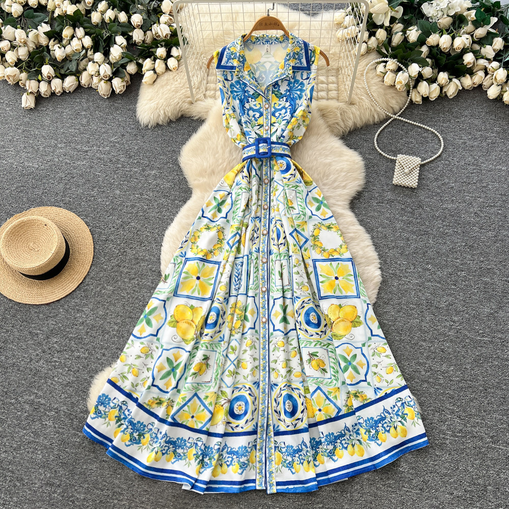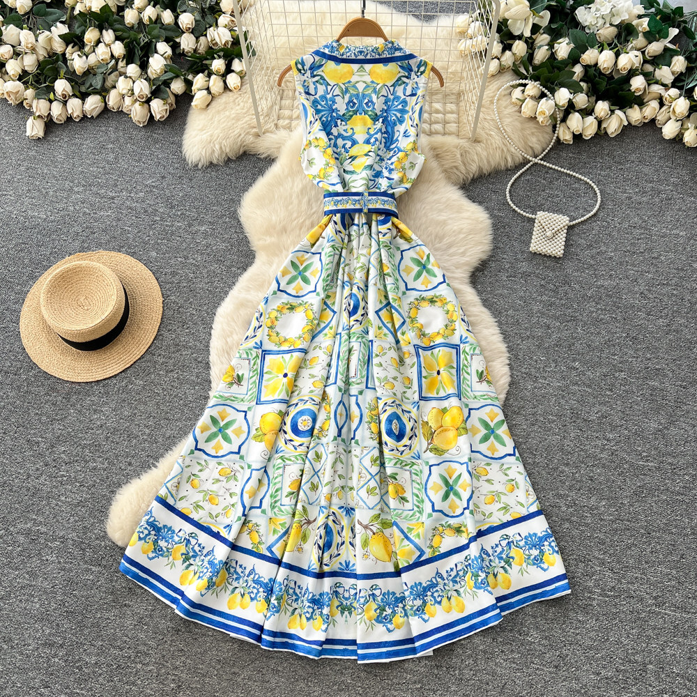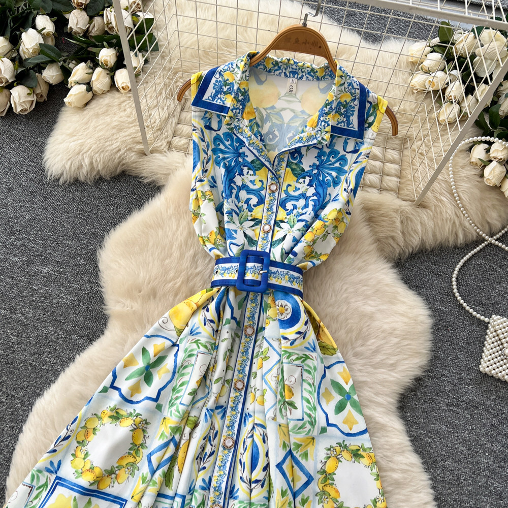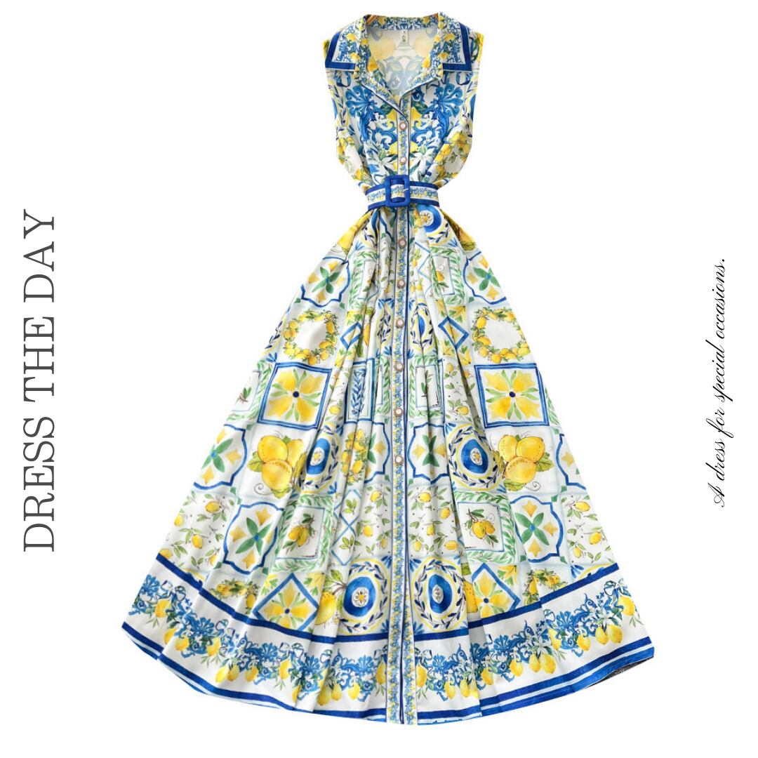 レモンやタイル柄を組み合わせたプリントデザインのワンピース。ウエストベルト付きで、シルエットを調整できます。フロントボタン仕様で着脱しやすく、ノースリーブと襟付きデザインでスッキリとした印象。スカート部分はボリュームのあるフレアシルエットです。