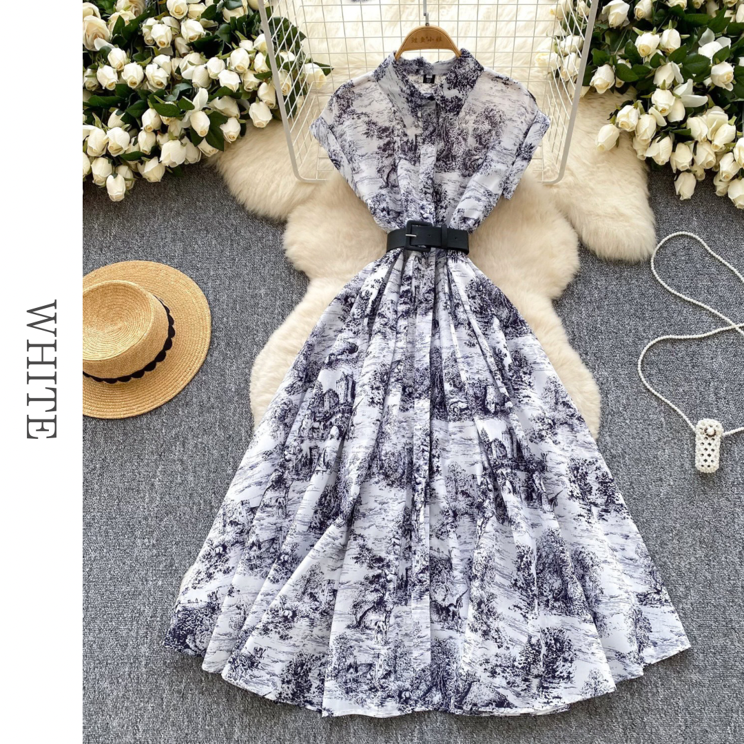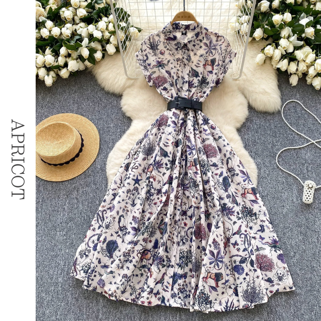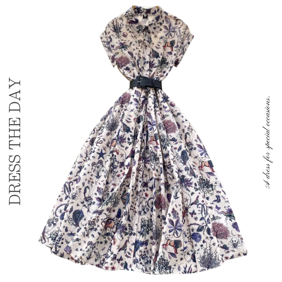 ボタニカルモチーフと動物モチーフを組み合わせた総柄デザインのシャツワンピース。ウエストベルトでシルエットにメリハリをつけ、ふんわり広がるフレアラインが女性らしい印象を引き立てます。コーディネートの主役になる存在感のある一枚です。