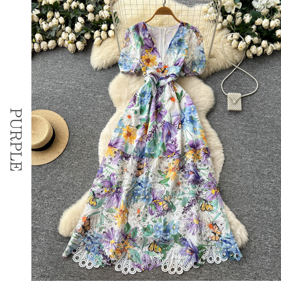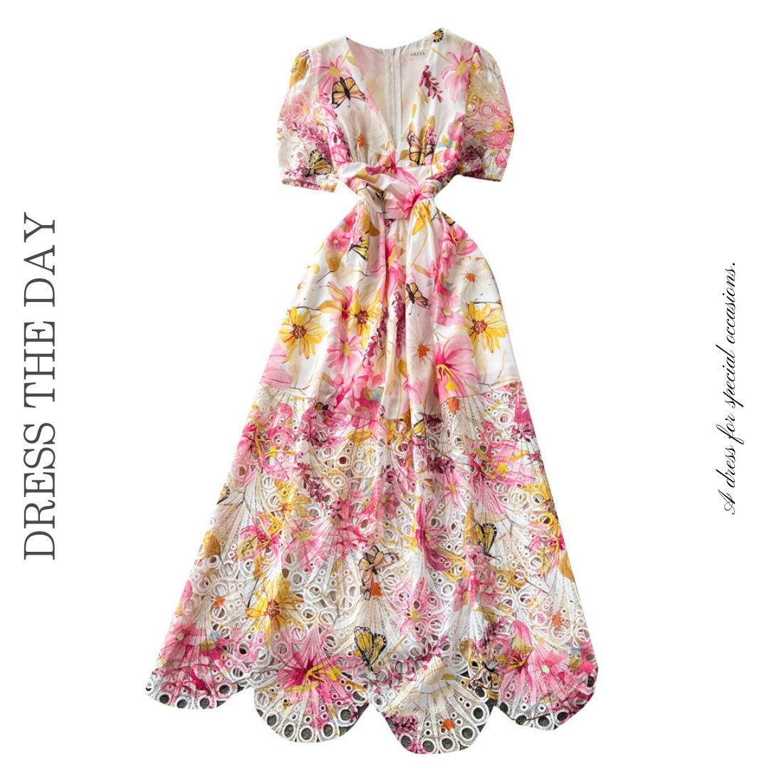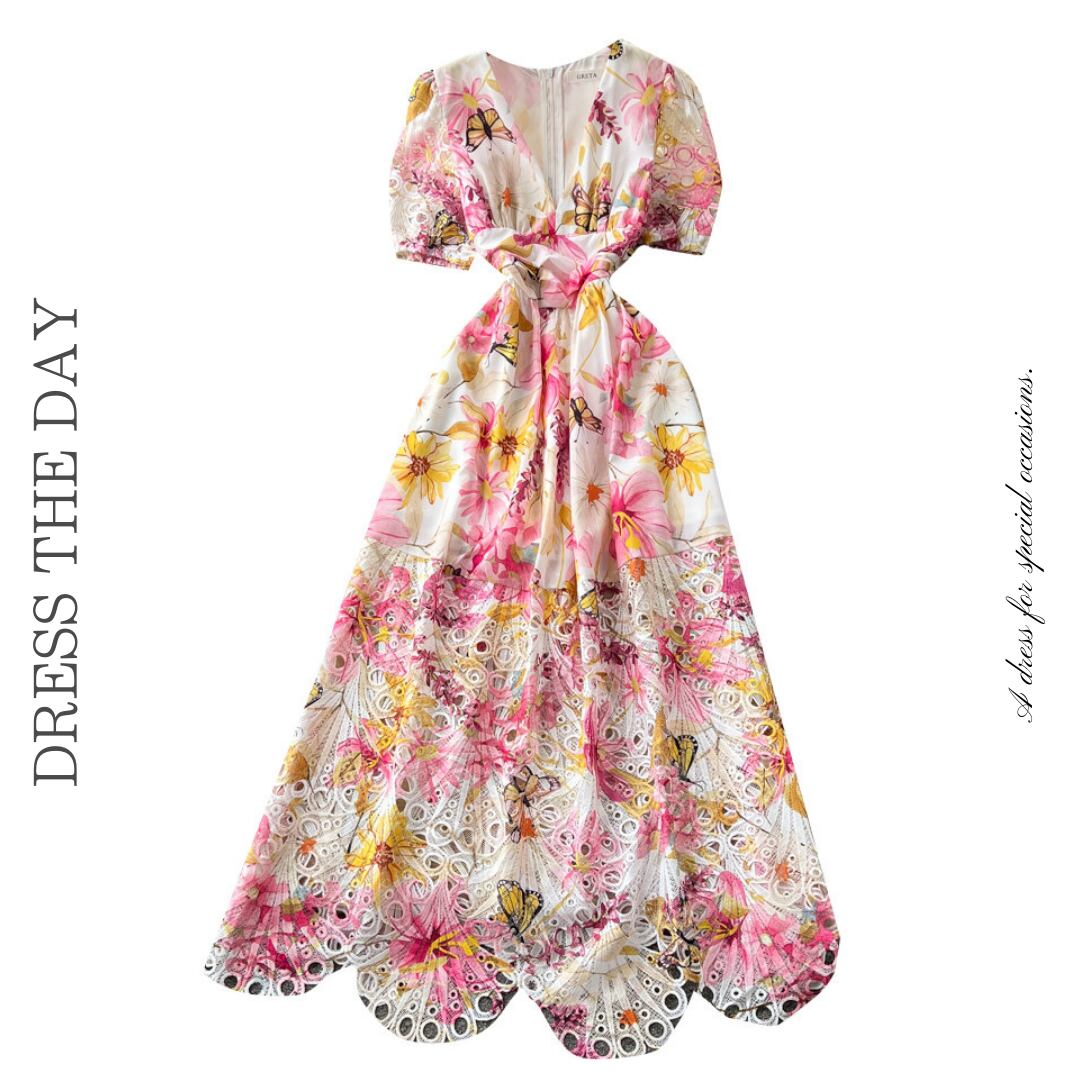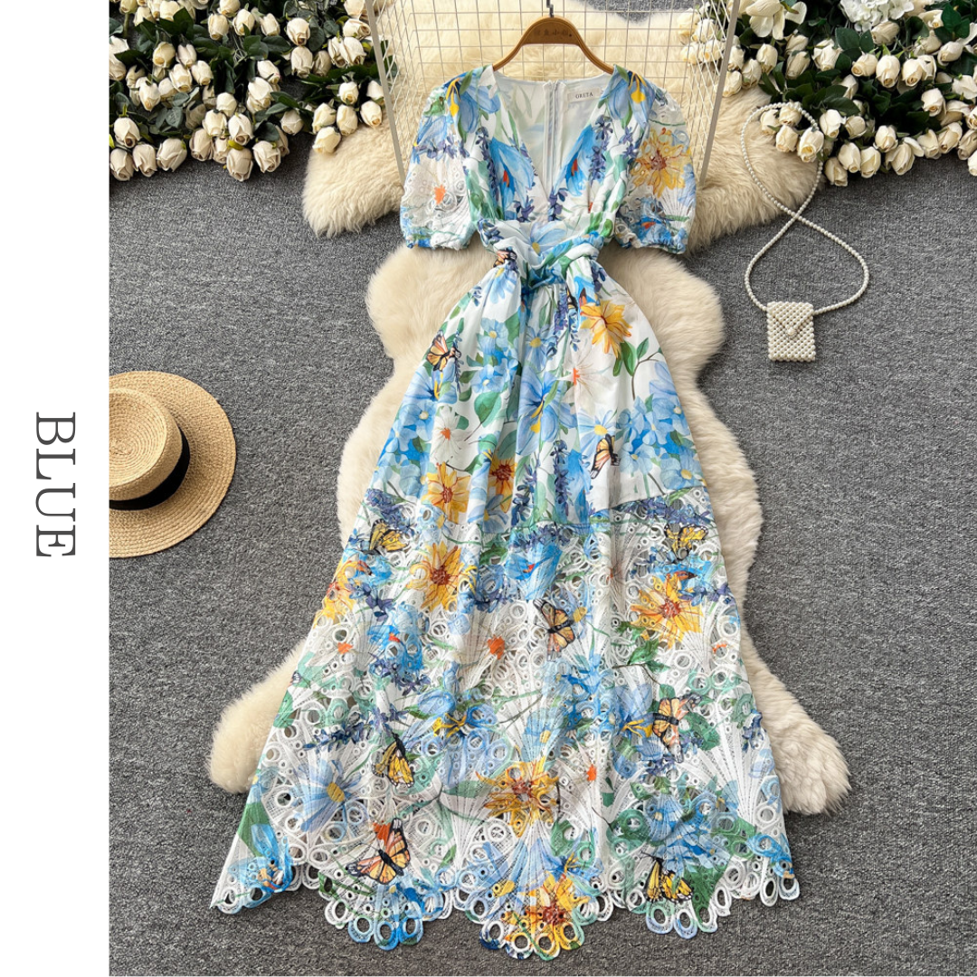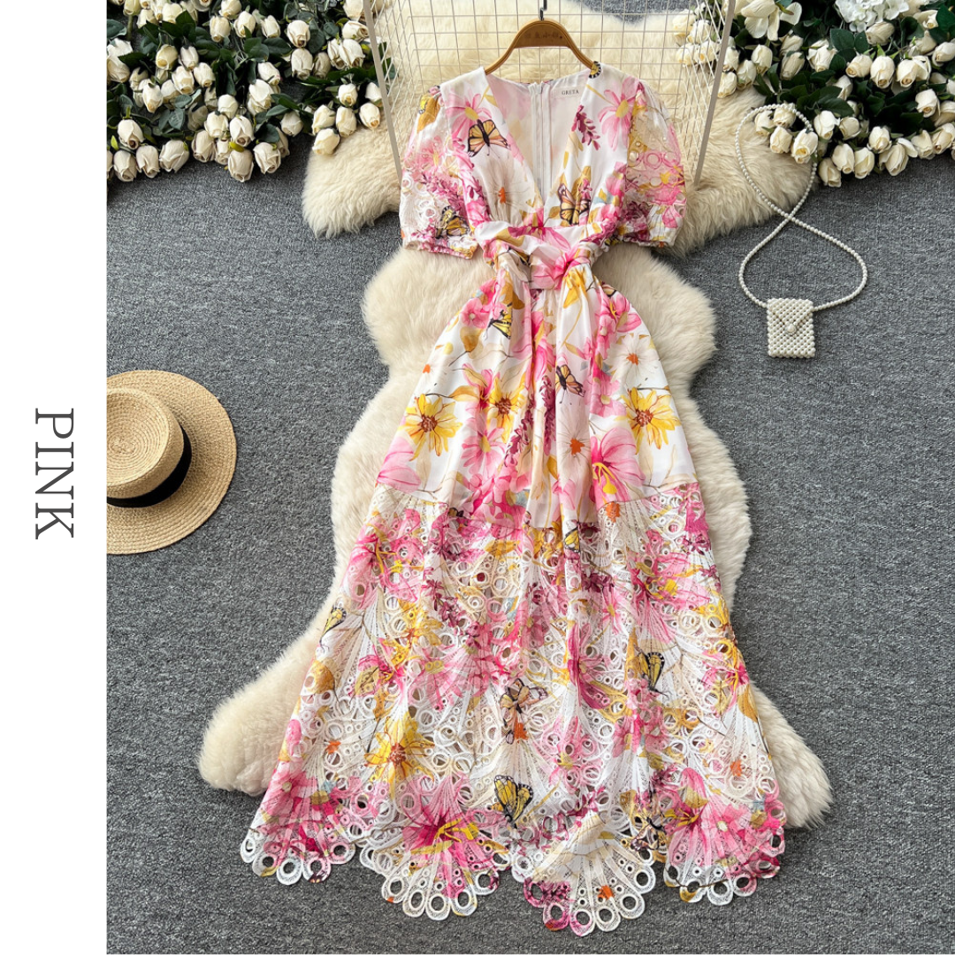 フラワーバタフライレースヘムフレアワンピース 3色展開 D0278