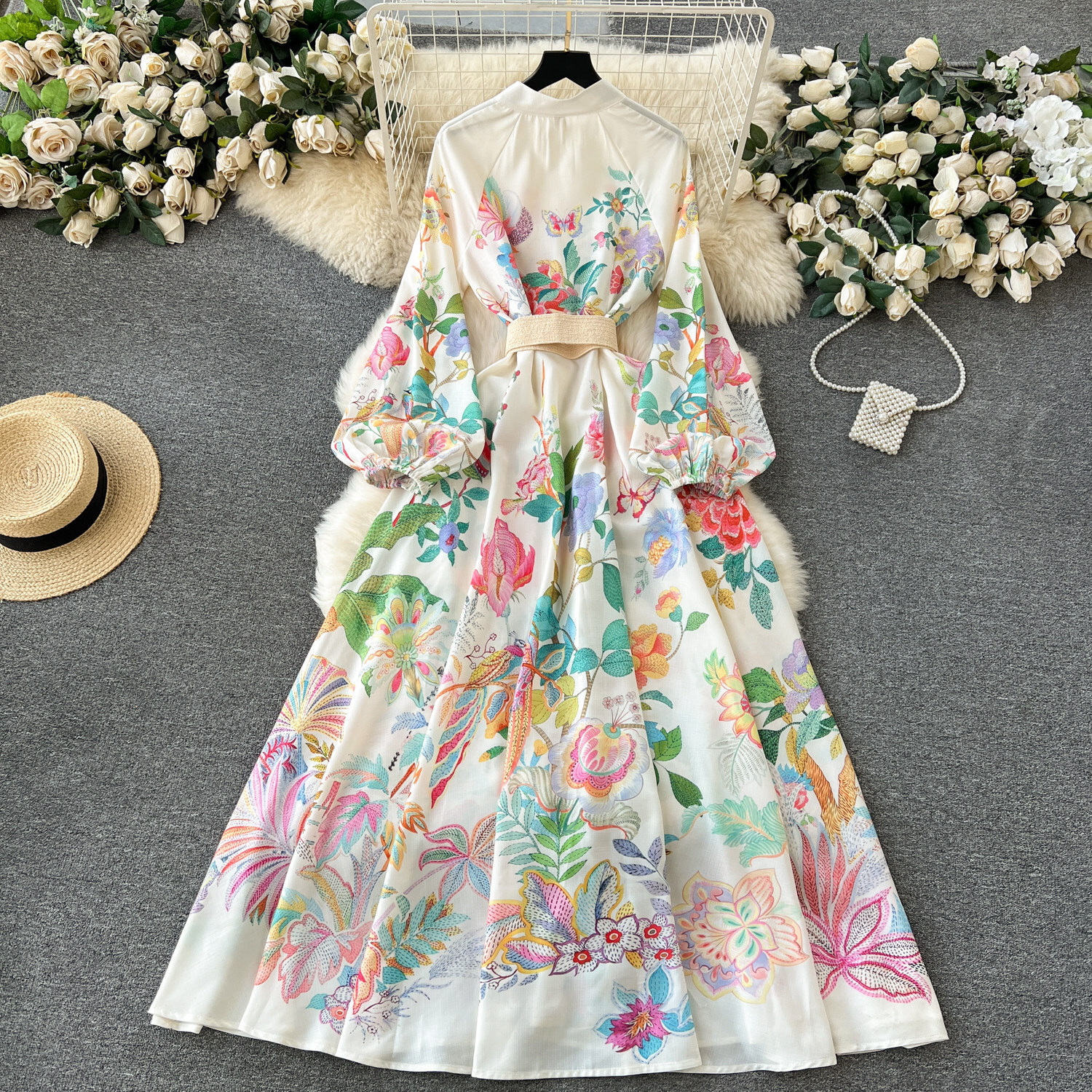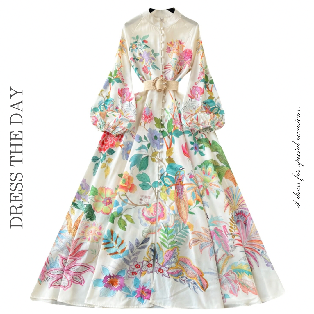 色彩豊かなボタニカルフラワープリントが華やかな存在感を放つロングワンピース。ウエストベルトがシルエットを引き締め、ふんわり広がるフレアラインが女性らしい印象を演出。存在感のある総柄デザインがコーディネートを華やかに彩る一枚です。