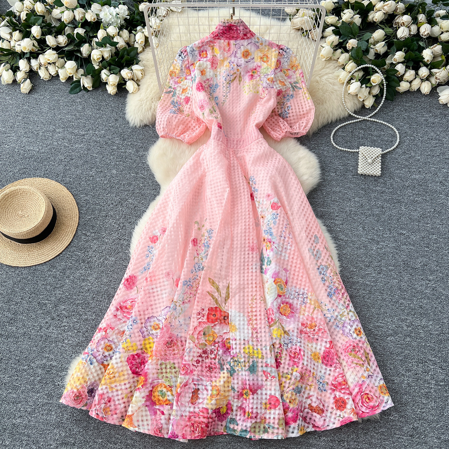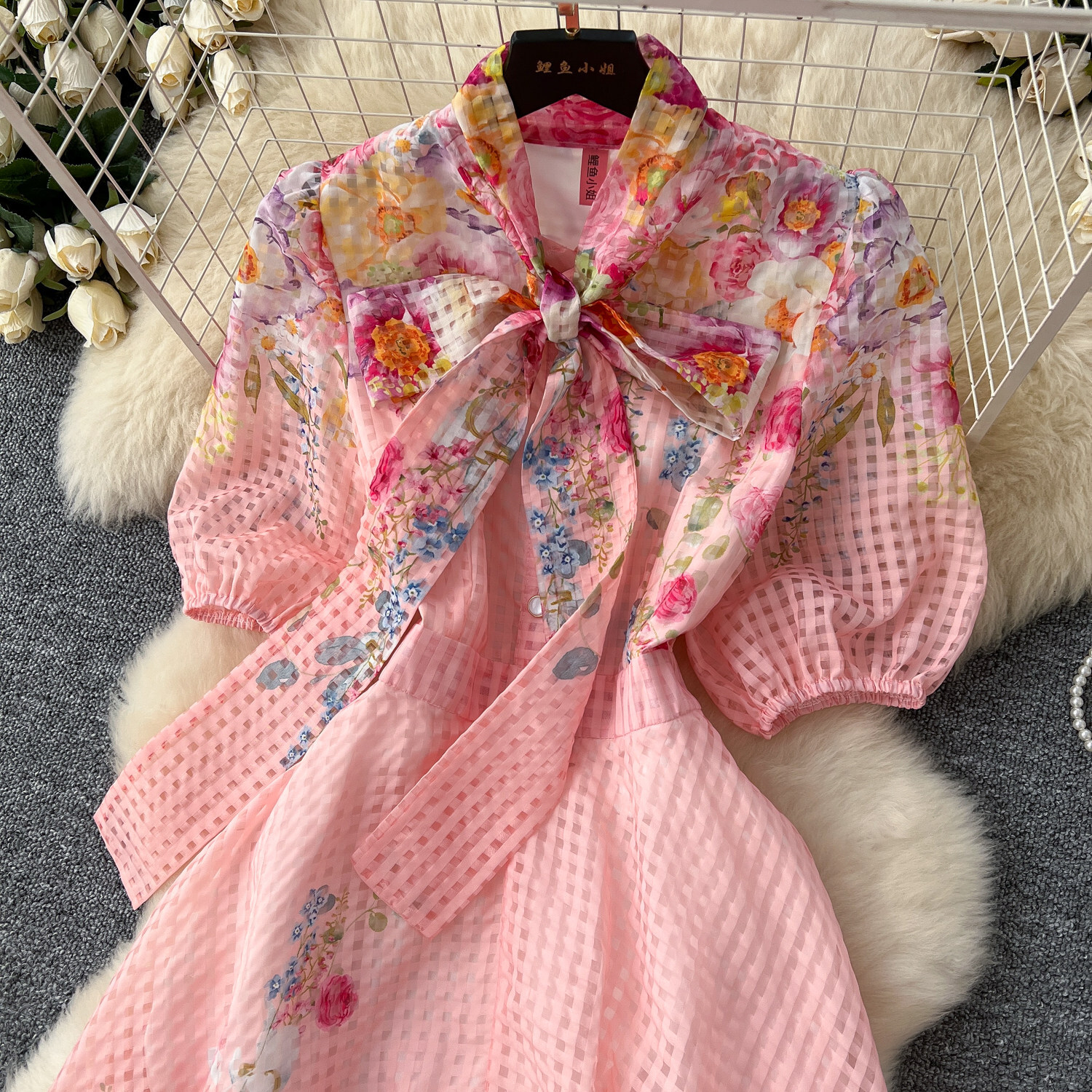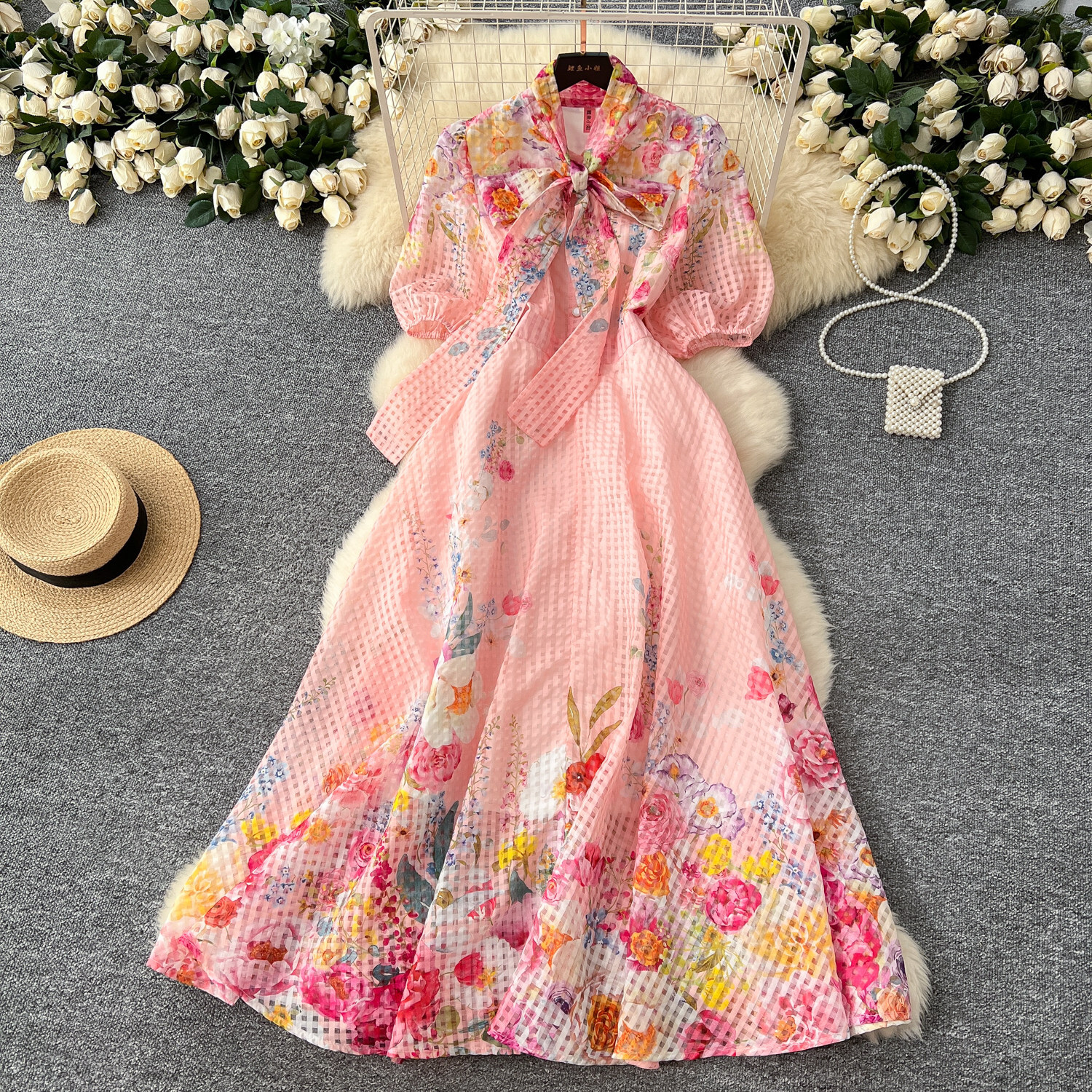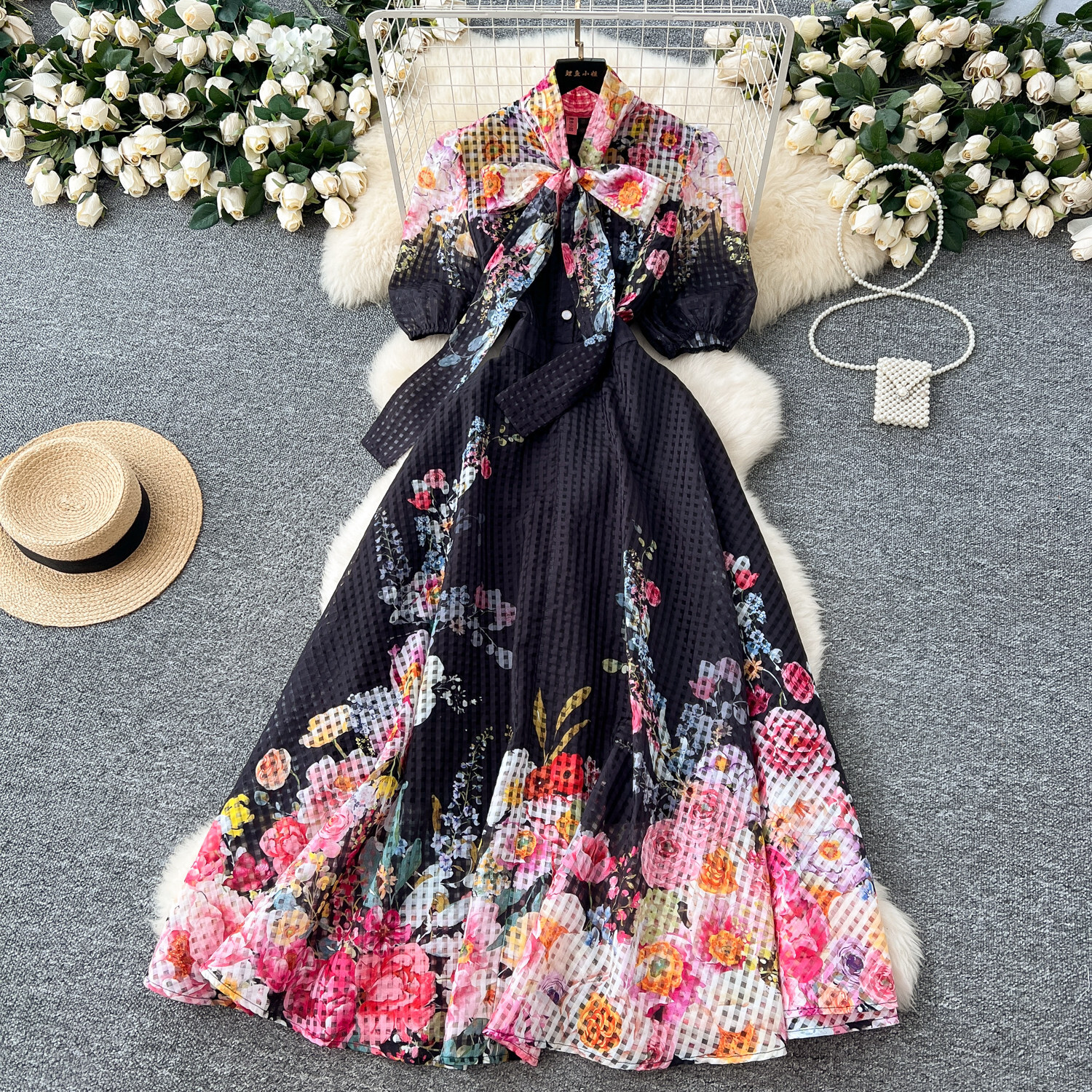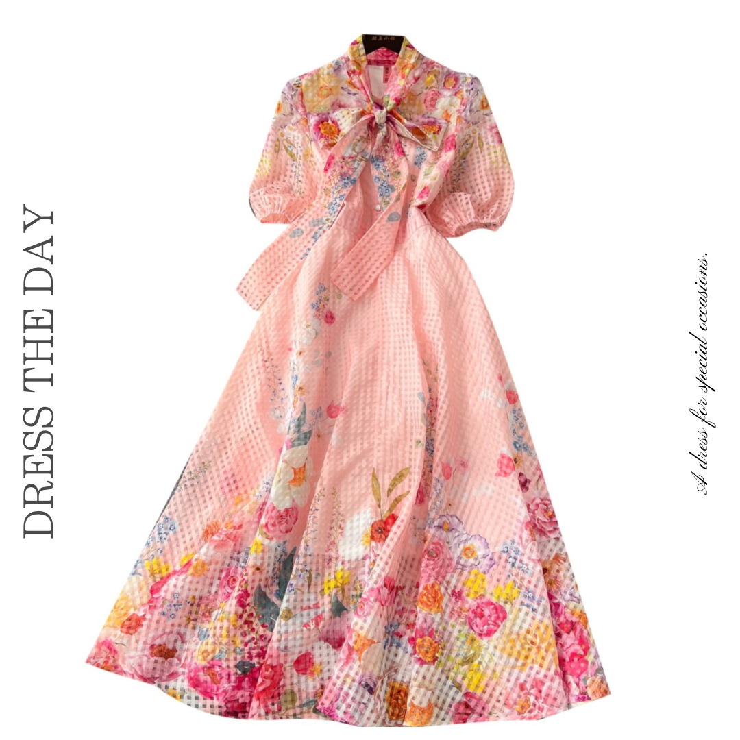 華やかなフラワープリントが広がるロングワンピース。ボウタイリボンとウエストベルトがアクセントになり、メリハリのあるシルエットを演出。シアー素材のスリーブとふんわり広がるスカートが軽やかな雰囲気を引き立てる一枚です。