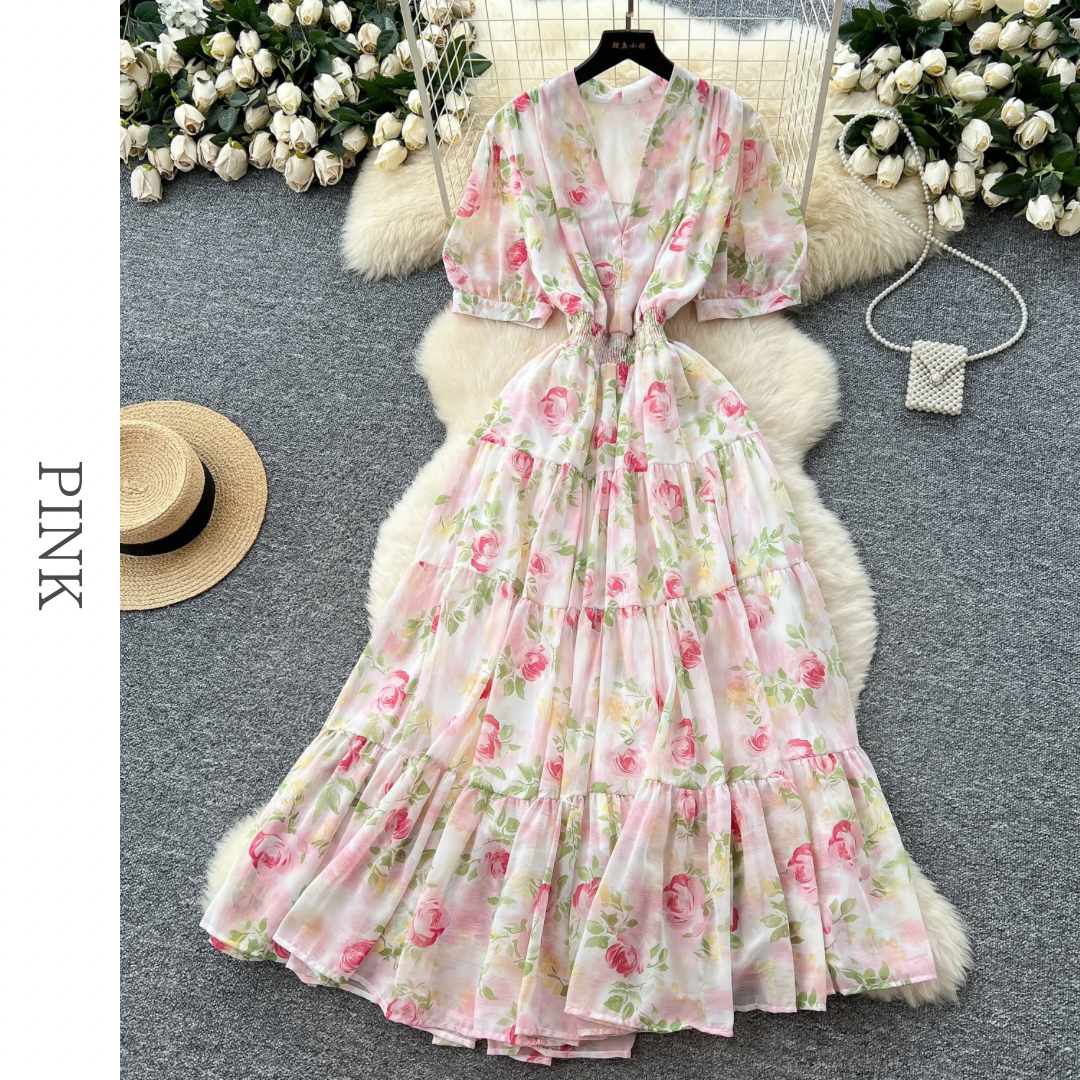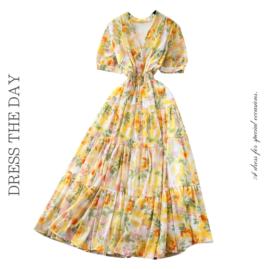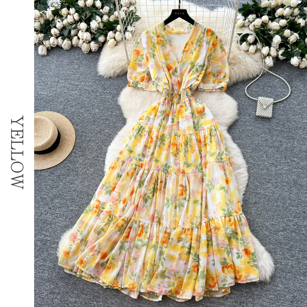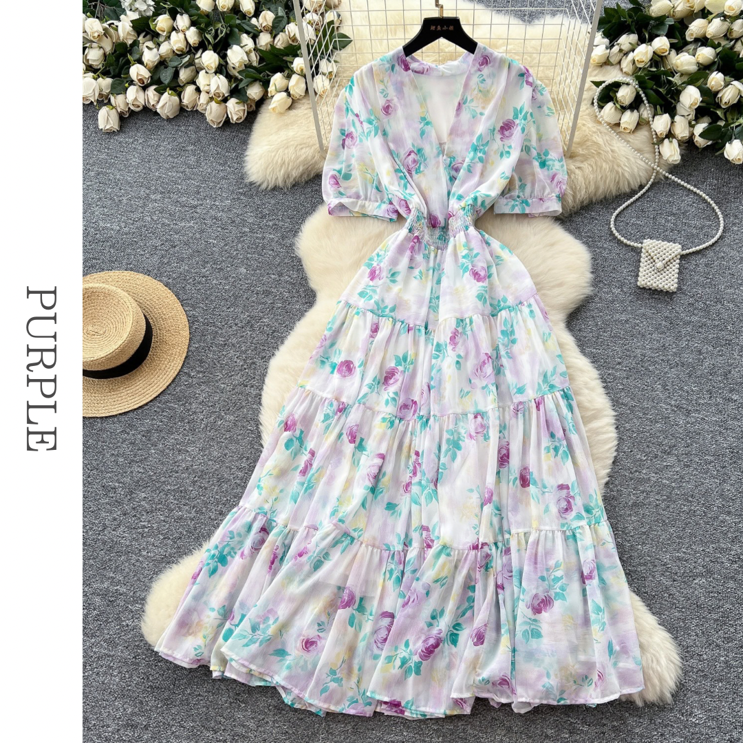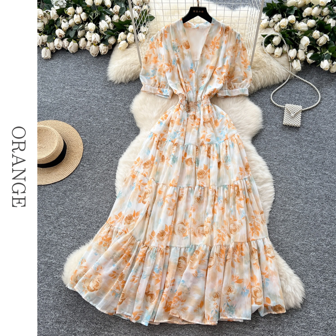 フラワープリントVネックティアードロングワンピース 6色展開 D0290