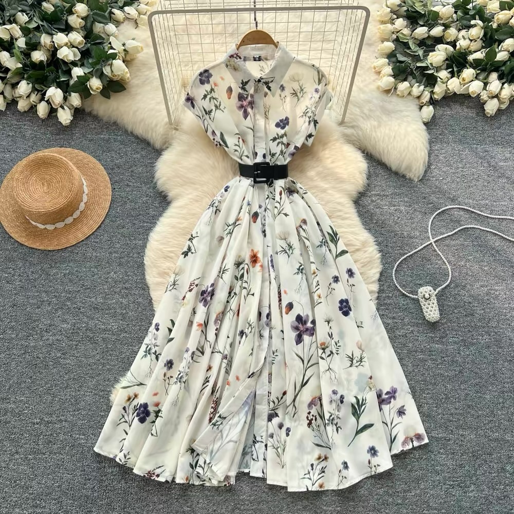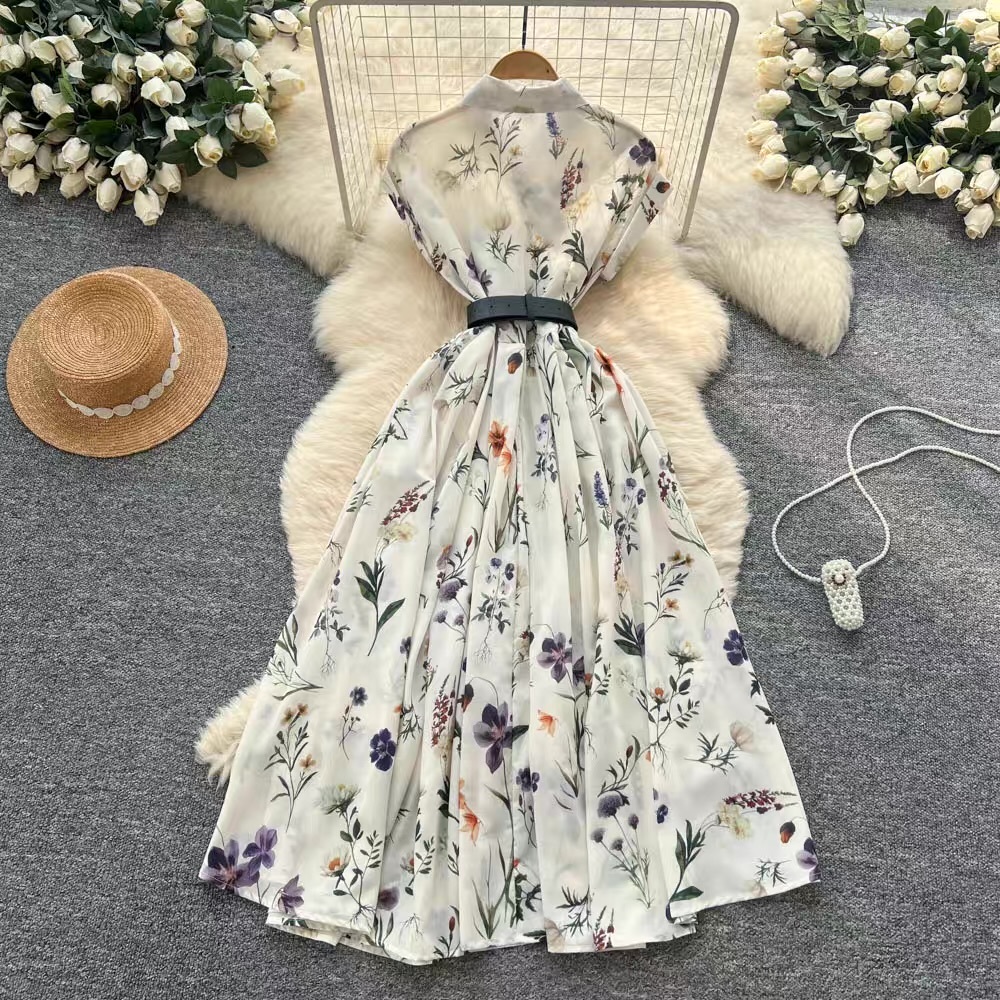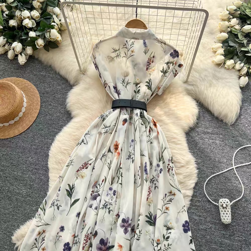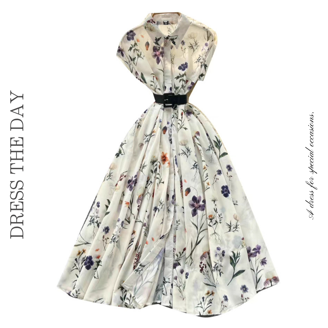 繊細なボタニカル柄を全体にあしらい、襟付きデザインで上品にまとめたドレス。フレンチスリーブと幅広ベルトがウエストを引き締め、広がりのあるフレアシルエットが華やかさを引き立てます。1枚で着映えする存在感のあるドレスです。