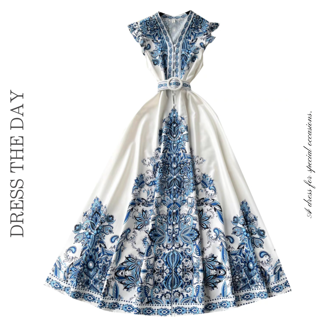 繊細なペイズリー柄を全体にのせた、華やかさのあるロングワンピース。肩まわりはフリルを添えたノースリーブデザインで、すっきり見えしながら程よく印象をつけます。ウエストベルトでメリハリを出しつつ、裾へ広がるシルエットが映える一枚です。
