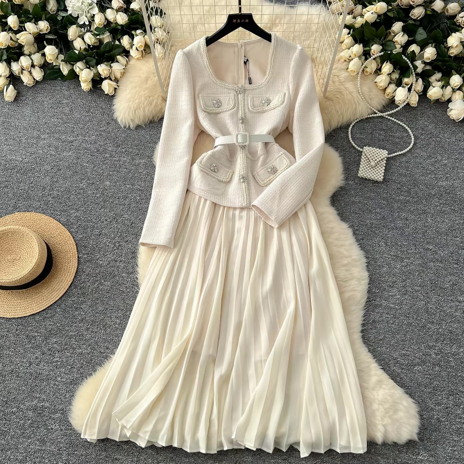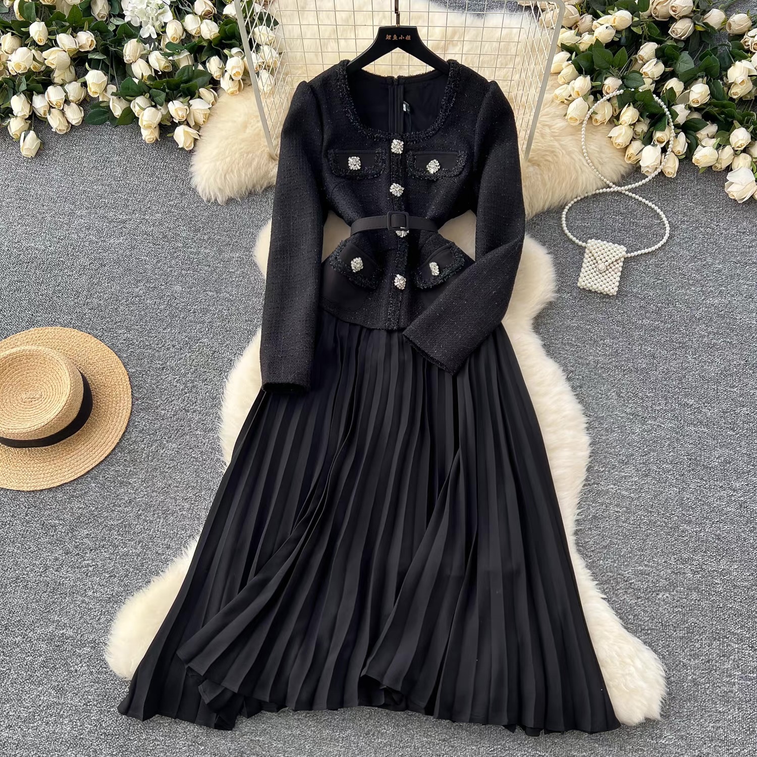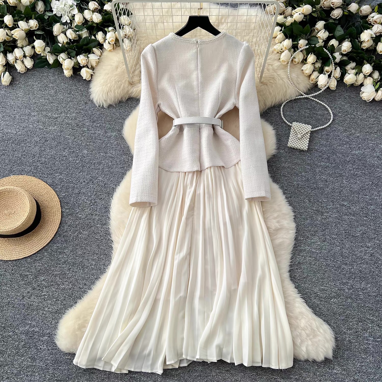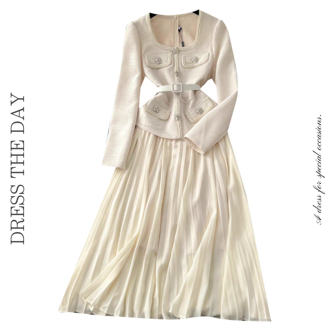 ビジュートリムベルトプリーツワンピース 2色展開 D0305
