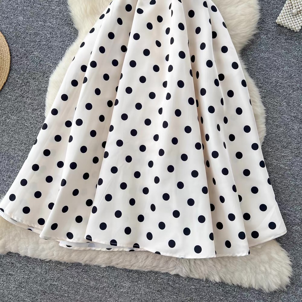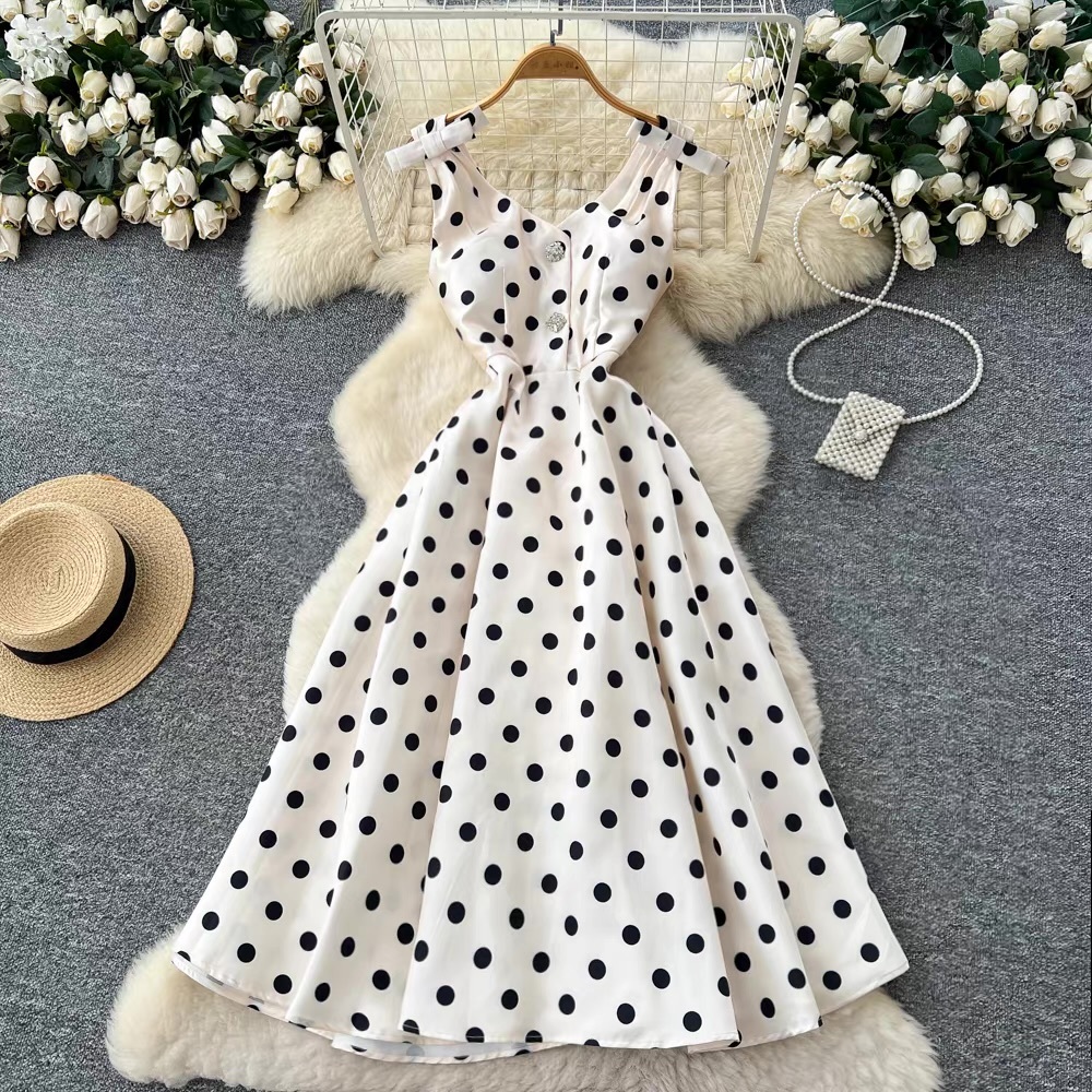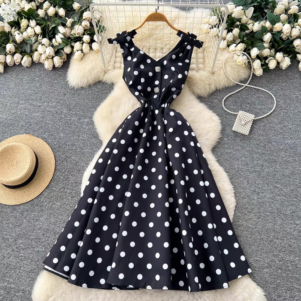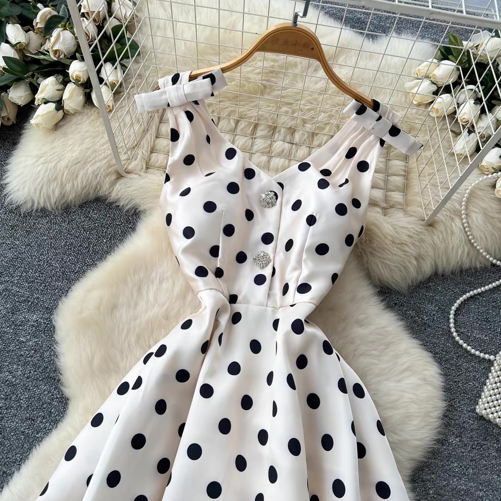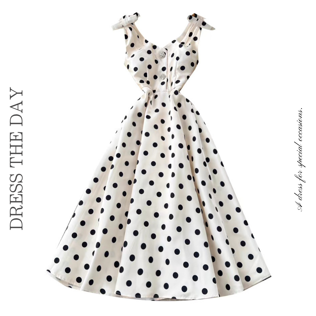 肩にあしらったリボンディテールとフロントの装飾ボタンが視線を集めるドット柄ドレス。ウエストで自然に絞られたラインから裾へ広がるシルエットが、全体をきれいに見せます。甘さのある柄にきらっとしたボタンが重なり、華やかさのある仕上がりです。